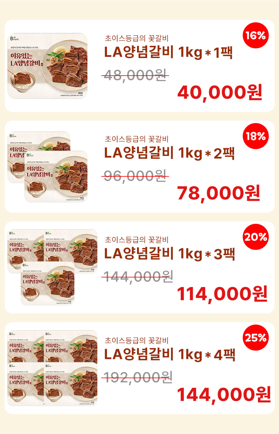 1. 🥩 Choice等级LA调味牛肋排 - 用水果嫩化,肉质鲜嫩多汁的优质牛肉 2. 🏭 HACCP认证卫生生产 - 严格品质管理,确保安全可靠的生产 3. 💸 数量优惠活动 - 1公斤包装,多买享最高25%折扣