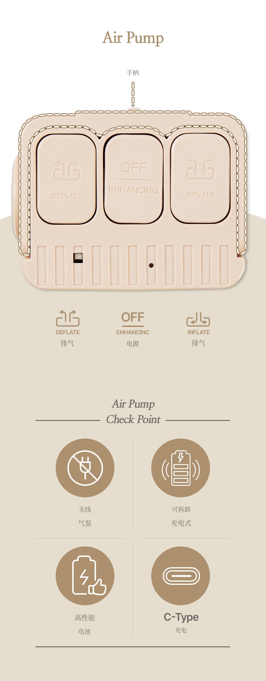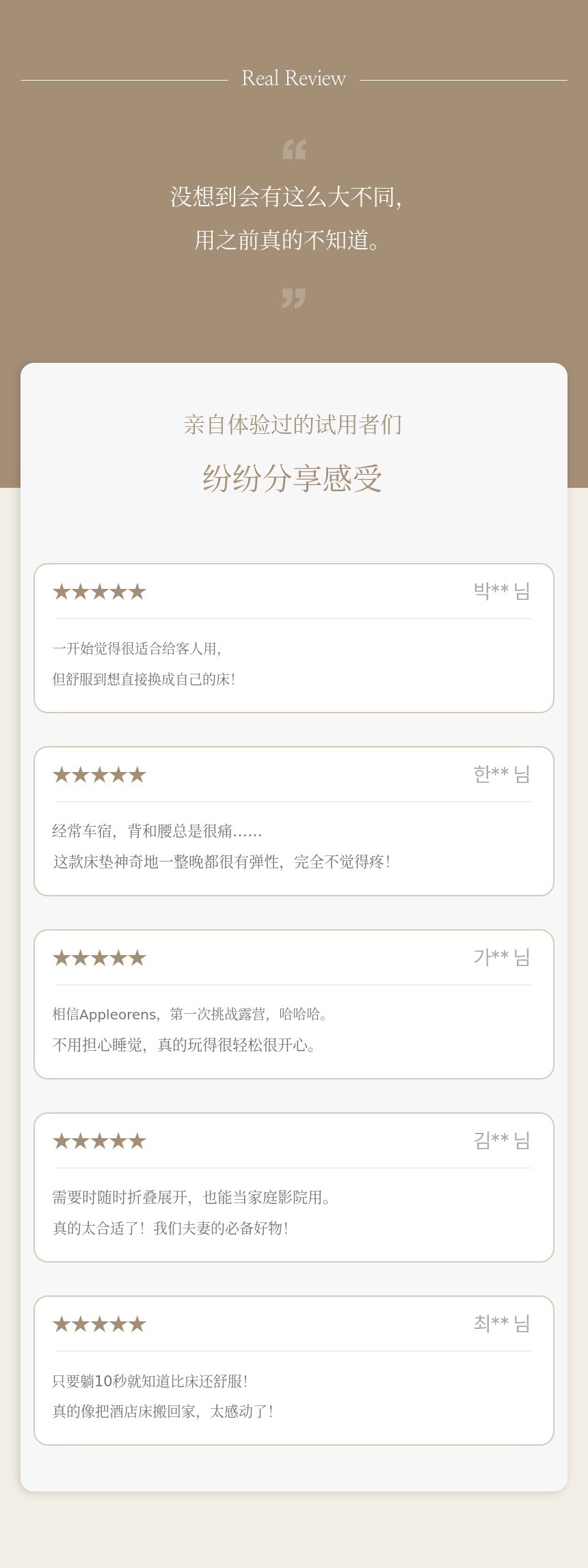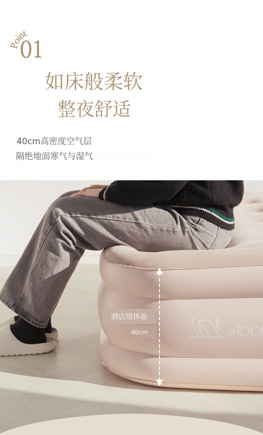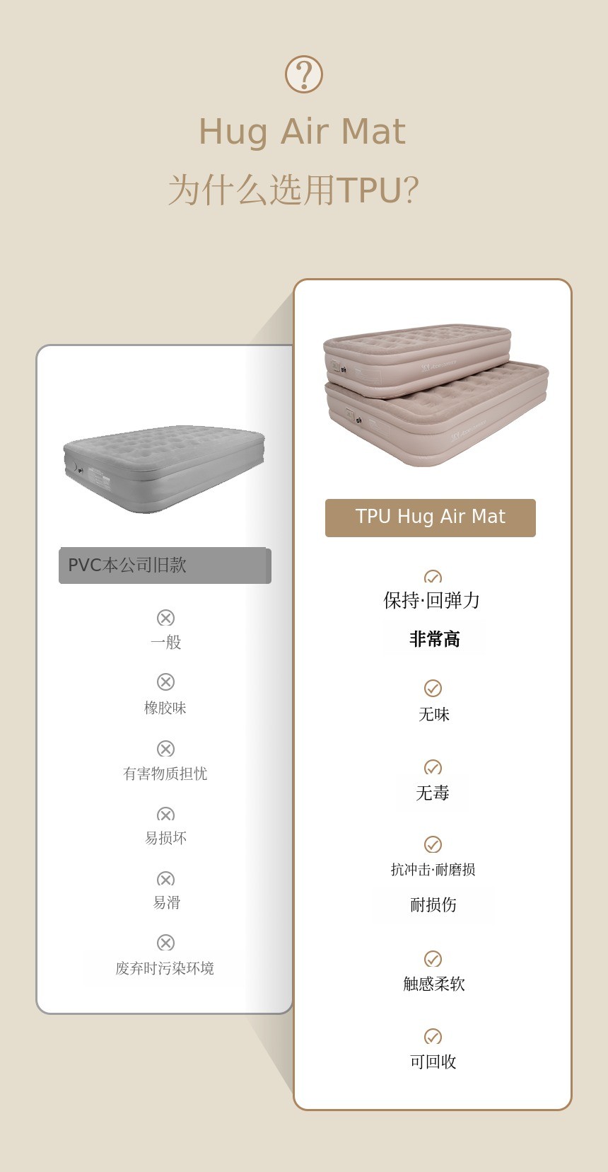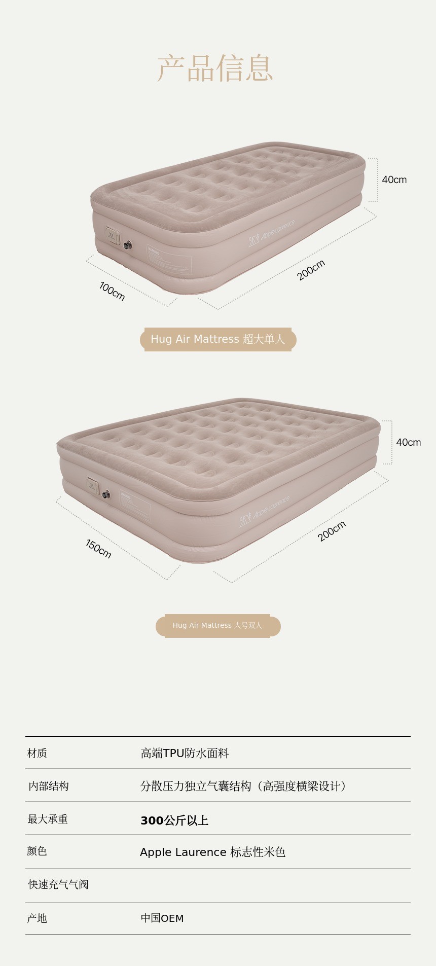 HUG充气床垫从一开始就以床为竞争对手进行开发,而不是传统的充气床垫。因此,直接采用了普通充气床垫无法实现的40cm高阶高度,躺下的瞬间就能像床一样保持稳定的姿势。此外,参考了床的体压分散结构,搭载了独立气囊系统,最大限度地减少了晃动和塌陷。再加上采用了解决了PVC气味、噪音、耐用性问题的TPU高端材质,带来了与传统充气床垫无法比拟的舒适体验。