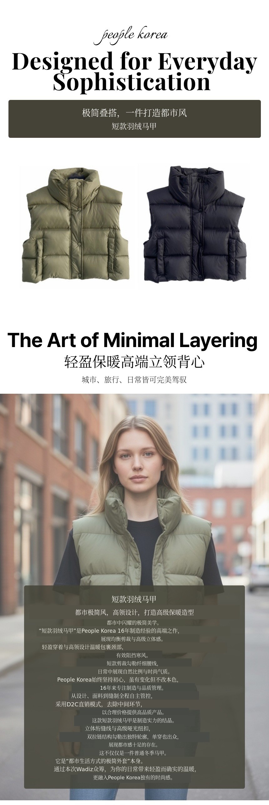 1. 🧥 高端立领短款羽绒背心 - 16年经验打造极简时尚冬季外套 2. ❄️ 轻盈保暖性能 - 采用优质填充和立领设计阻挡寒风 3. 🎁 Wadiz独家优惠价 - D2C模式提供高品质合理价格