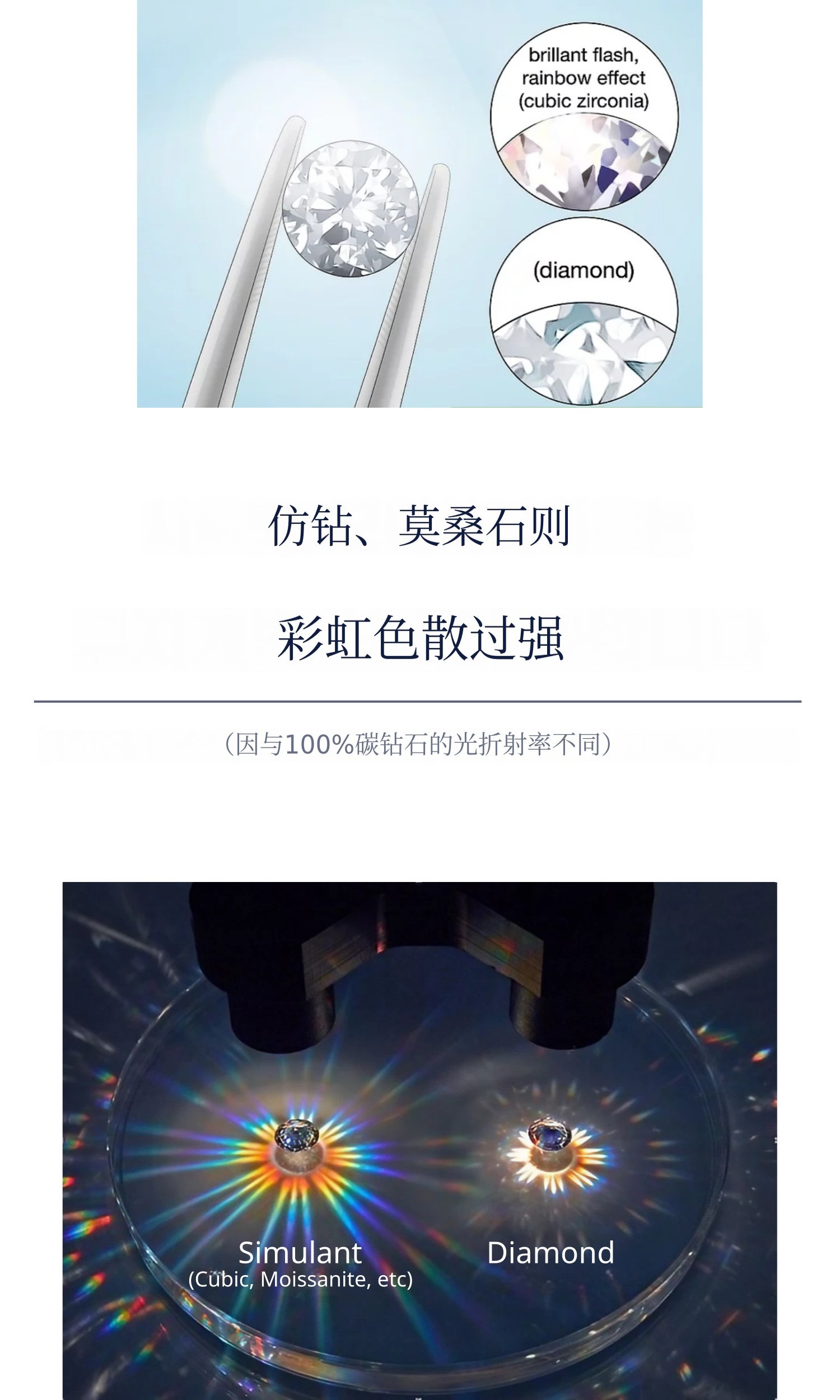 :莫桑石或仿钻也宣称有4C鉴定证书,但在肉眼观察的实际颜色中会显露出发黄或发蓝的色调