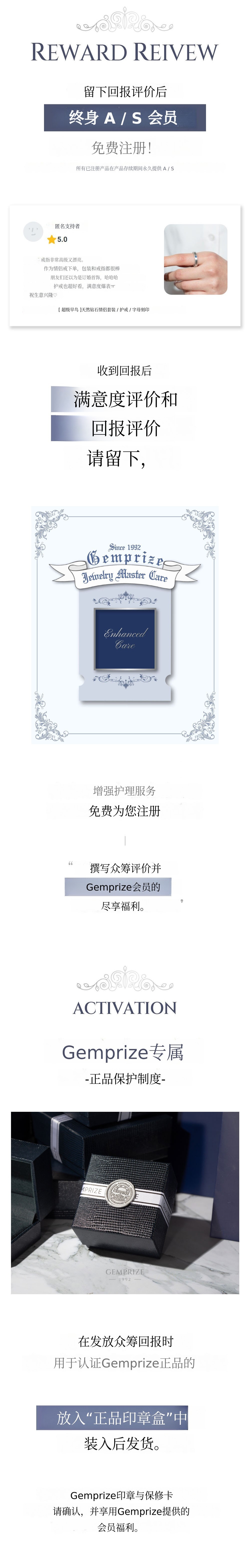 A. 我们提供 Gemprize 的终身保障保修服务——珠宝大师护理。仅限支持者,提供为期 5 年的支持者专属保修服务,包括戒围调整、宝石更换、重新电镀、划痕去除等。申请受理请通过 "Kakao 频道 进行。