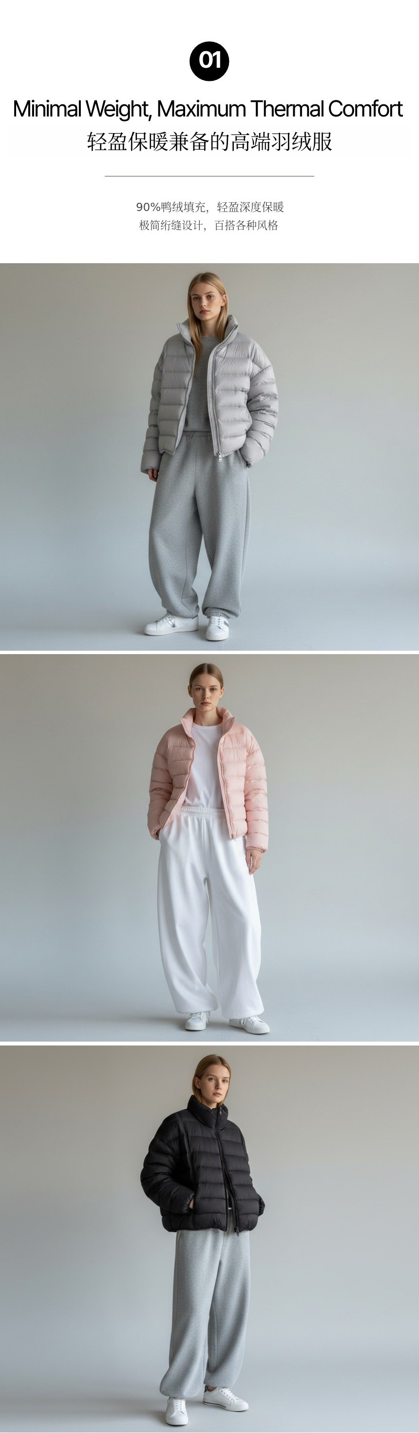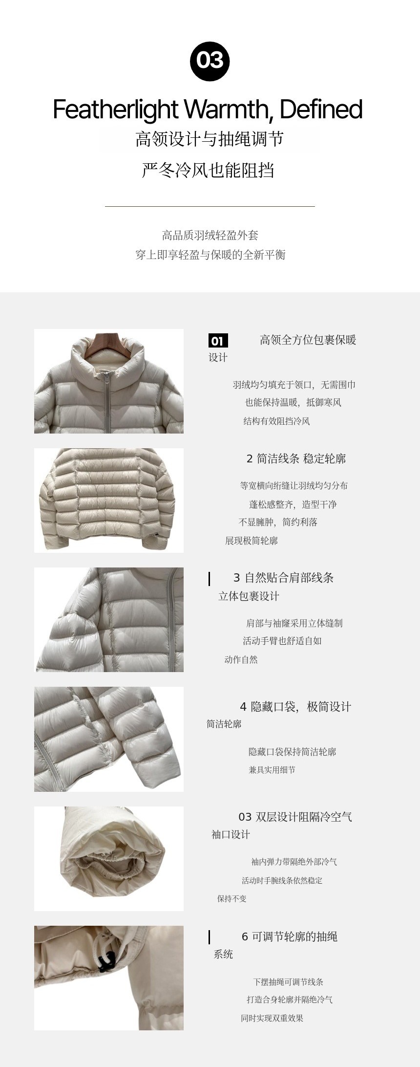 1. 🧥 高端轻量羽绒服 - 90%鸭绒轻盈保暖 2. ❄️ 提升保暖与活动性 - 高领设计,隐藏口袋实用 3. 🎁 多色自由尺码 - 多色选择,舒适合身
