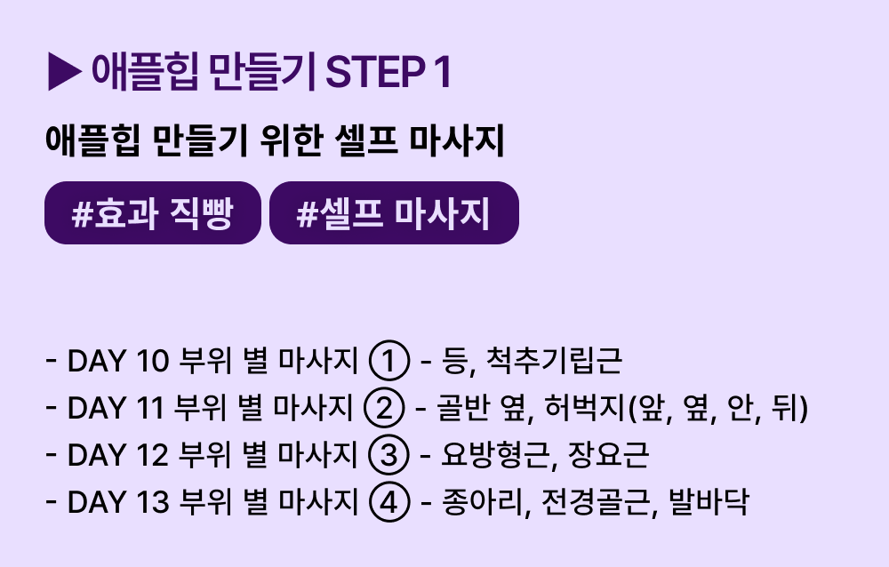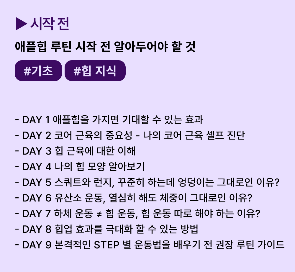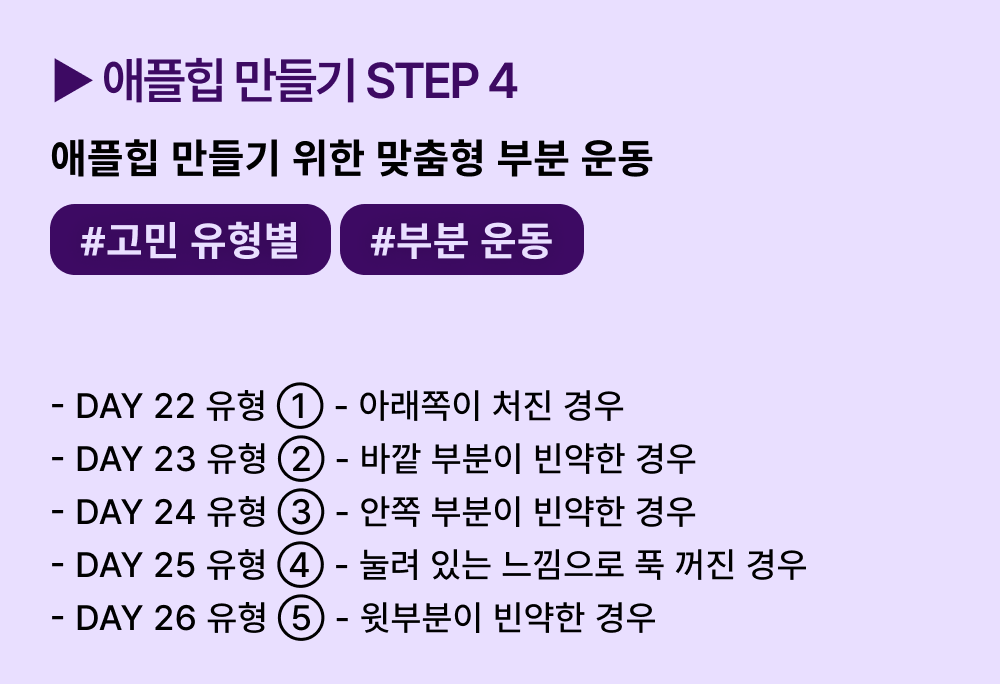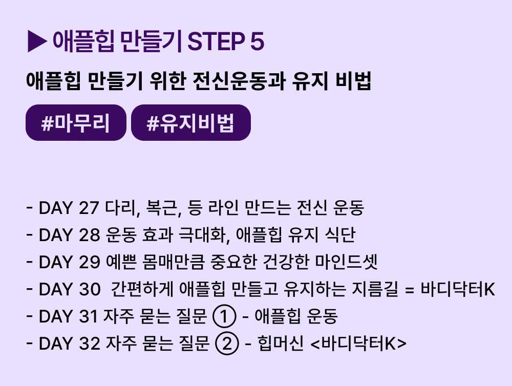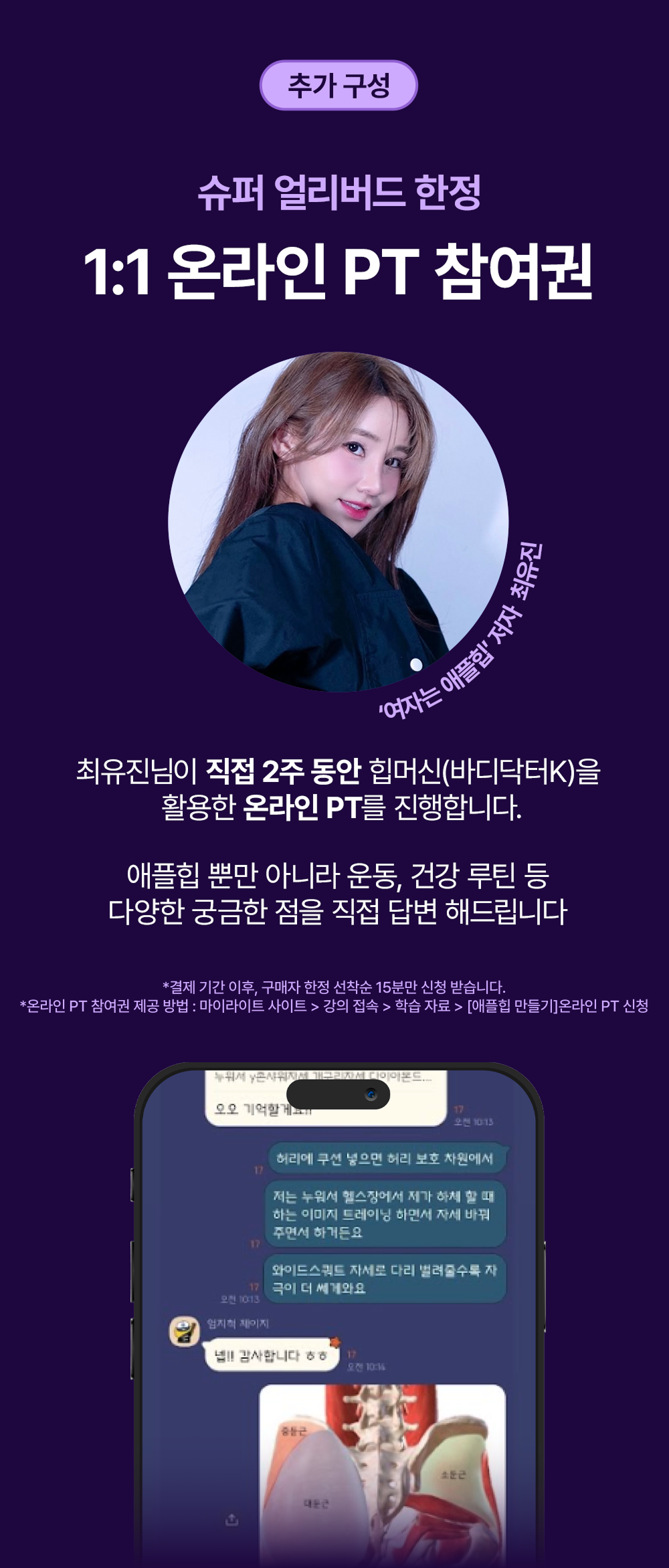 4. 온라인 1:1 PT : 강의 수강권을 발급 받으신 후, [강의 접속 > 학습 자료 > 애플힙 만들기 온라인 PT 신청]을 통해 신청 가능하십니다.