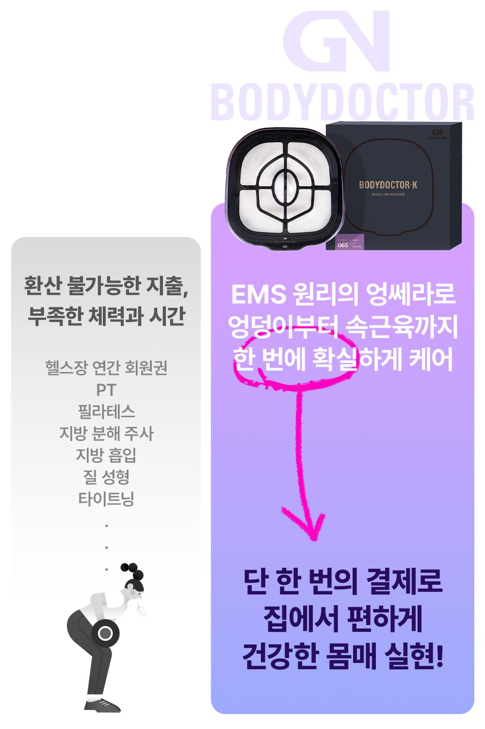 GN은 여기에 머물지 않았습니다. 수년간의 임상데이터와 고객 피드백을 기반으로 EMS 저주파, 인체공학적 설계, 최적의 프로그램 등을 결합해 2025년, 한층 진화된 ‘바디닥터K’를 선보였습니다.