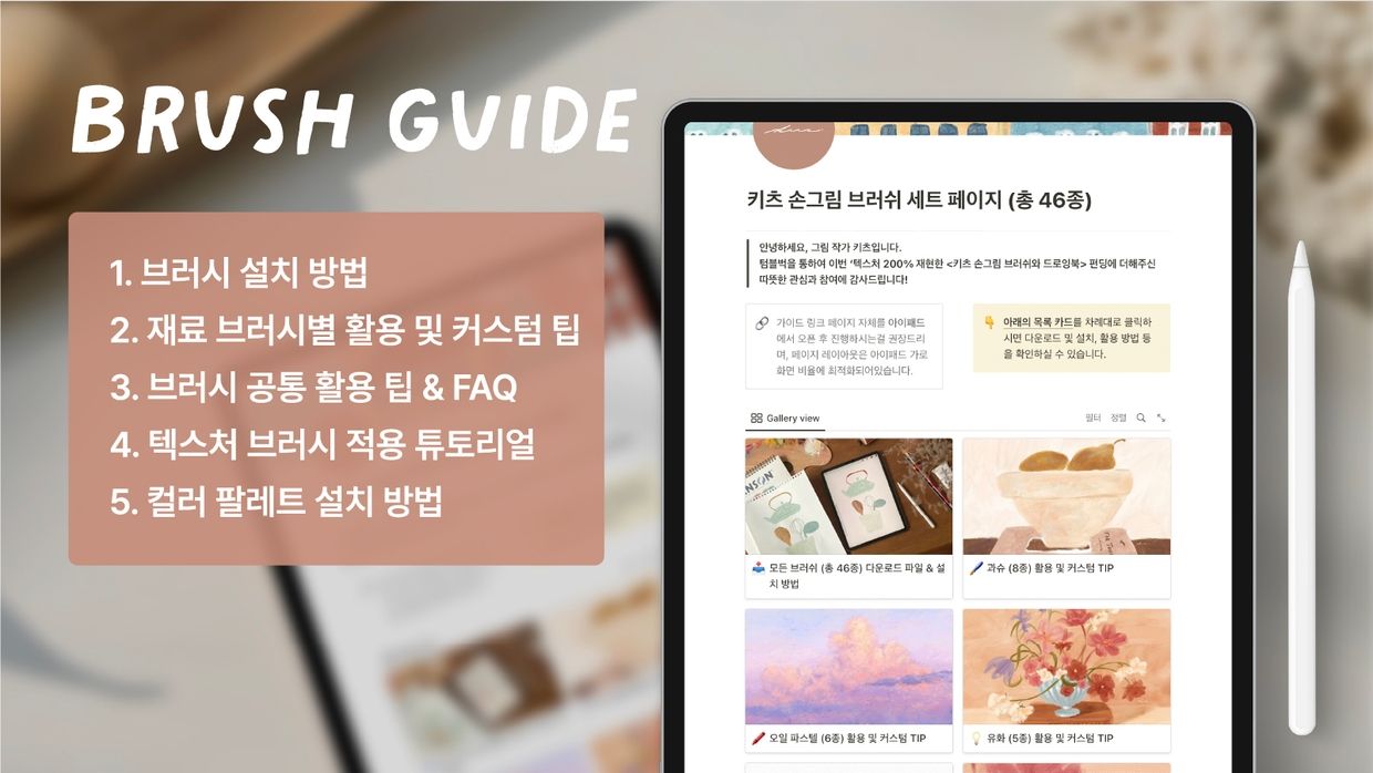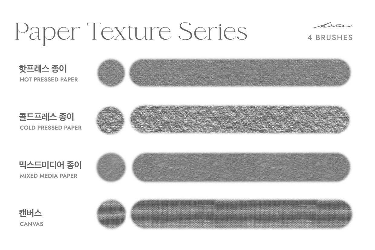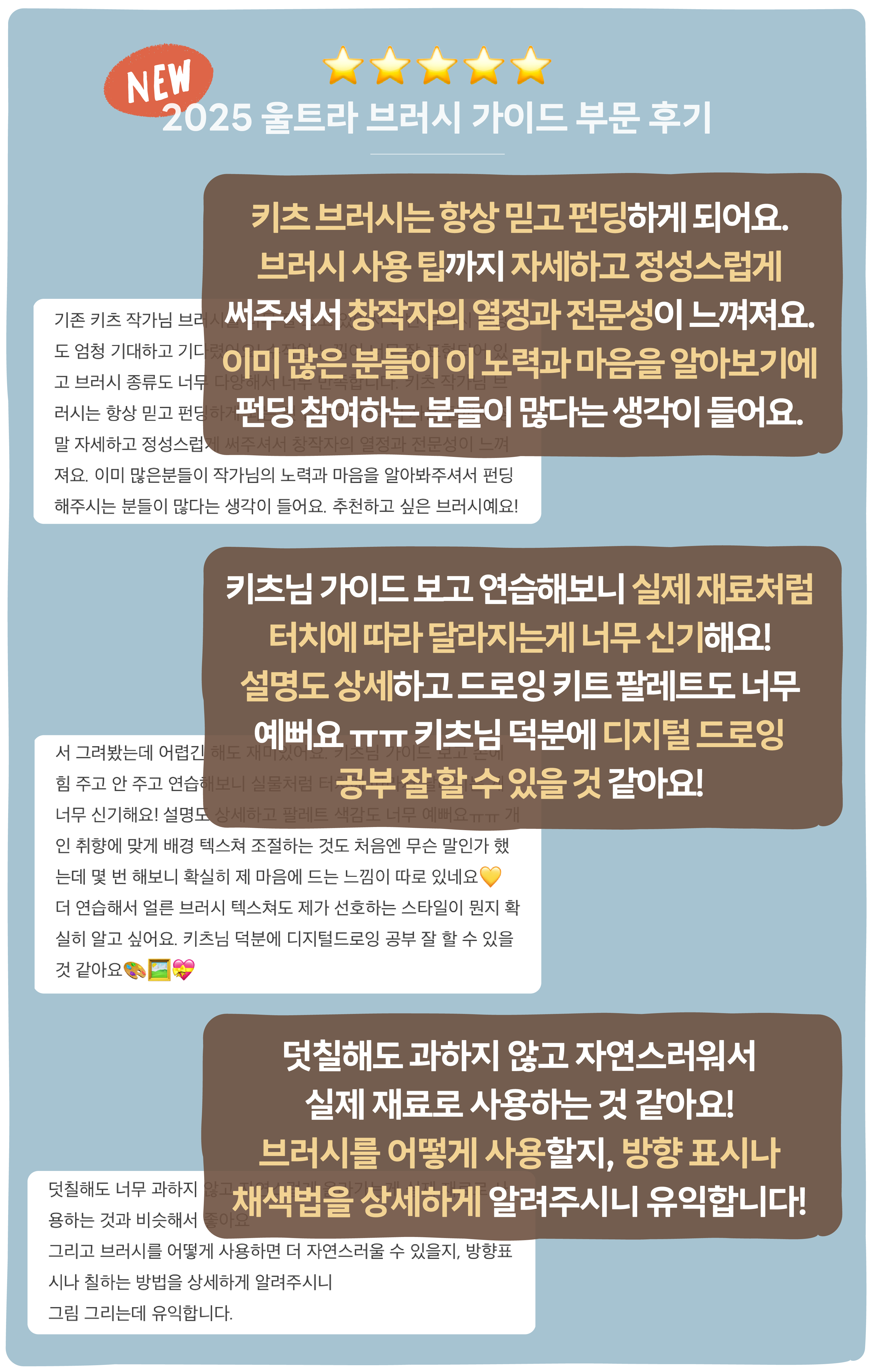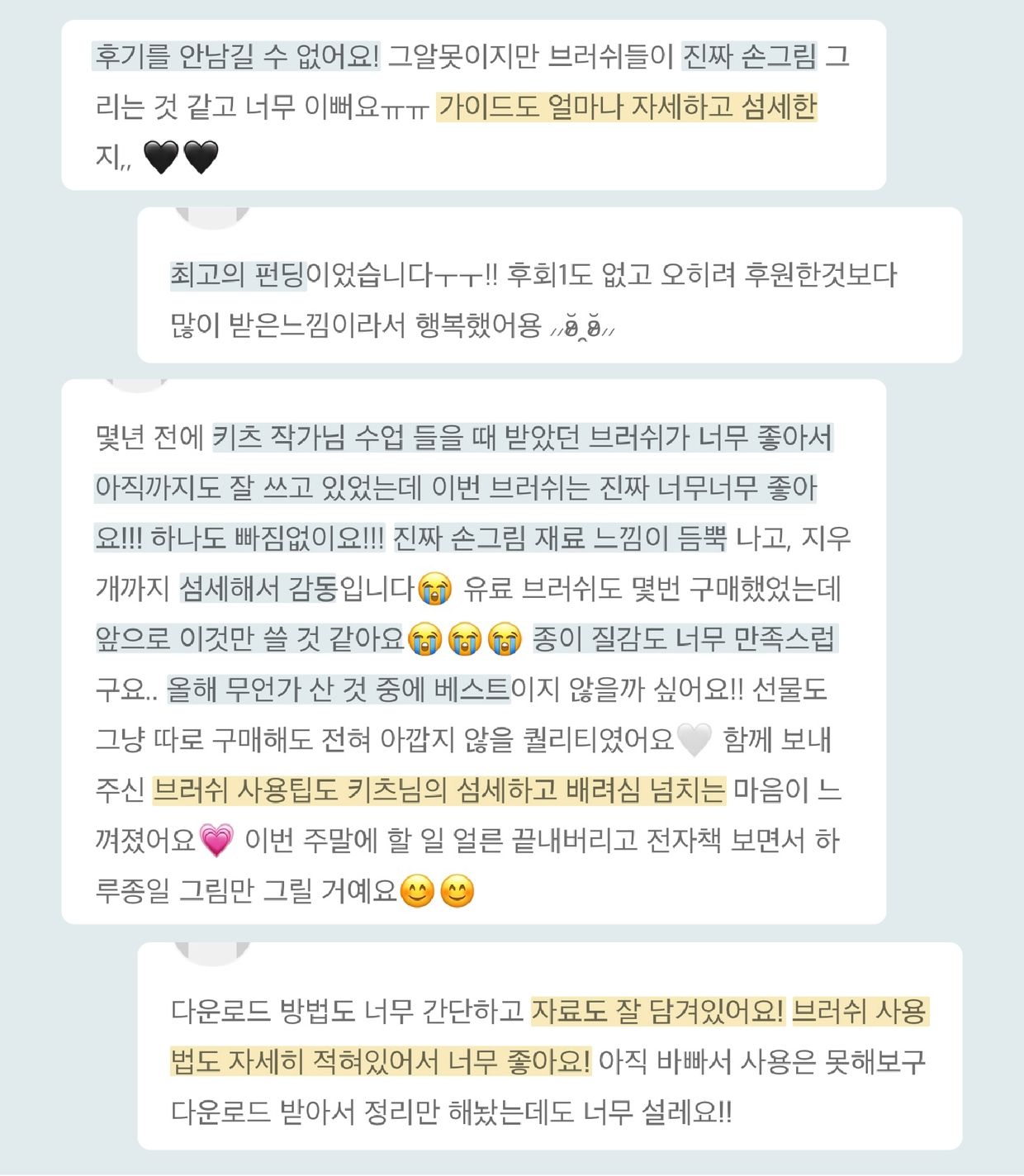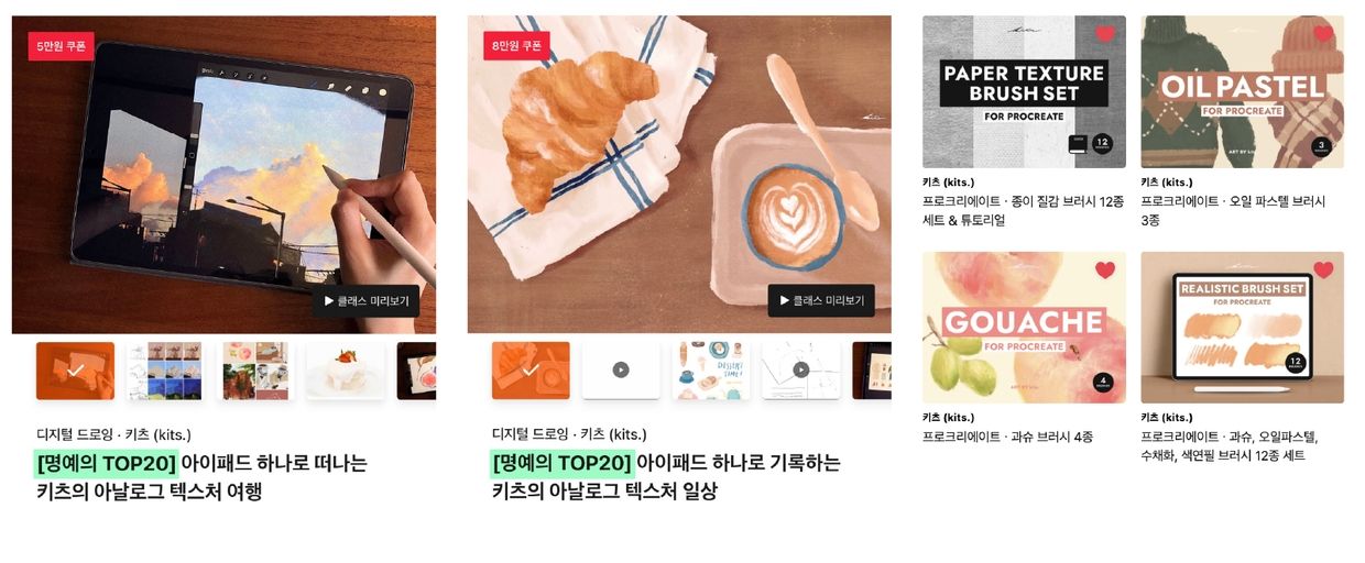 키츠 브러시는 지난 클래스101 TOP20 선정 이력의 아이패드 드로잉 '아날로그 텍스처' 시리즈 클래스들을 통해 2020년 1월부터 과슈, 오일 파스텔, 수채화, 색연필 등의 재료 및 종이 텍스처가 담긴 커스텀 브러시 세트를 제공드리며 시작되었습니다.