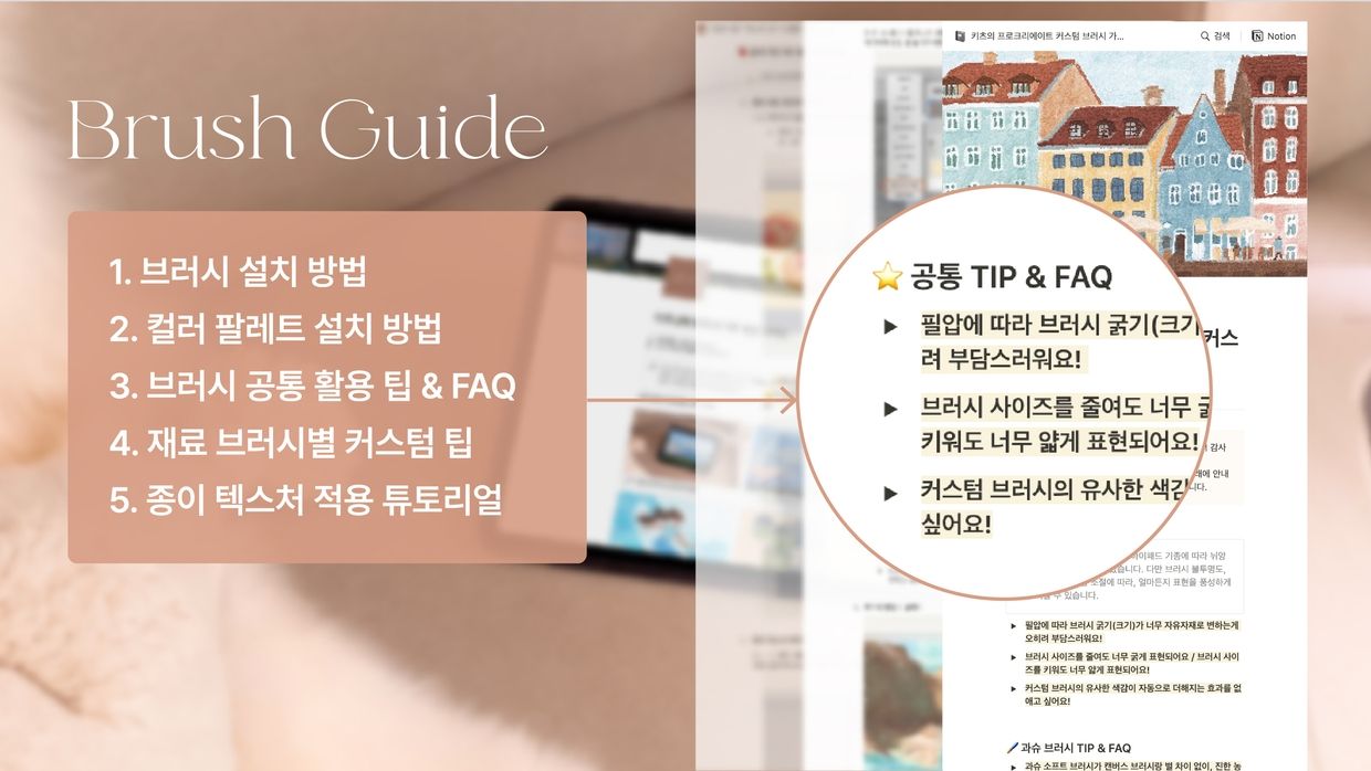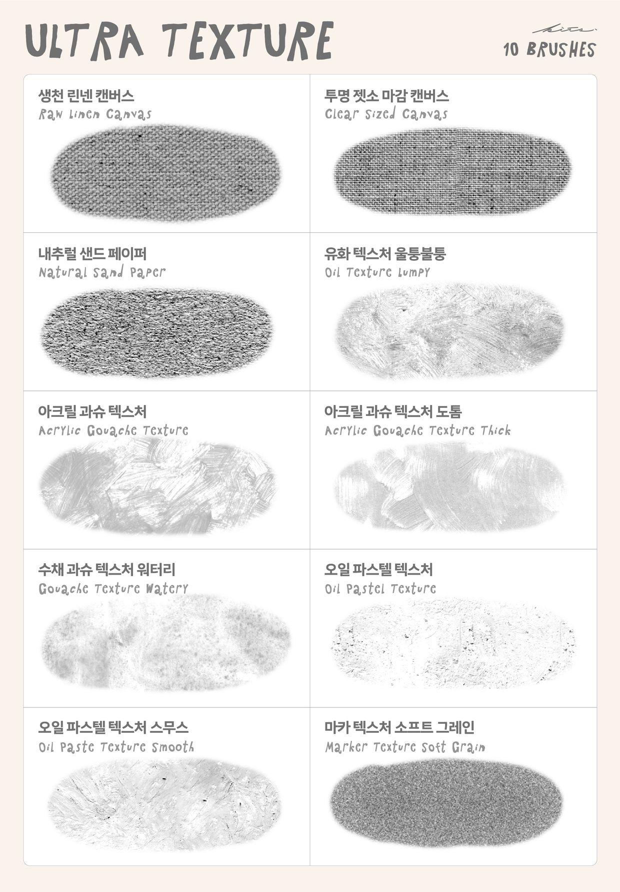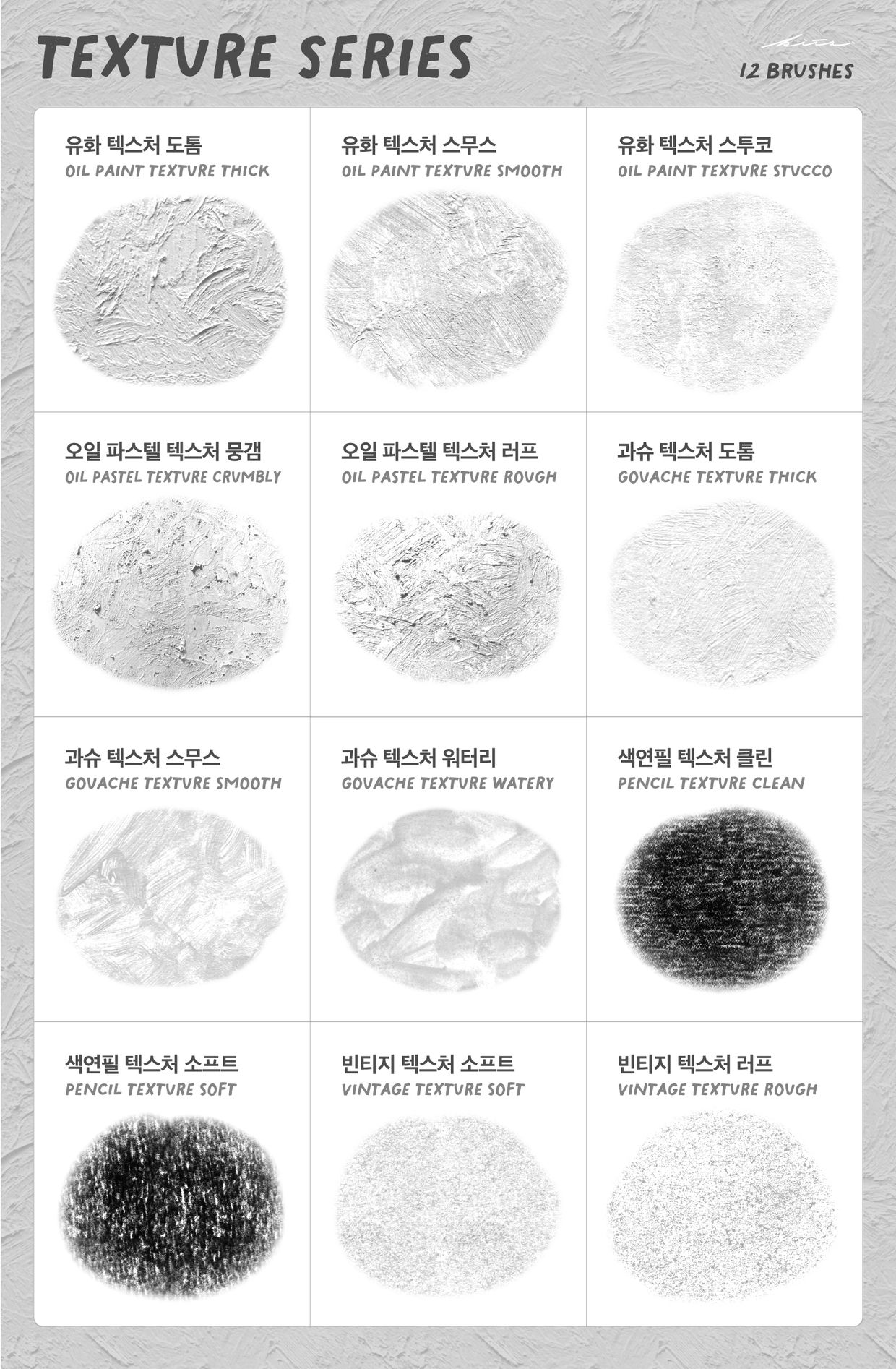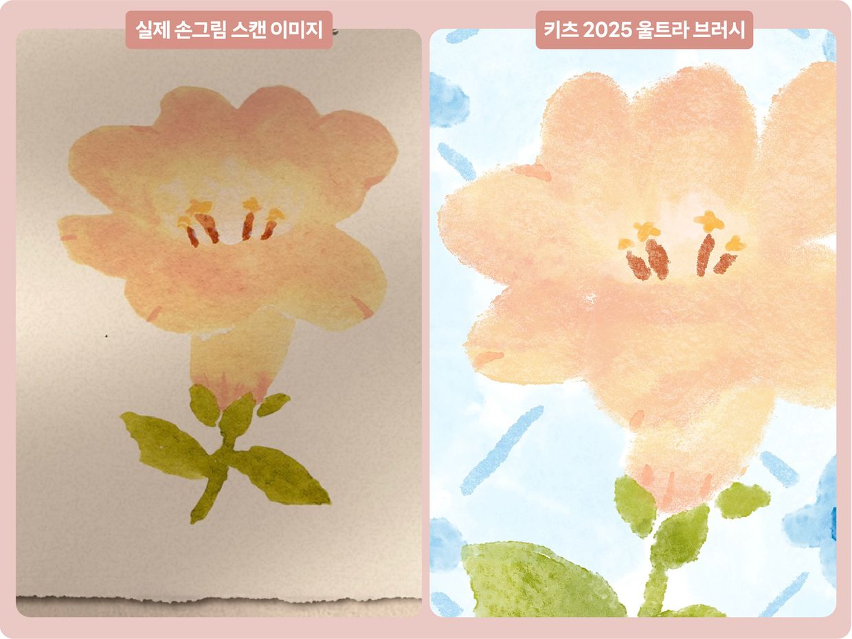 키츠 브러시는 지난 클래스101 TOP20 선정 이력의 아이패드 드로잉 '아날로그 텍스처' 시리즈 클래스들을 통해 2020년 1월부터 과슈, 오일 파스텔, 수채화, 색연필 등의 재료 및 종이 텍스처가 담긴 커스텀 브러시 세트를 제공드리며 시작되었습니다.