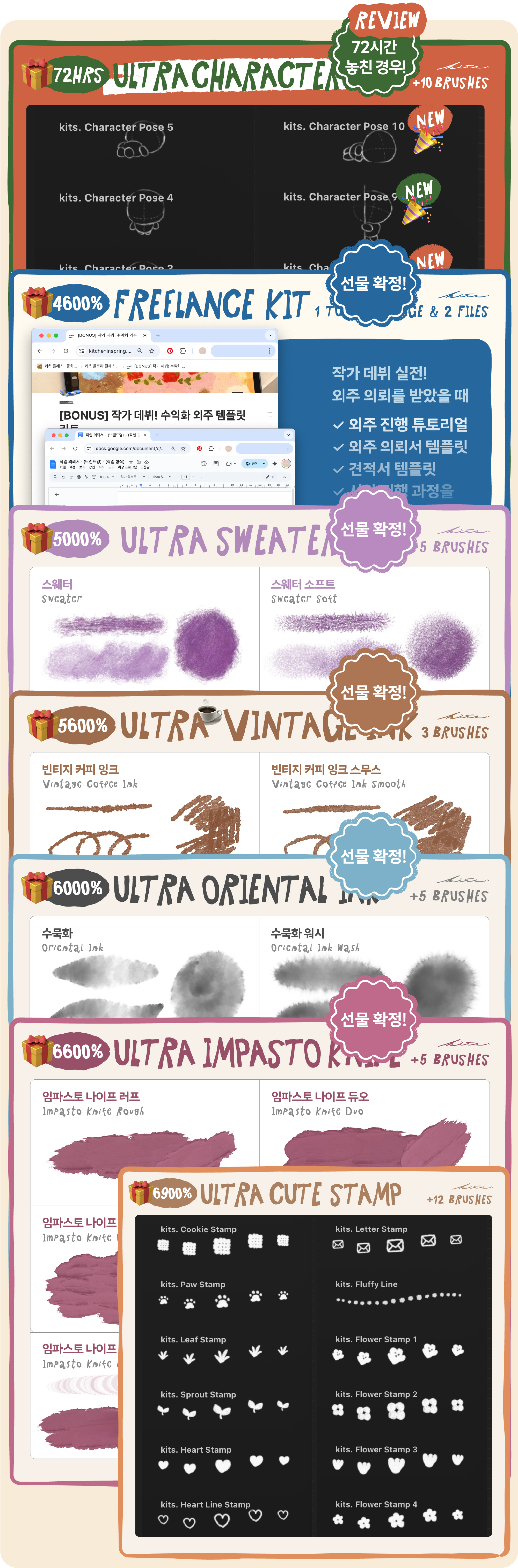 ⭐️ 다만 브러시는 상업용 라이센스를 포함하여 제공하기에, 키츠 브러시를 이용하여 상업적 아트워크를 마음껏 제작하실 수 있습니다.