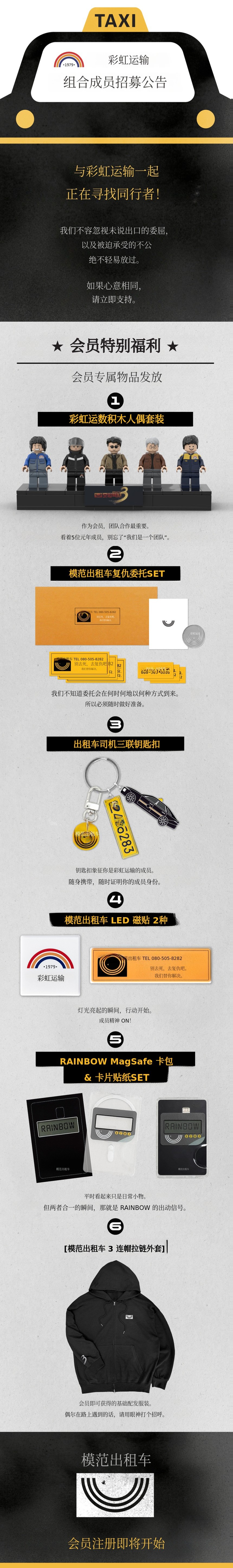 《模范出租车》令人热血沸腾的正义实现与酣畅淋漓的名场面 为了让难以忘怀这些瞬间的粉丝们,特将剧中的象征元素制作成可在日常中相伴的周边。本次项目仅在 Wadiz 独家进行,不仅止于普通周边,而是从企划阶段开始逐一精心准备,只为让大家能够长久珍藏电视剧带来的余韵。期待各位粉丝的热情支持与参与!