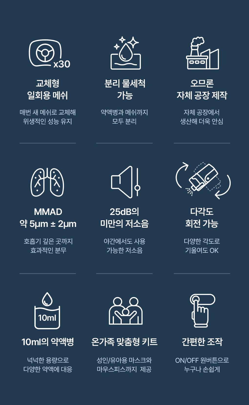 1. 👶 卫生型网状更换雾化器 - 一次性网状确保卫生使用 2. 💨 有效深肺药物传递 - 细微颗粒喷雾实现高效肺泡渗透 3. 🎁 家庭适用套装 - 含成人及儿童口罩