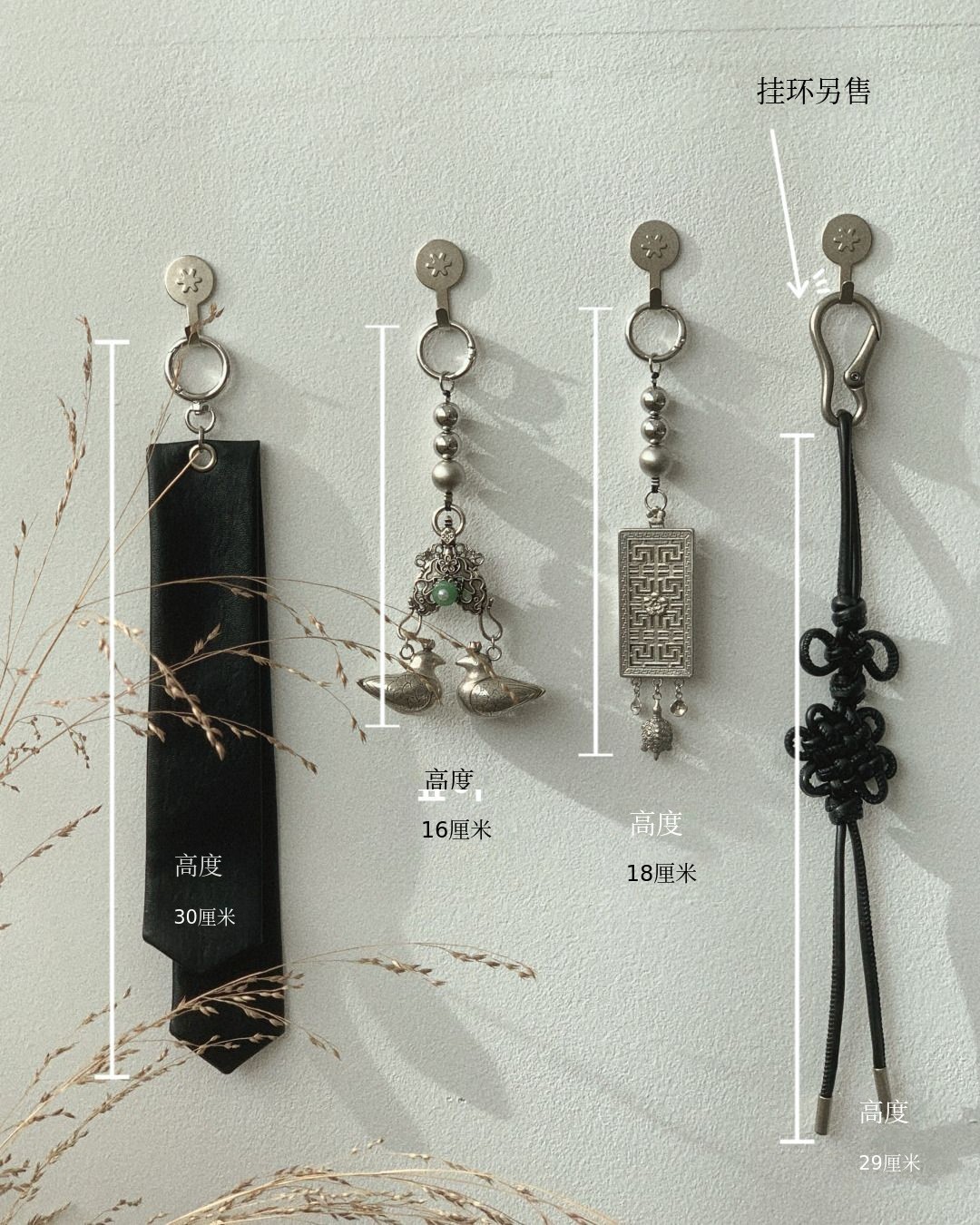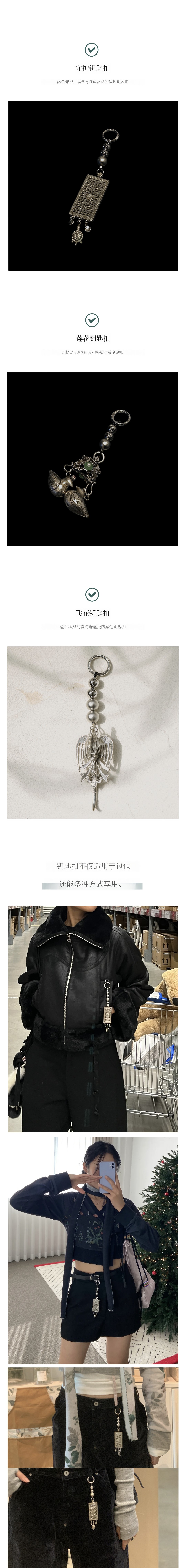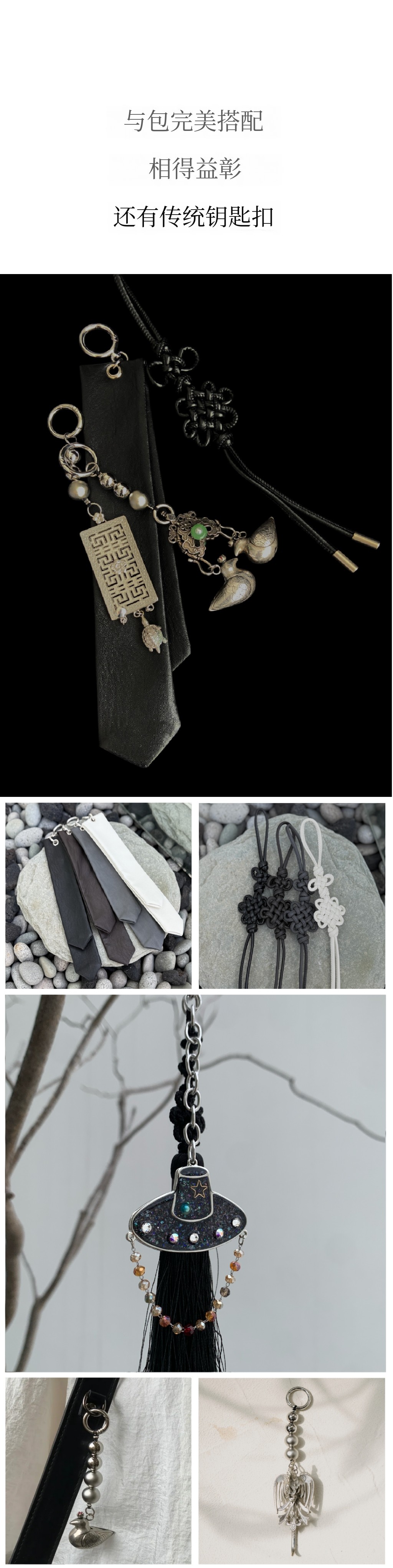 小淡发带、花蝶结 材质:素皮革(poly100)/ 软花、守护、初缘、飞花钥匙扣 材质:锡+CCB(珠)/ 珠结钥匙扣 材质:聚酯+亚克力 / 斗笠钥匙扣:树脂+金属
