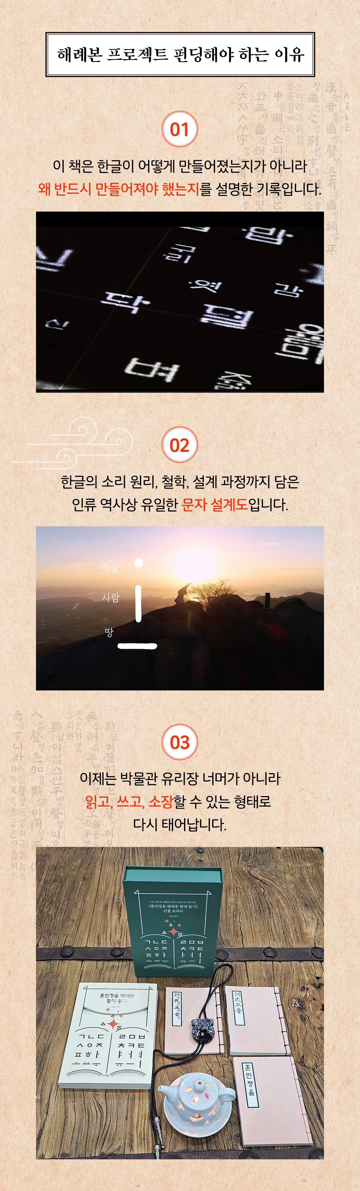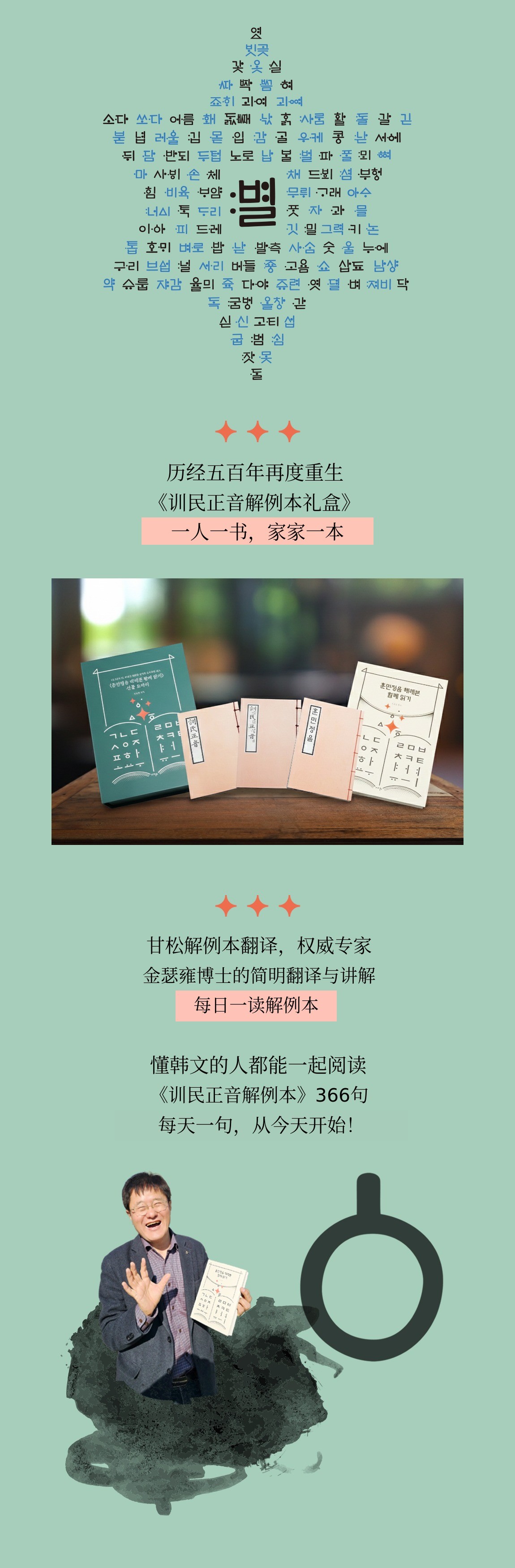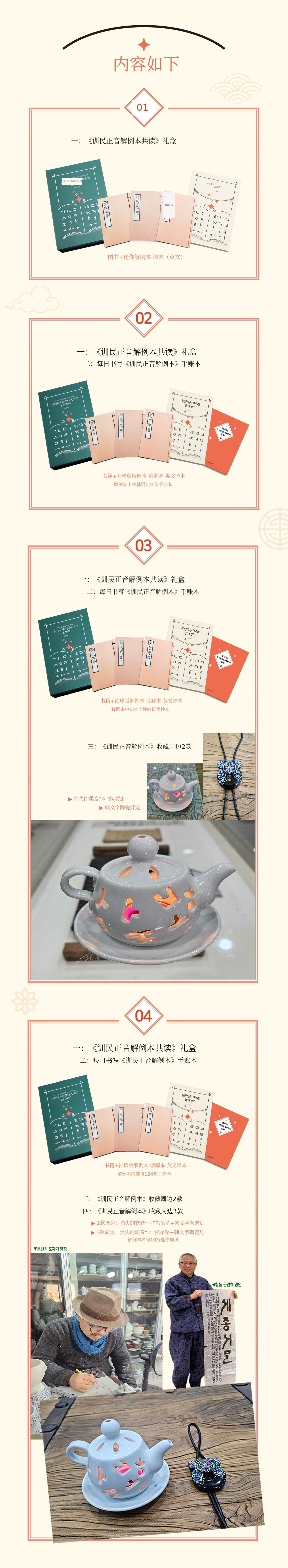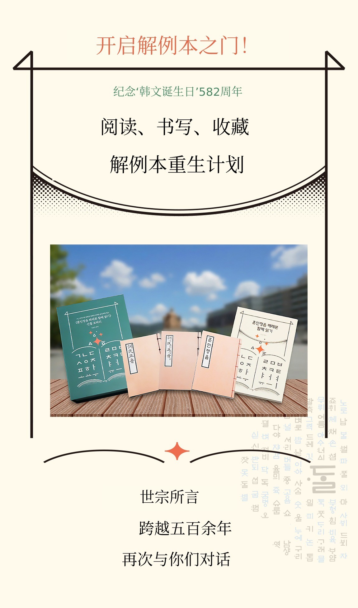 1. 📚 训民正音解例本套装 - 可阅读、书写和收藏的再生项目 2. 🎉 创制582周年纪念 - 重新诠释韩文的历史与哲学价值 3. 🎁 特别礼品组合 - 包含原文、翻译及便携书籍