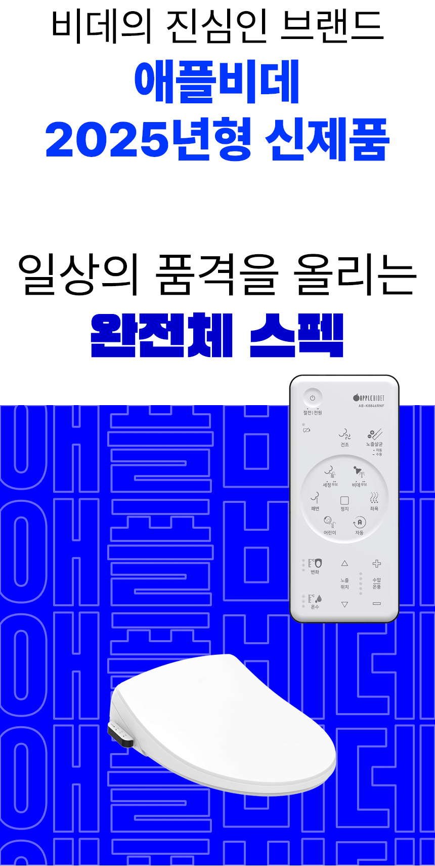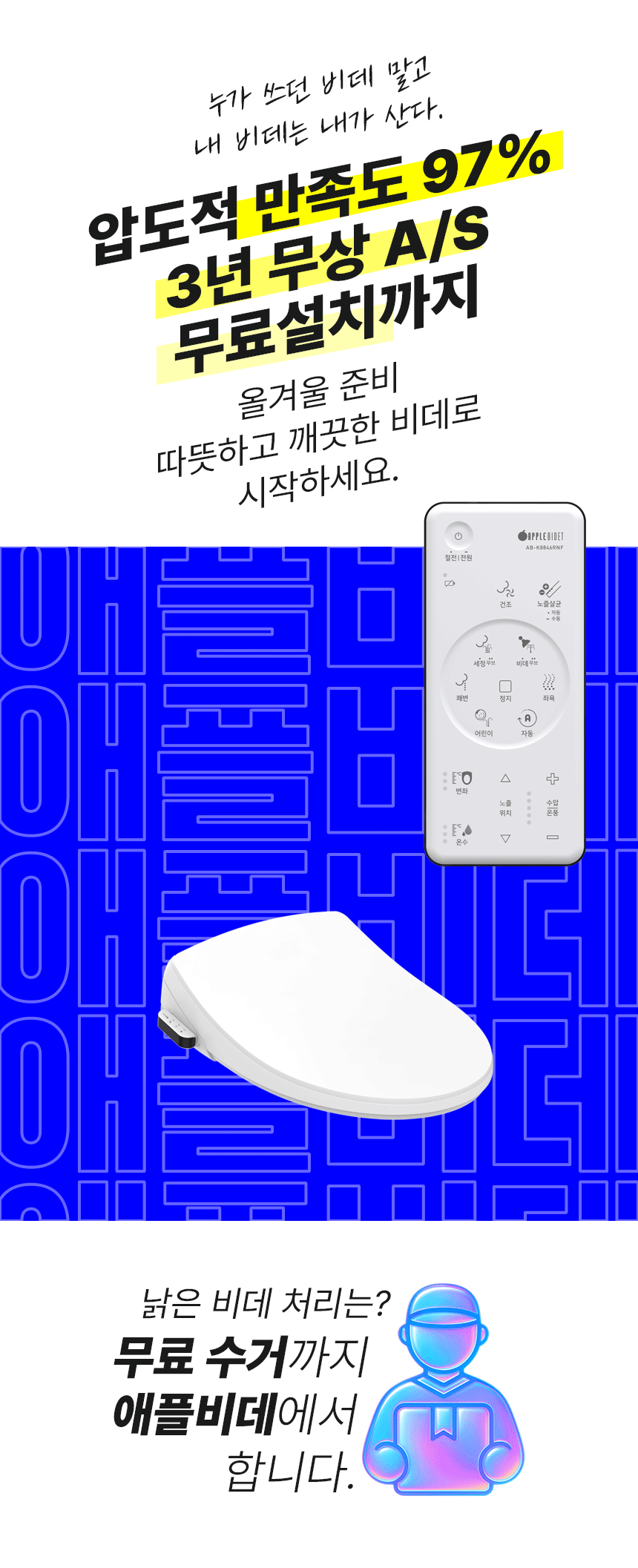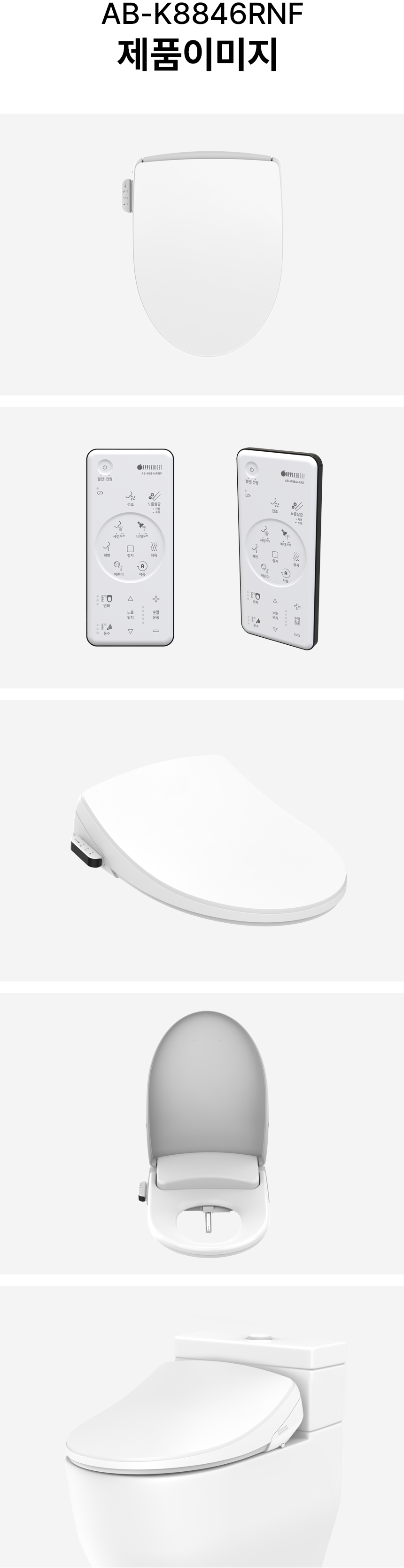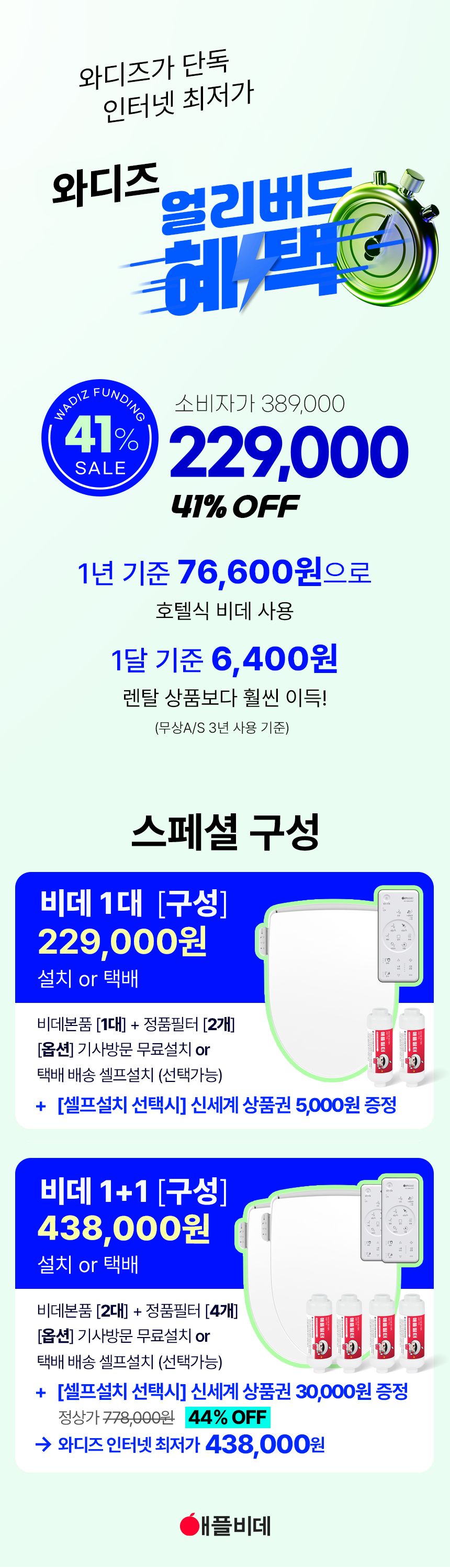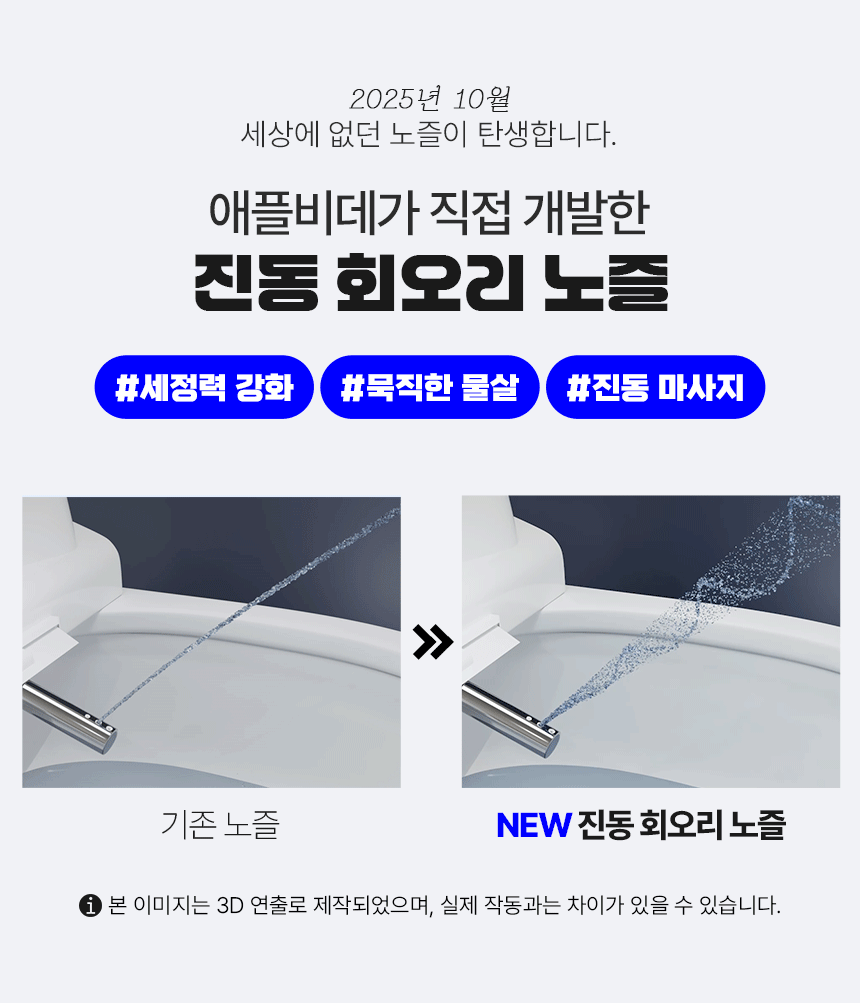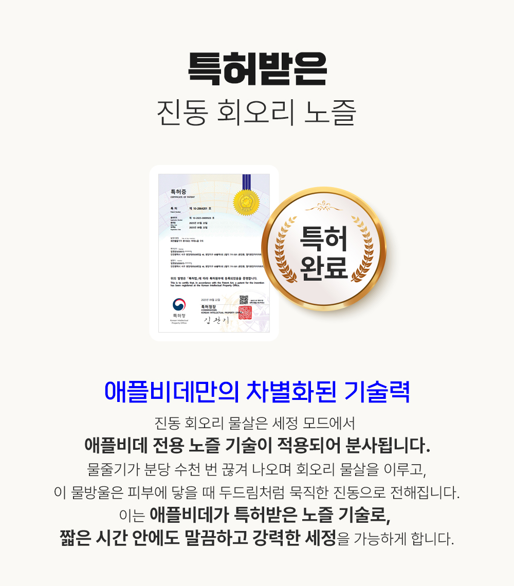 와디즈에서 첫 펀딩을 진행한 이후 많은 고객님들께서 사용리뷰로 편리함과 프리미엄급의 비데로 인정해 주셨습니다. 이번에 세상에 없는 진동회오리 노즐을 개발하여 와디즈 고객님들께 앵콜전으로 다시한번 선보입니다. 특허받은 진동 회오리 노즐을 장착한 호텔식 프리미엄급 직수 살균 리모컨 비데 AB-K8846RNF 모델은 출시전 애플비데를 장기간 이용해주신 고객님들의 체험과 테스트를 통해서 97%의 만족도를 받았고, 세정력 강화, 묵직한 물살,진동 마사지의 변화를 느끼실수 있습니다. 와디즈를 고객님들께도 애플비데만의 기술력을 선보이고자 프로젝트를 준비했습니다.대기업 브랜드는 아니지만, 기술력, 품질, 서비스로 인정받는 애플젠으로 더욱 성장해 가겠습니다.