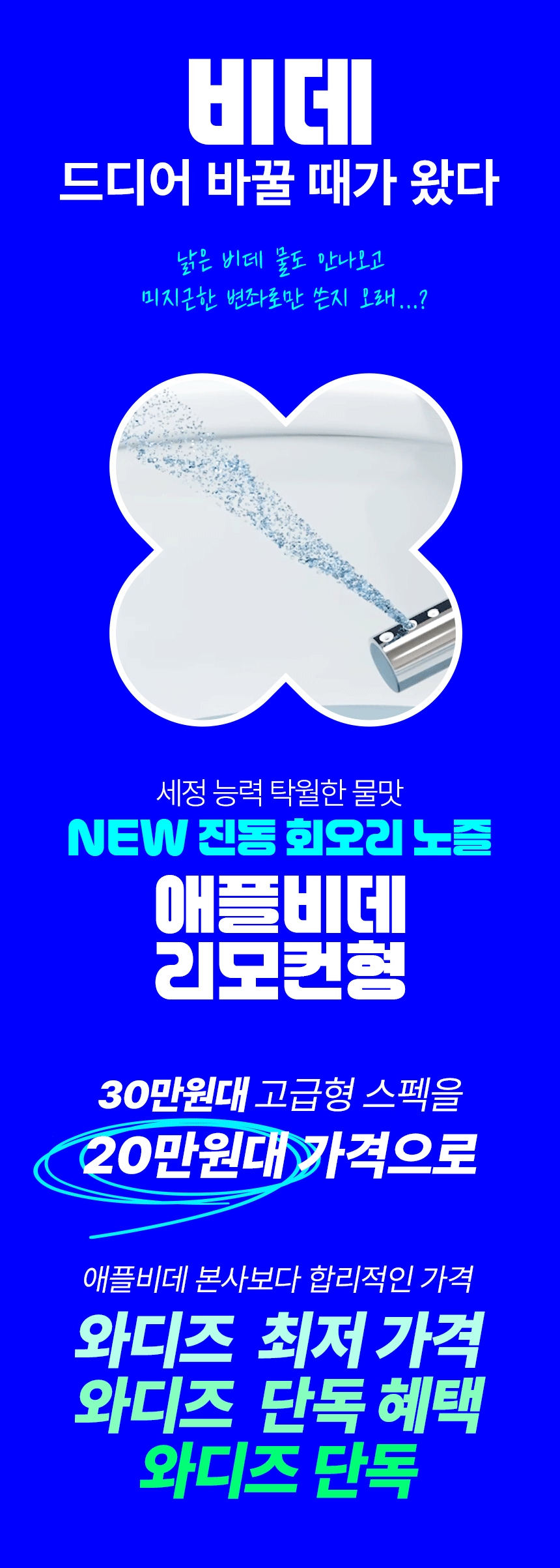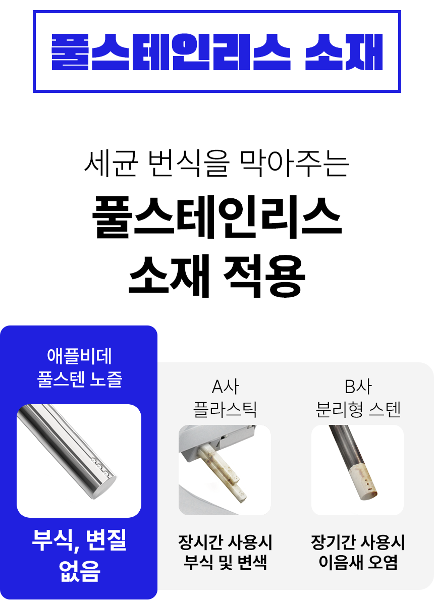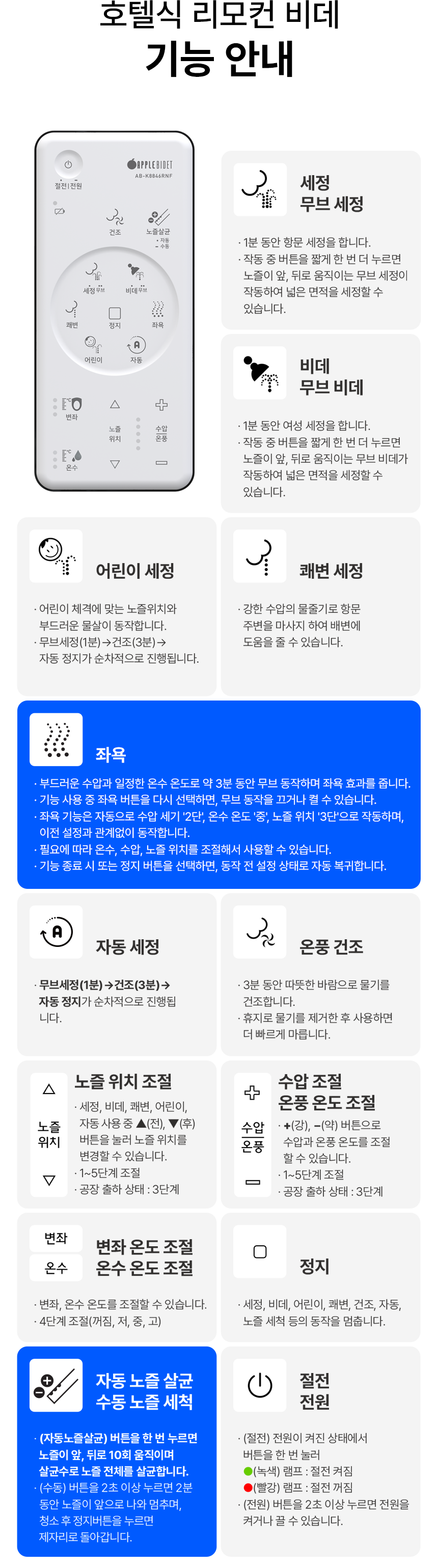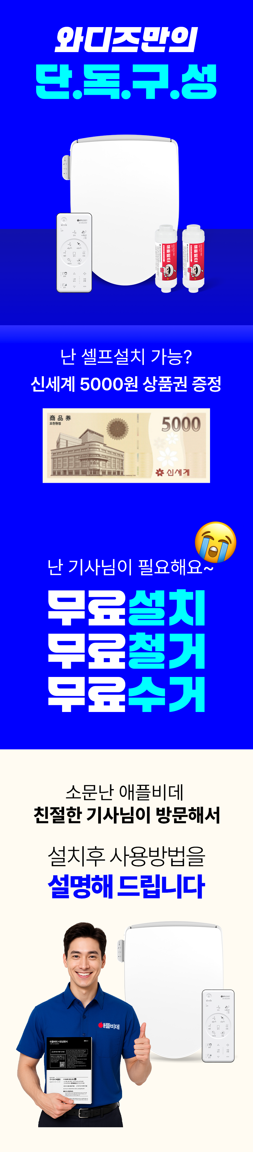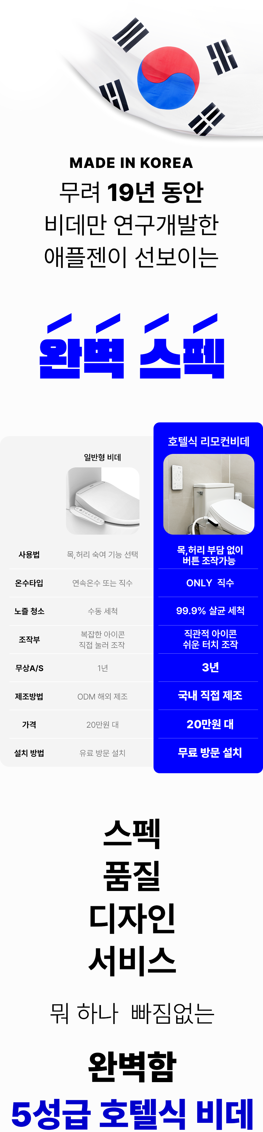 와디즈에서 첫 펀딩을 진행한 이후 많은 고객님들께서 사용리뷰로 편리함과 프리미엄급의 비데로 인정해 주셨습니다. 이번에 세상에 없는 진동회오리 노즐을 개발하여 와디즈 고객님들께 앵콜전으로 다시한번 선보입니다. 특허받은 진동 회오리 노즐을 장착한 호텔식 프리미엄급 직수 살균 리모컨 비데 AB-K8846RNF 모델은 출시전 애플비데를 장기간 이용해주신 고객님들의 체험과 테스트를 통해서 97%의 만족도를 받았고, 세정력 강화, 묵직한 물살,진동 마사지의 변화를 느끼실수 있습니다. 와디즈를 고객님들께도 애플비데만의 기술력을 선보이고자 프로젝트를 준비했습니다.대기업 브랜드는 아니지만, 기술력, 품질, 서비스로 인정받는 애플젠으로 더욱 성장해 가겠습니다.