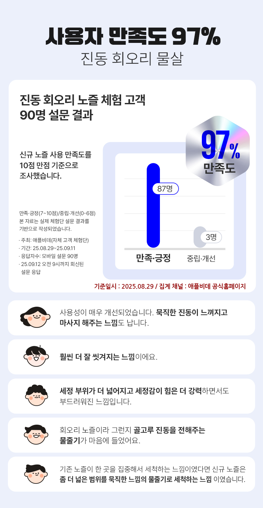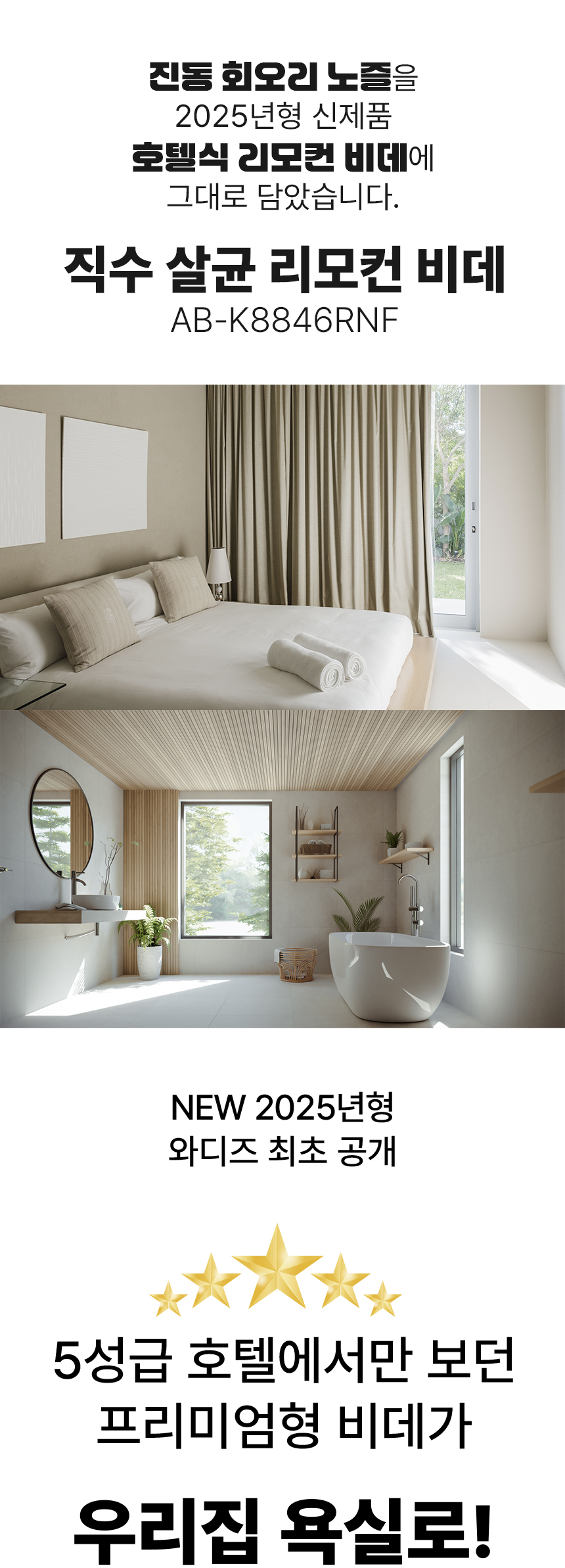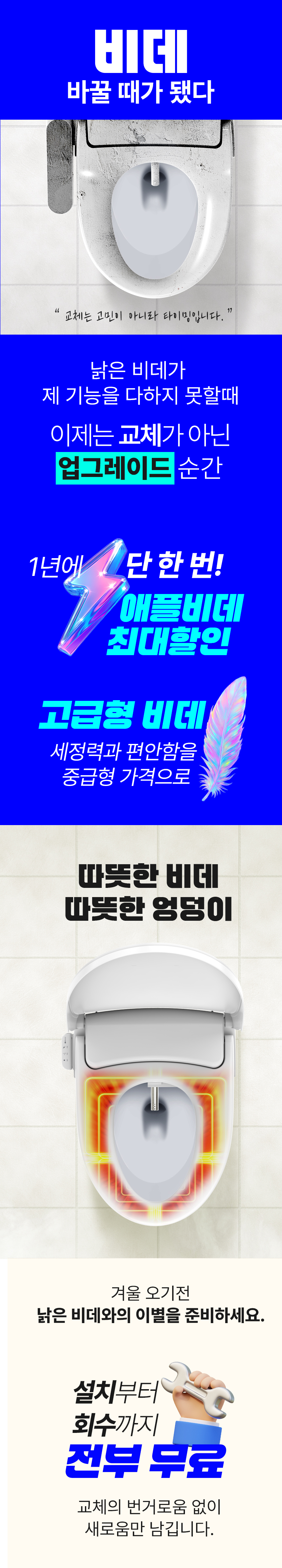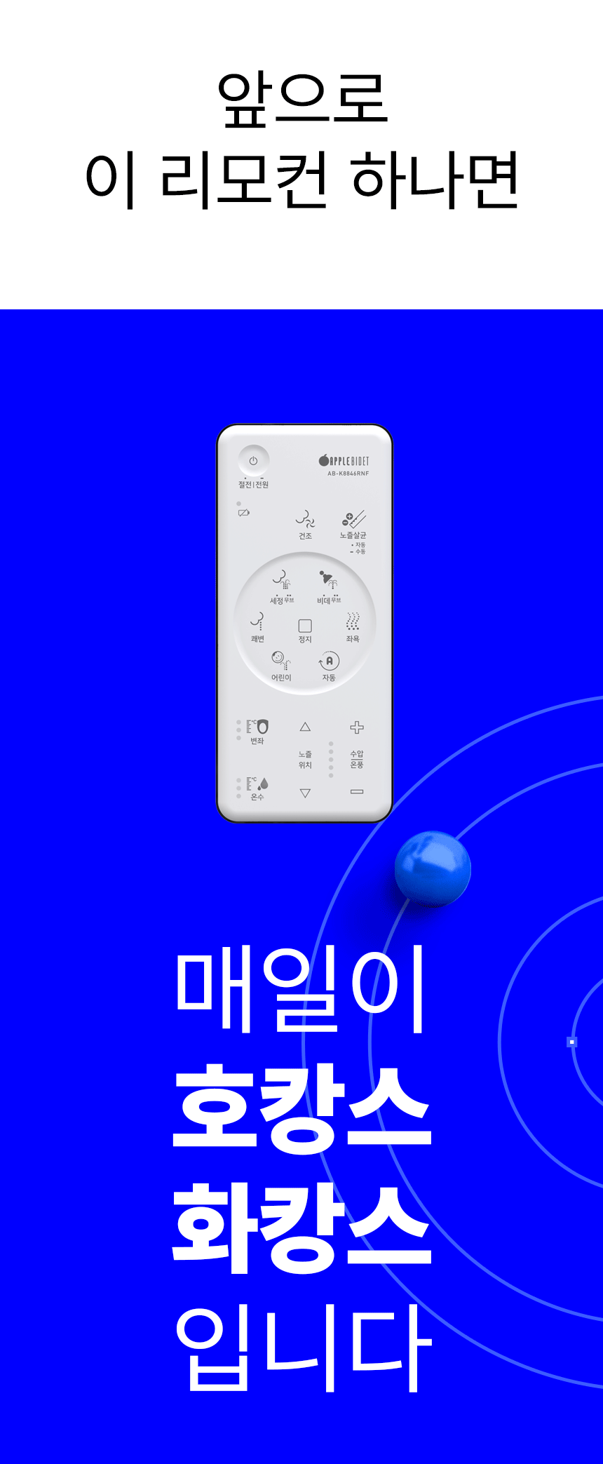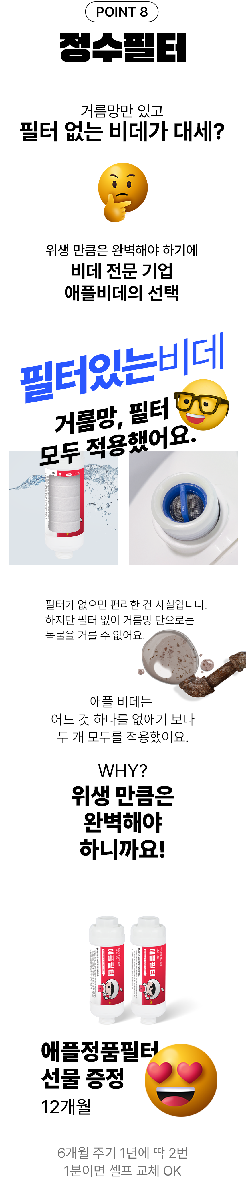 와디즈에서 첫 펀딩을 진행한 이후 많은 고객님들께서 사용리뷰로 편리함과 프리미엄급의 비데로 인정해 주셨습니다. 이번에 세상에 없는 진동회오리 노즐을 개발하여 와디즈 고객님들께 앵콜전으로 다시한번 선보입니다. 특허받은 진동 회오리 노즐을 장착한 호텔식 프리미엄급 직수 살균 리모컨 비데 AB-K8846RNF 모델은 출시전 애플비데를 장기간 이용해주신 고객님들의 체험과 테스트를 통해서 97%의 만족도를 받았고, 세정력 강화, 묵직한 물살,진동 마사지의 변화를 느끼실수 있습니다. 와디즈를 고객님들께도 애플비데만의 기술력을 선보이고자 프로젝트를 준비했습니다.대기업 브랜드는 아니지만, 기술력, 품질, 서비스로 인정받는 애플젠으로 더욱 성장해 가겠습니다.