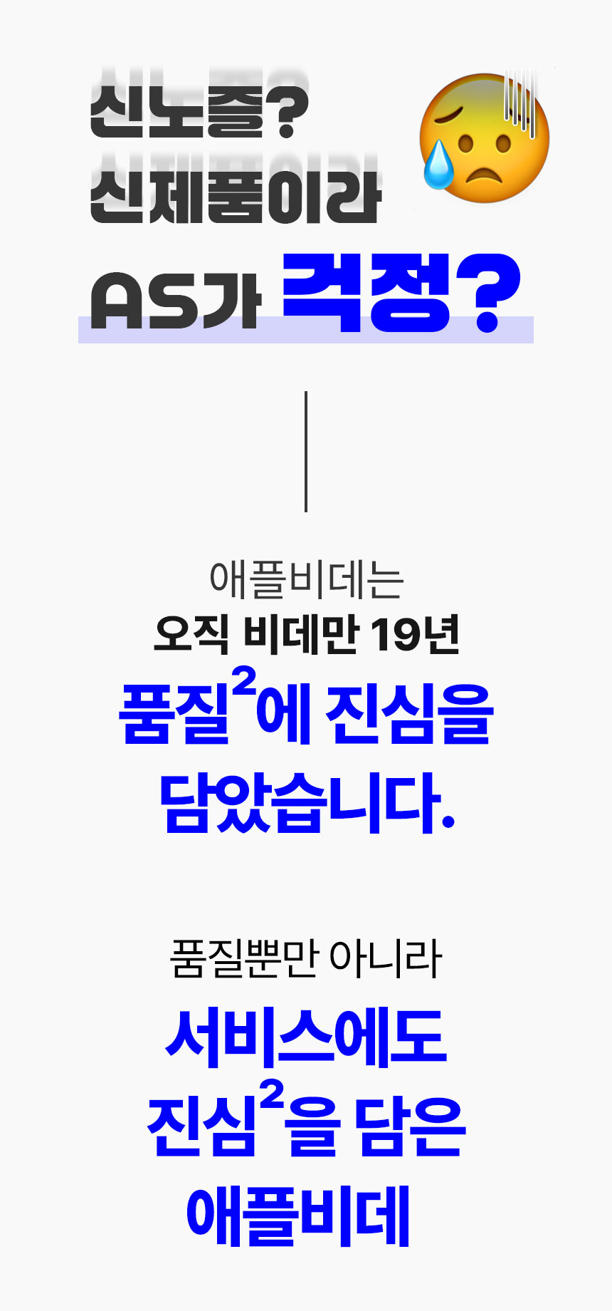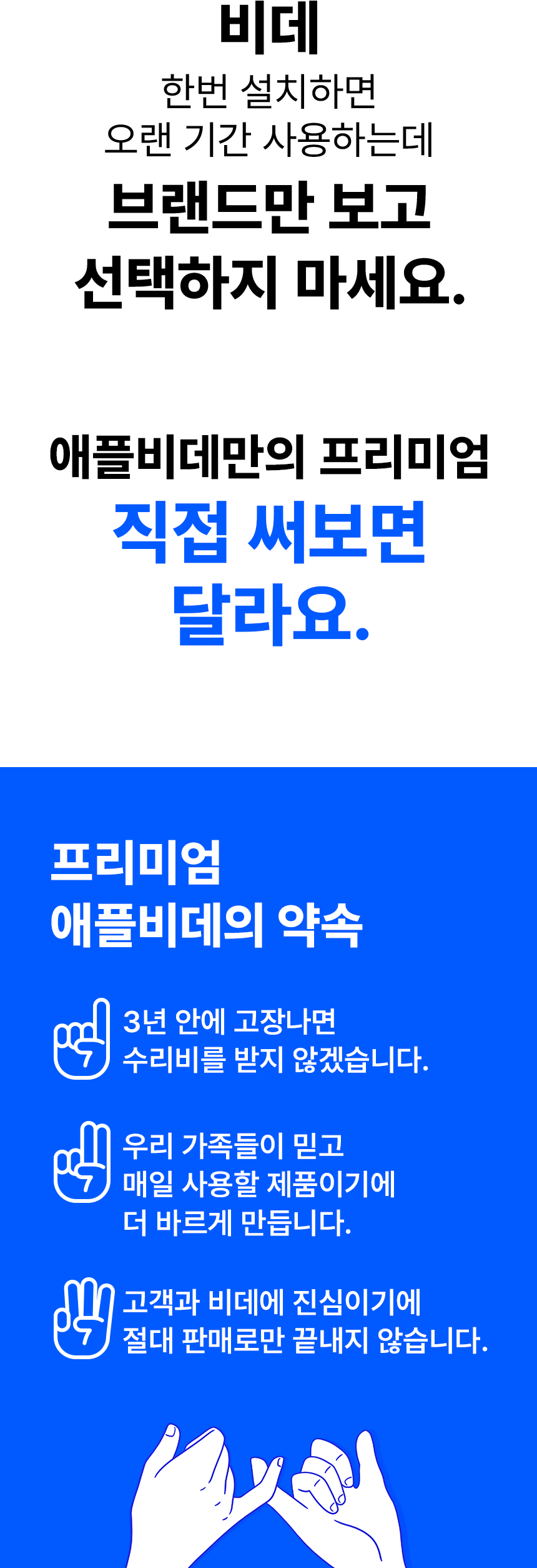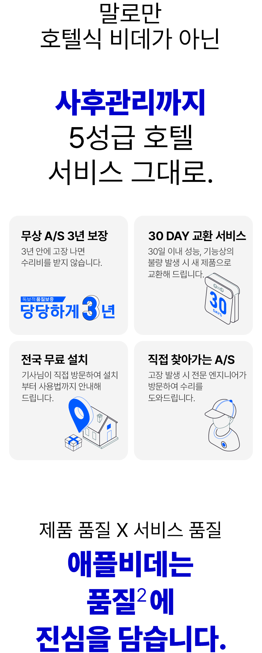 비데사업을 하면서 따듯한 기술로 고객과 소통하고 항상 더 나은 서비스와 상품으로 보답하기 위해 품질에 진심을 담아 오직 비데만을 개발하고 연구하며 생산해 왔습니다.고객을 최우선의 가치라고 생각하여 비데 업계 최초로 A/S 무상보증기간 3년을 실시하고 있습니다. 애플비데의 경영철학은 고객의 마음속에 있는 회사로 자리매김 하기 위해 단기적 이익을 추구하기 보다 장기적으로 생산자, 판매자, 고객 모두에게 옳은 일을 하기 위해 지속적으로 고민하고 노력하고자 합니다. 또한 애플젠의 고객은 지금까지 그래왔듯 앞으로도 애플젠이 성장하는 과장에서 방향을 잃지 않도록 길을 밝혀주는 등대의 역할을 해줄것이라 믿습니다.