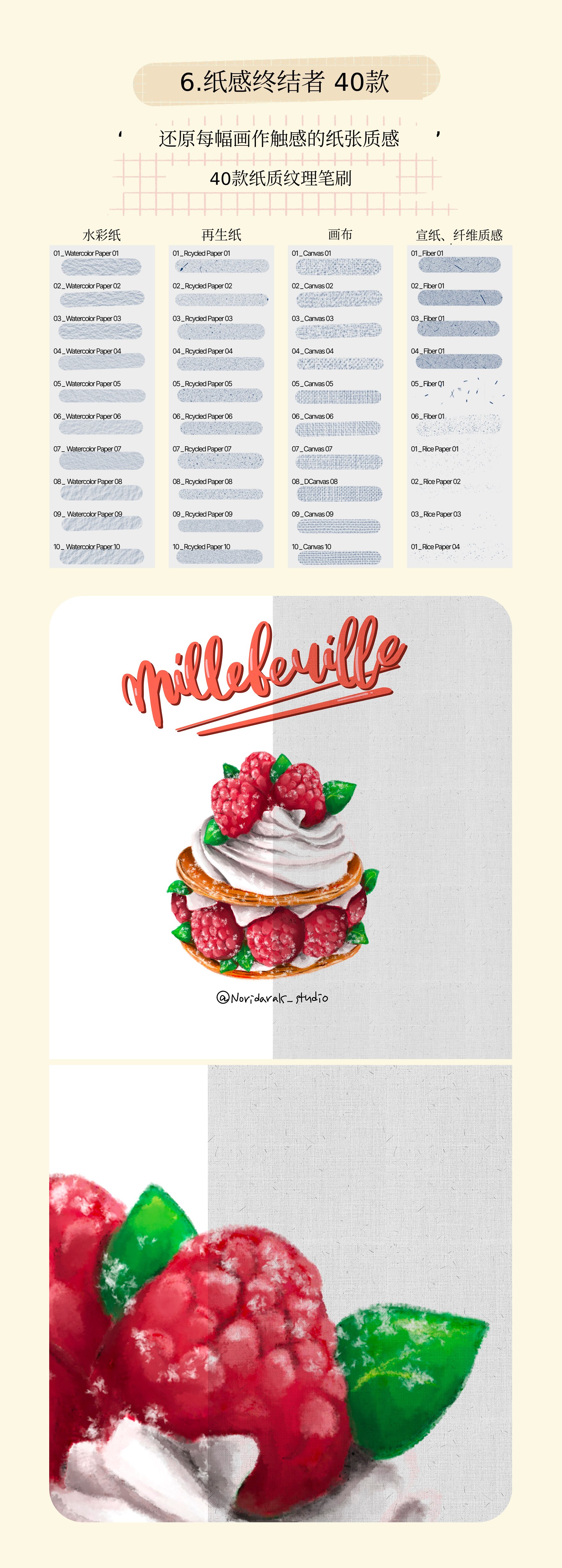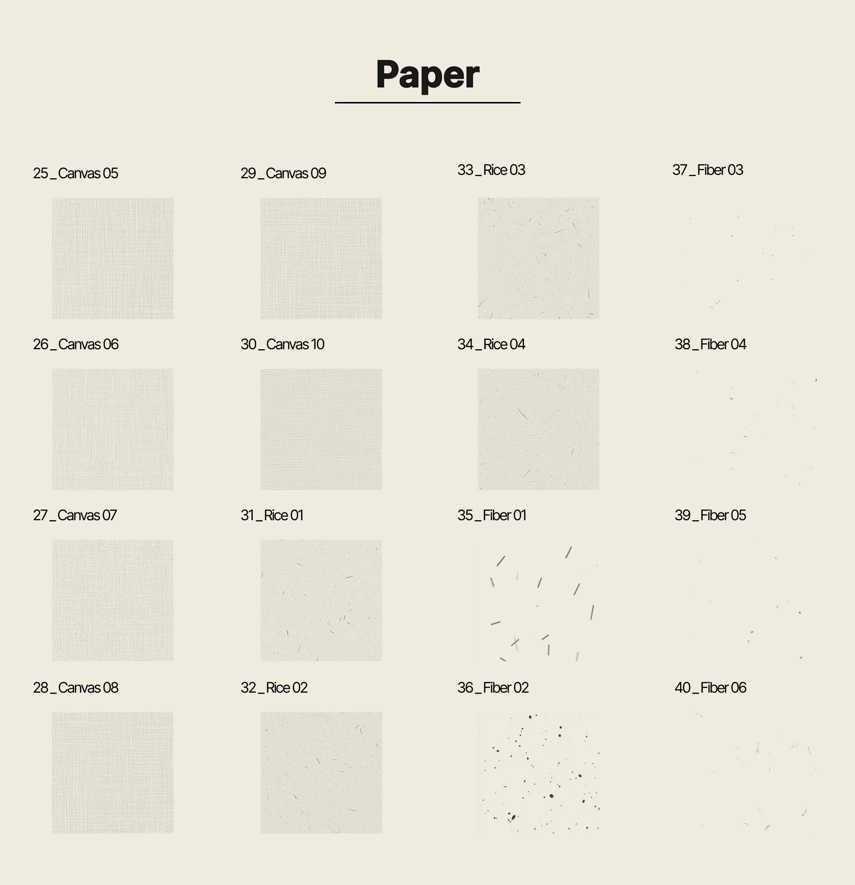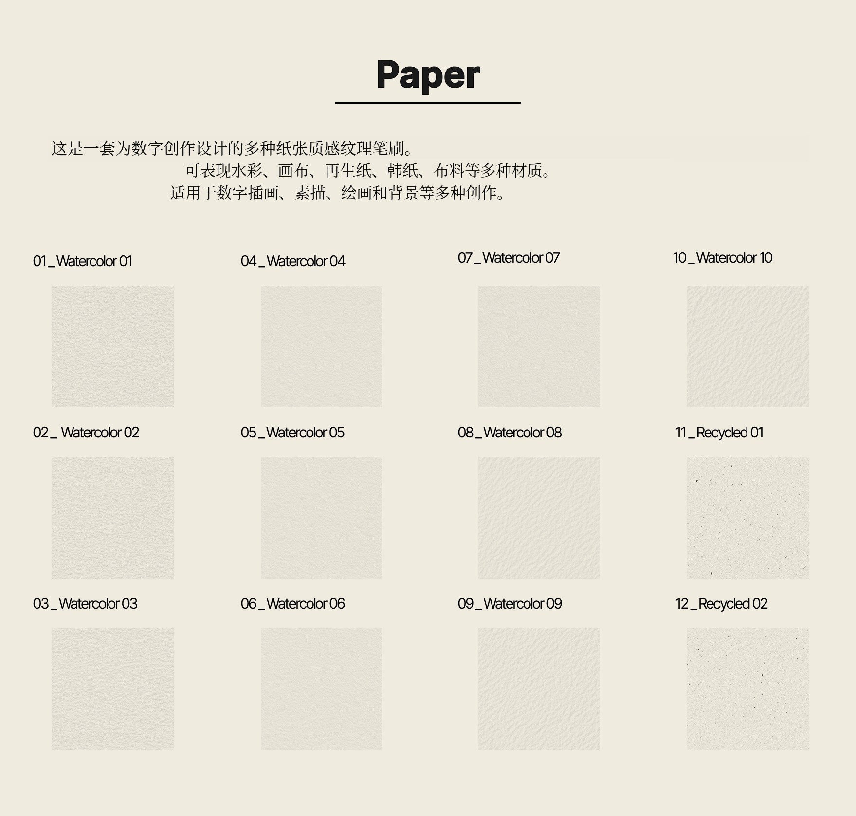 ✅ 提供多种纸张风格: 可表现水彩纸、画布、韩纸、再生纸等不同质感
