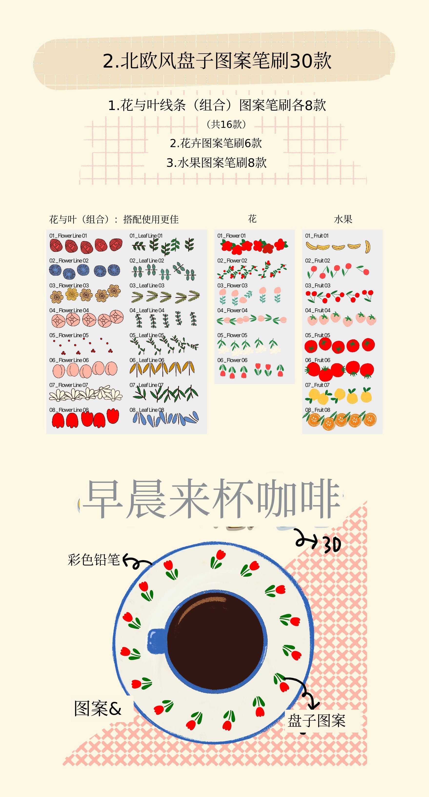 回报:Procreate画笔、VOD、图案JPG、画笔制作PDF