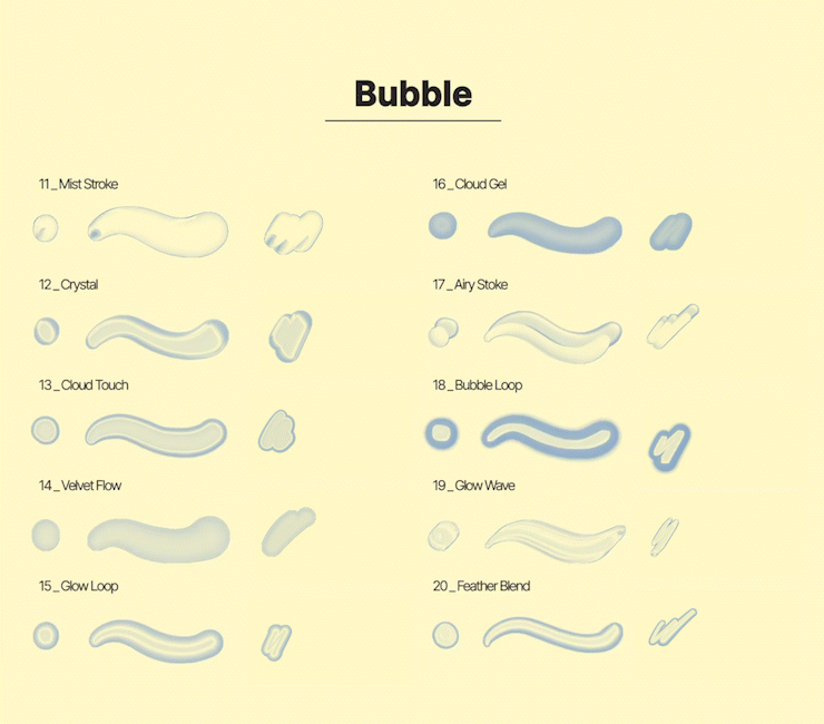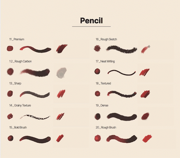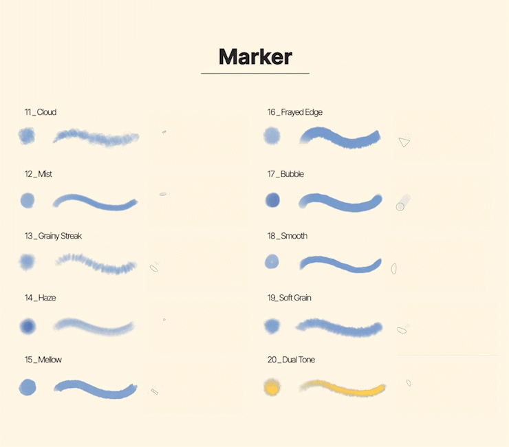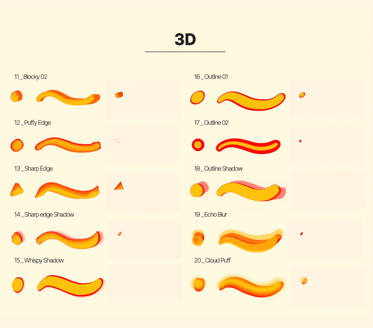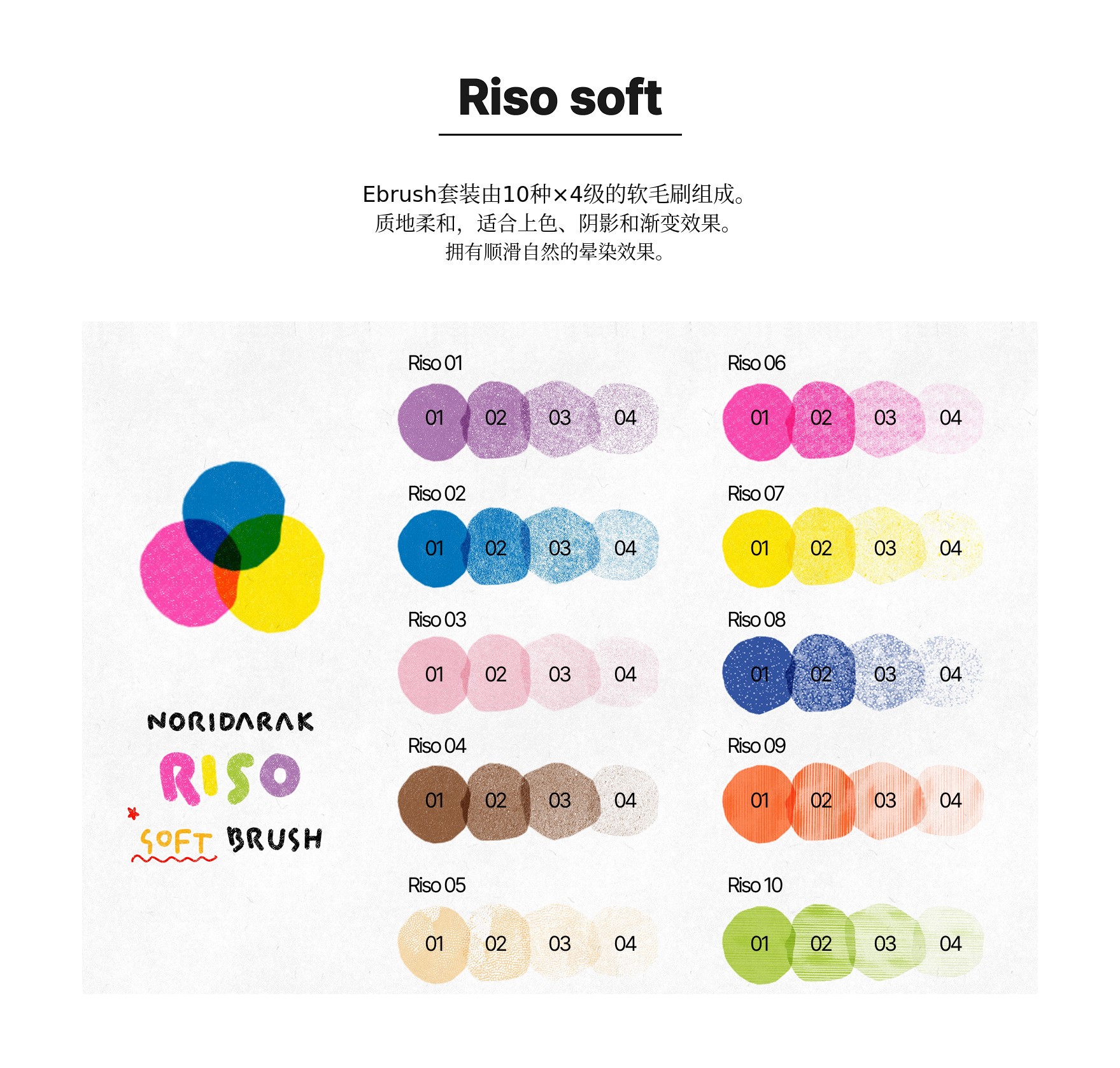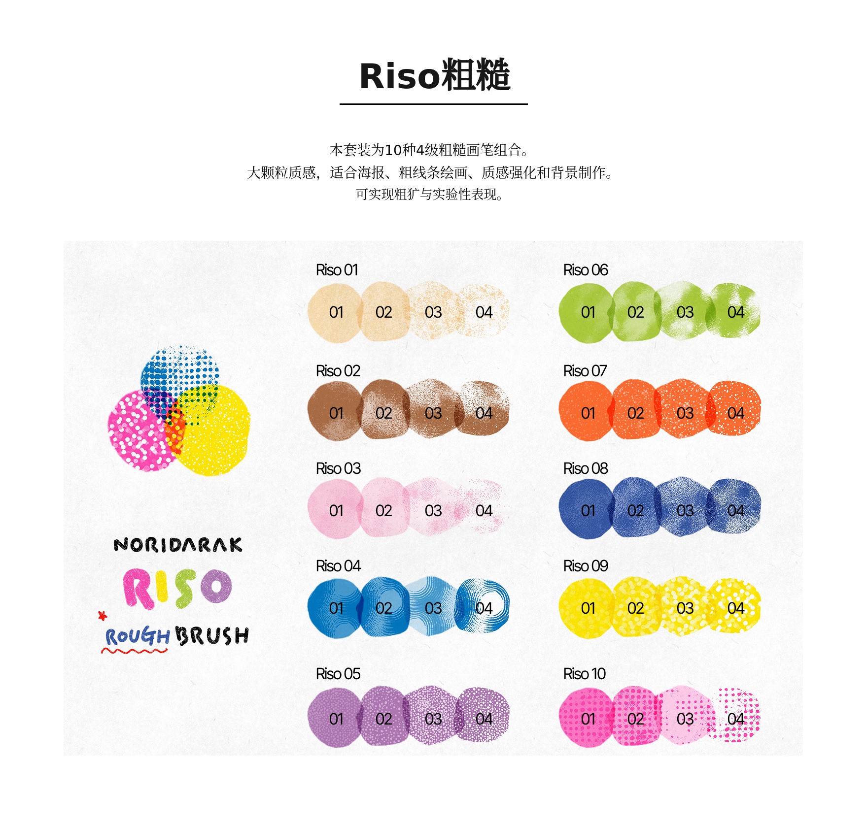 Riso画笔包含20种画笔,每种由4个阶段组成