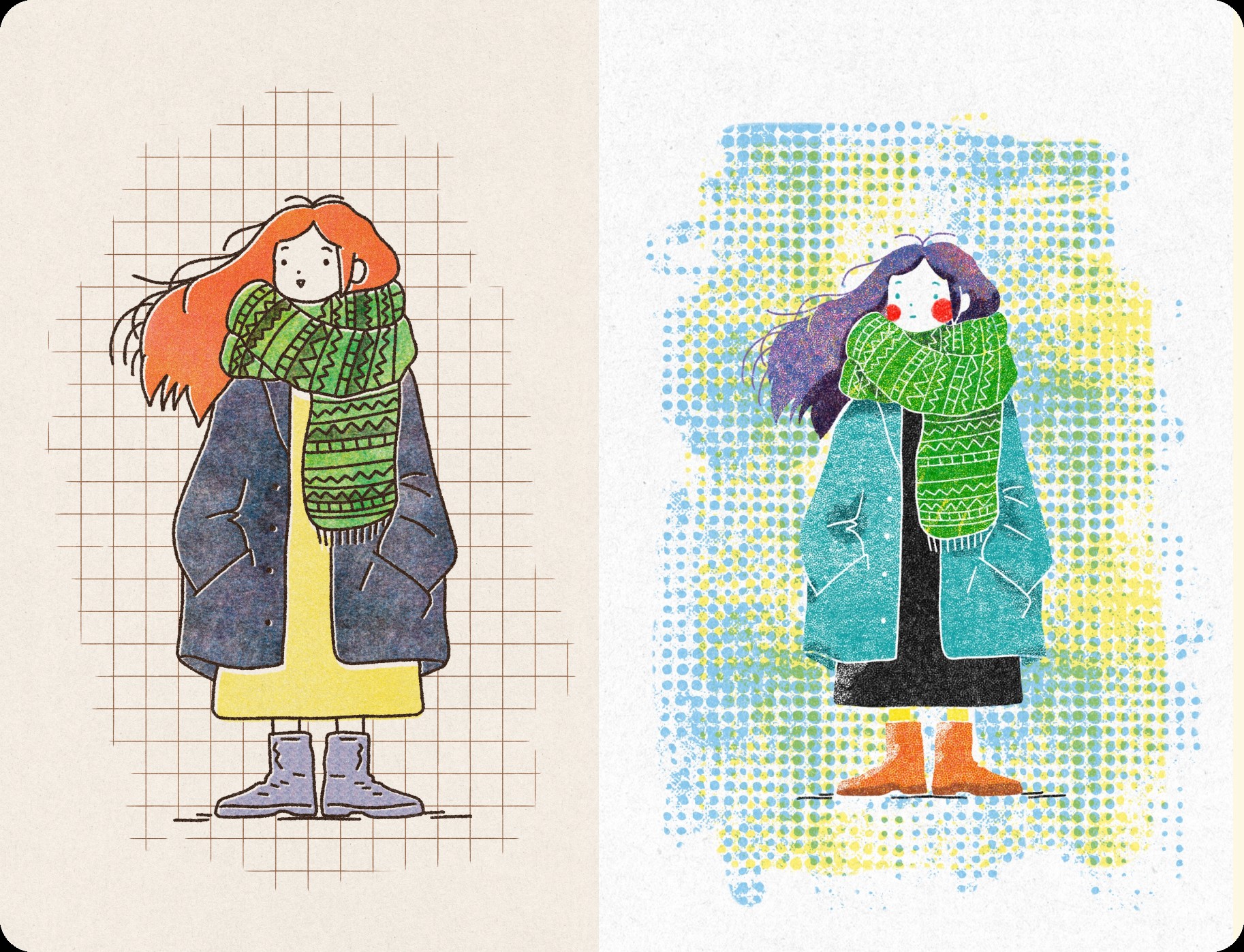 插画: 不是数码特有的光滑感,而是如同印在纸上的自然感