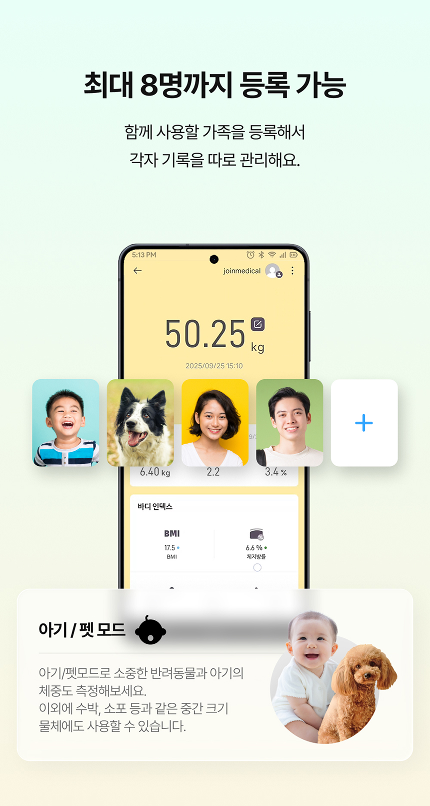 단순히 예쁜 기능만 담은 것이 아닙니다. 고정밀 센서와 앱을 연동하여 체중, 체지방률, 근육량, BMI 등 무려 17가지의 신체 데이터를 정밀하게 분석합니다. 스마트폰 없이 올라가도 데이터는 기기에 저장되었다가, 앱을 켜는 순간 자동으로 동기화됩니다. 가족 구성원 모두가 각자의 데이터를 기록하고 공유할 수 있어, 온 가족의 헬스 매니저 역할을 톡톡히 해냅니다.