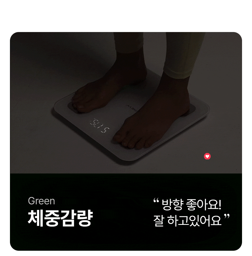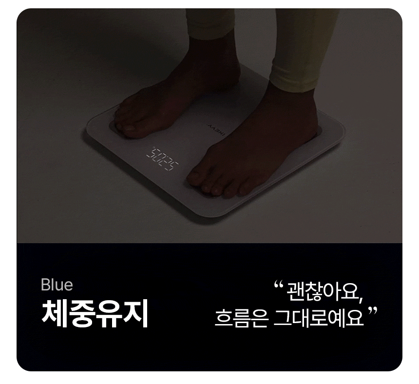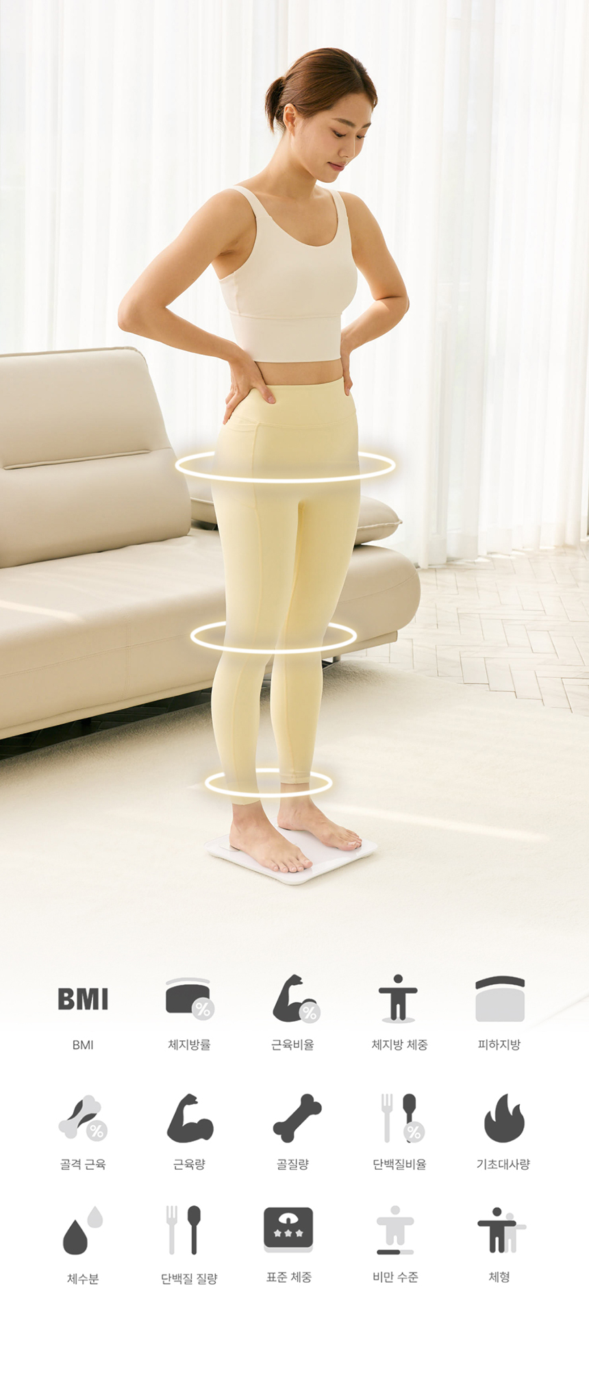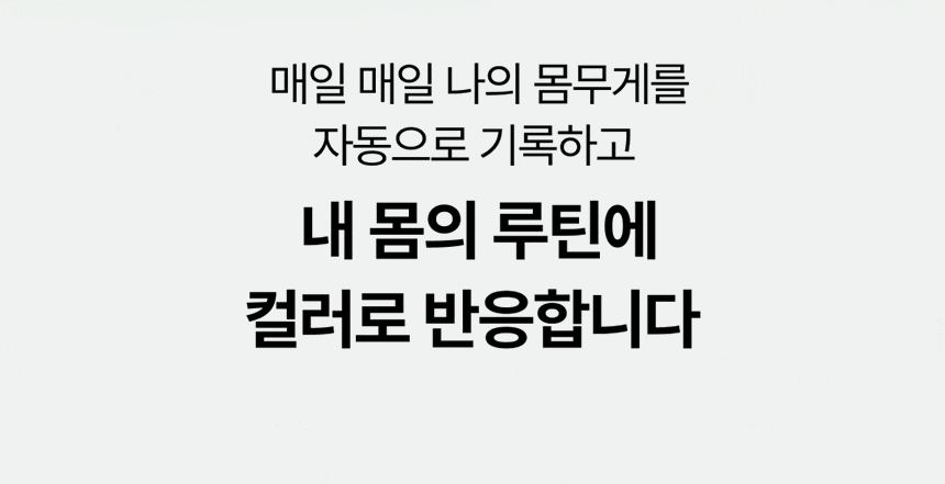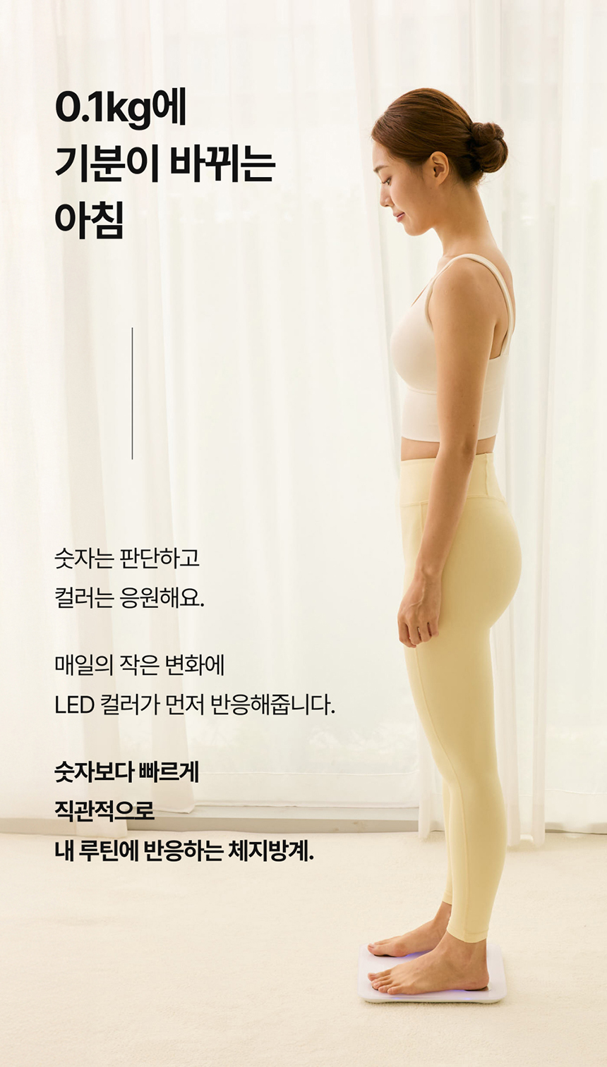 체중계에 올라서면 숫자를 자세히 들여다보기도 전에, 직관적인 빛의 색상이 내 몸의 상태(감량, 유지, 증량)를 1초 만에 알려줍니다. 이제 고개를 숙이고 숫자에 집착하는 대신, 빛의 신호를 통해 직관적으로 내 몸을 이해할 수 있습니다.