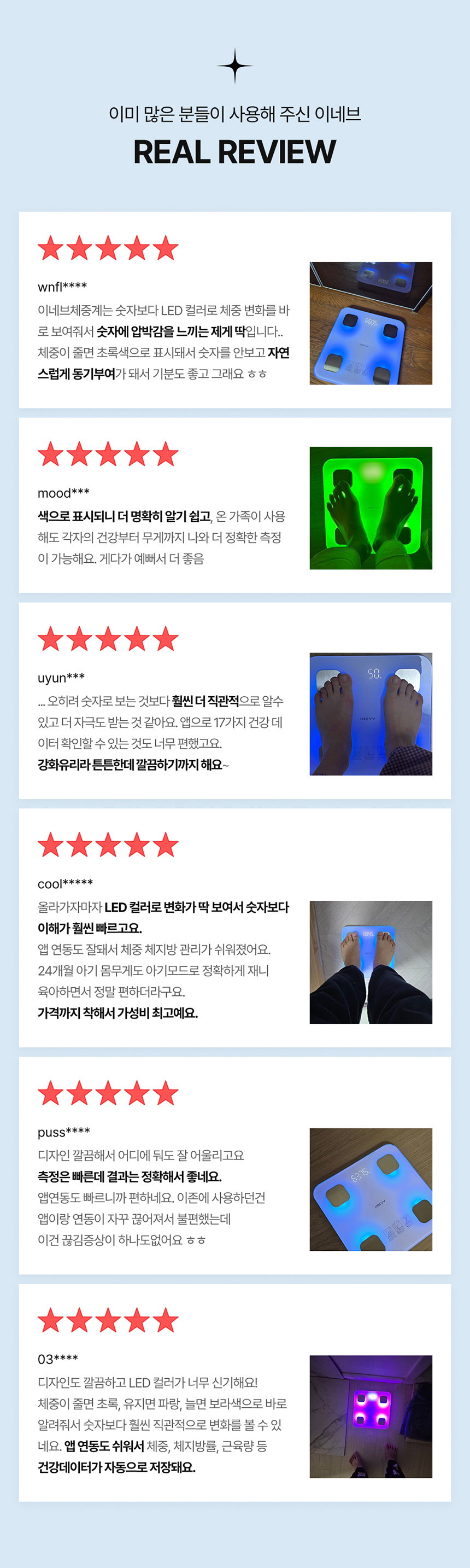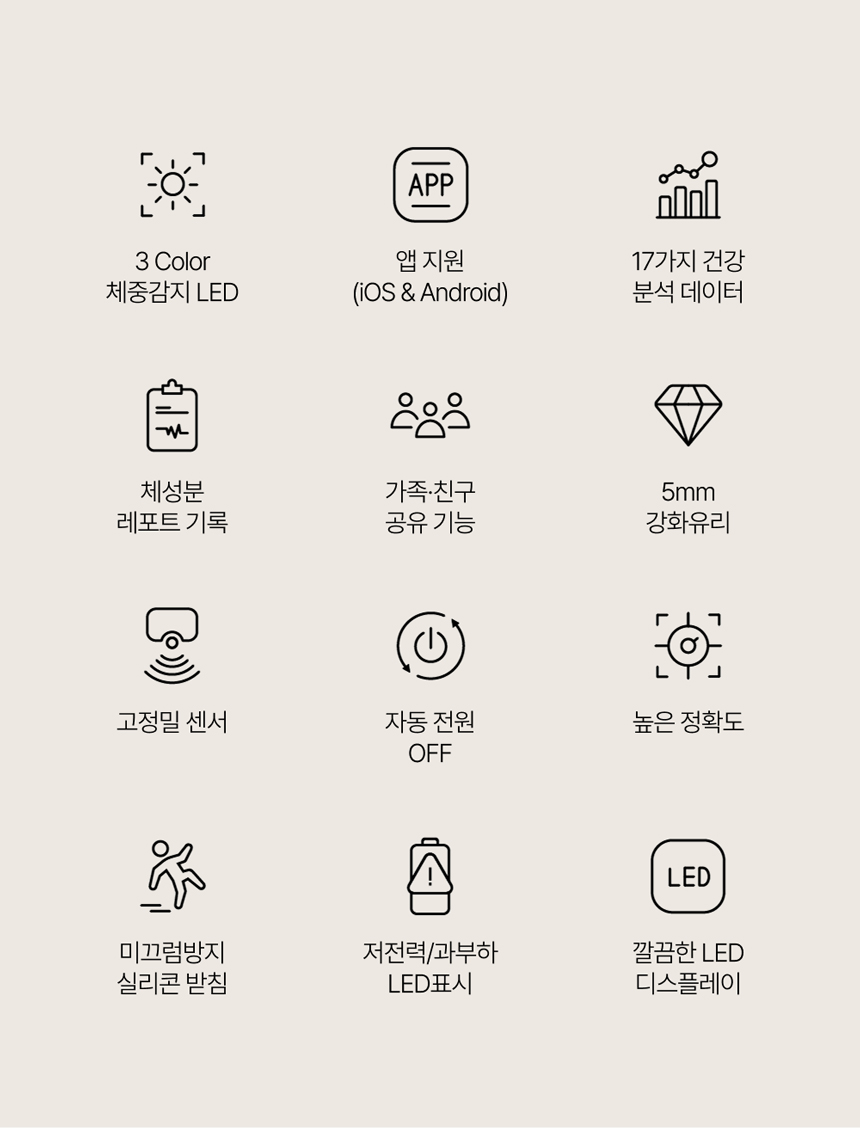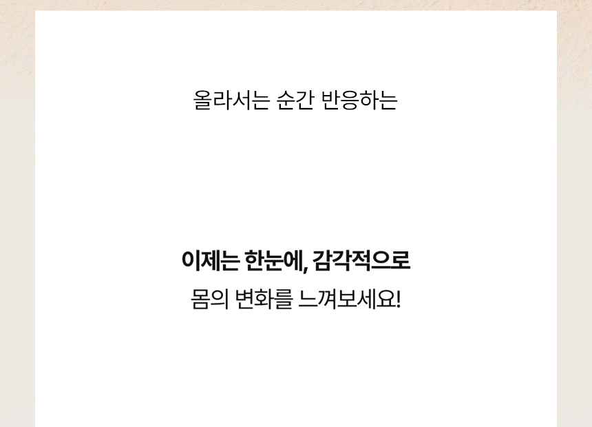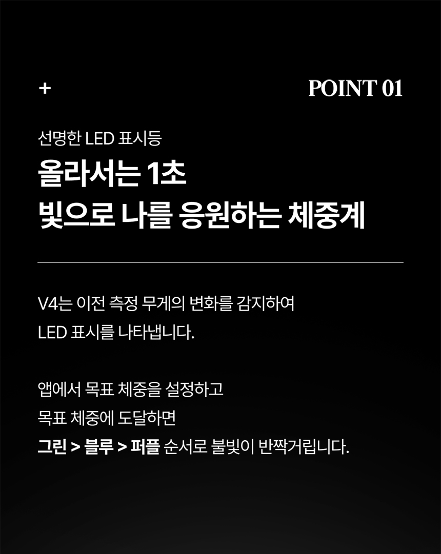 체중계에 올라서면 숫자를 자세히 들여다보기도 전에, 직관적인 빛의 색상이 내 몸의 상태(감량, 유지, 증량)를 1초 만에 알려줍니다. 이제 고개를 숙이고 숫자에 집착하는 대신, 빛의 신호를 통해 직관적으로 내 몸을 이해할 수 있습니다.