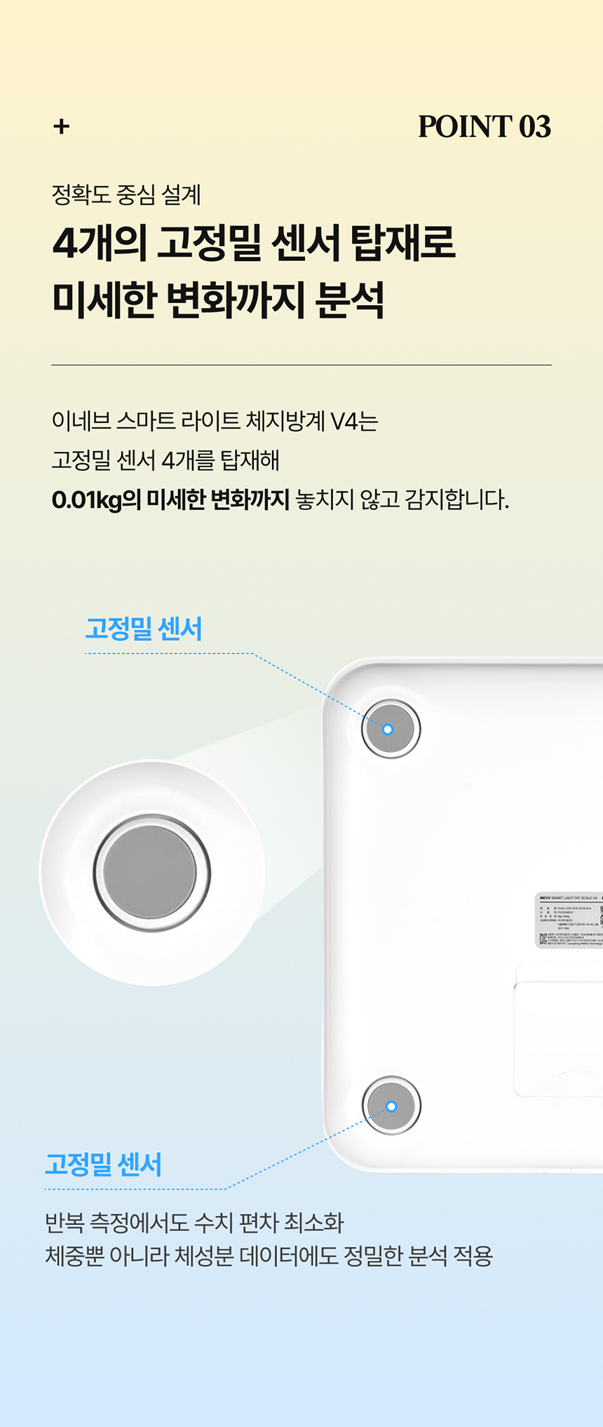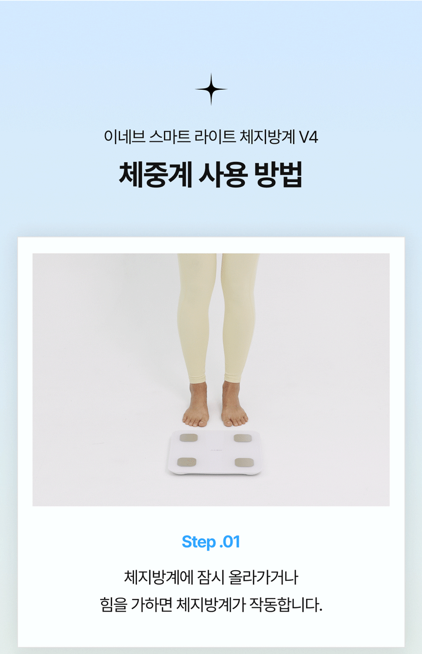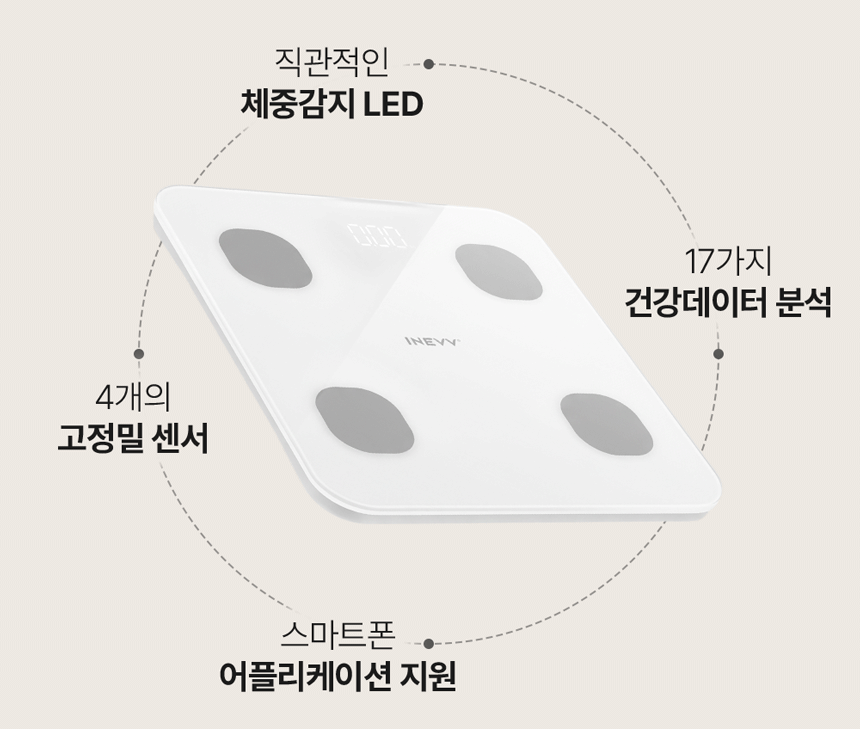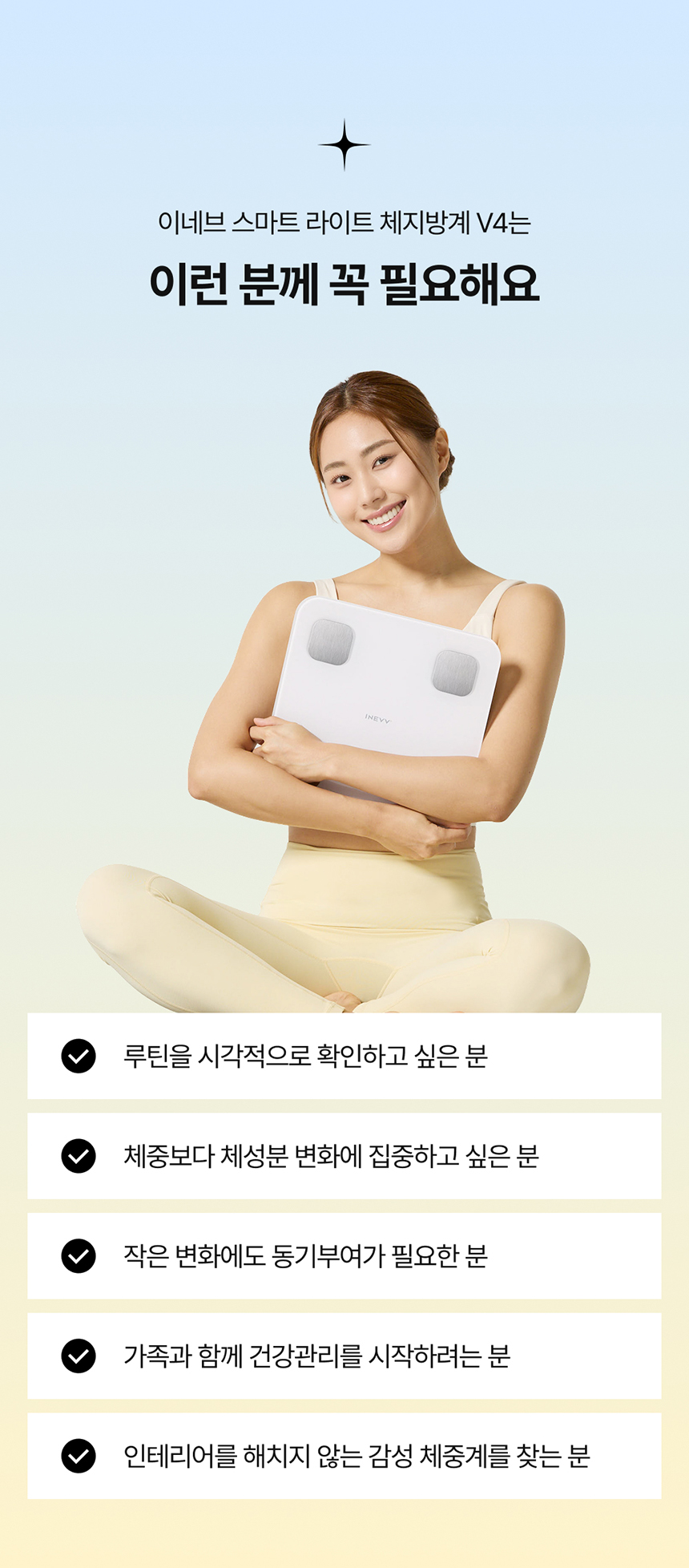 '숫자보다 먼저, 마음을 읽어주는 체중계는 없을까?'우리는 숫자가 주는 강박에서 벗어나, 내 몸의 변화 그 자체를 즐겁게 받아들일 수 있는 방법을 고민했습니다. 차가운 숫자 대신 직관적인 '빛'으로 당신을 응원하고, 건강 관리가 스트레스가 아닌 즐거운 루틴이 되기를 바라는 마음. 그것이 바로 이네브 스마트 라이트 체지방계 V4가 세상에 나오게 된 이유입니다.