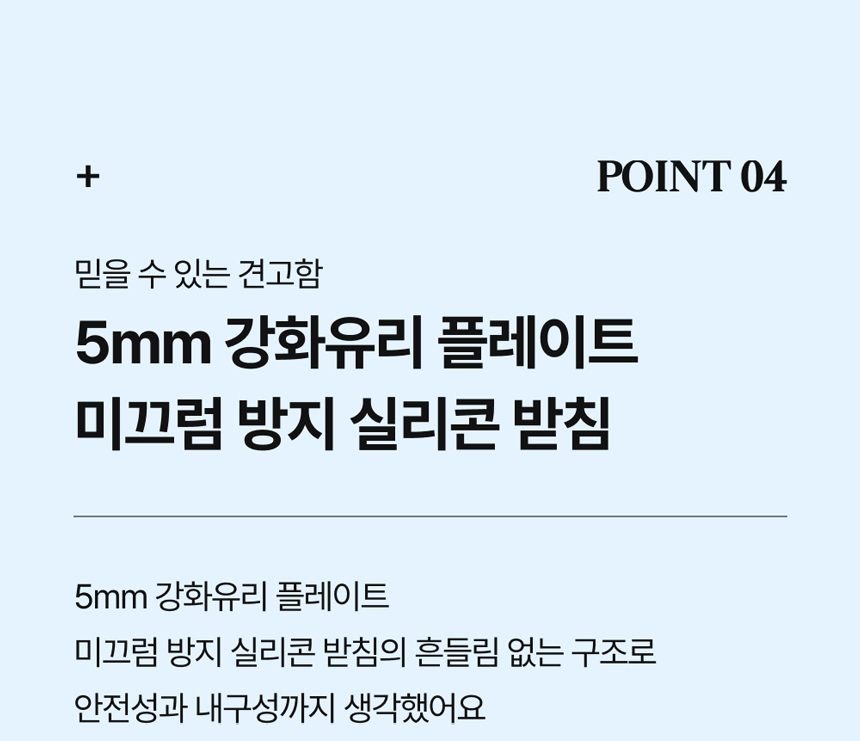 인테리어를 해치지 않는 미니멀한 화이트 디자인에 5mm 강화유리를 더해 내구성을 높였고, 미끄럼 방지 패드로 안전까지 생각했습니다. 기능부터 디자인까지, 사용자의 라이프스타일에 자연스럽게 스며들도록 설계했습니다.