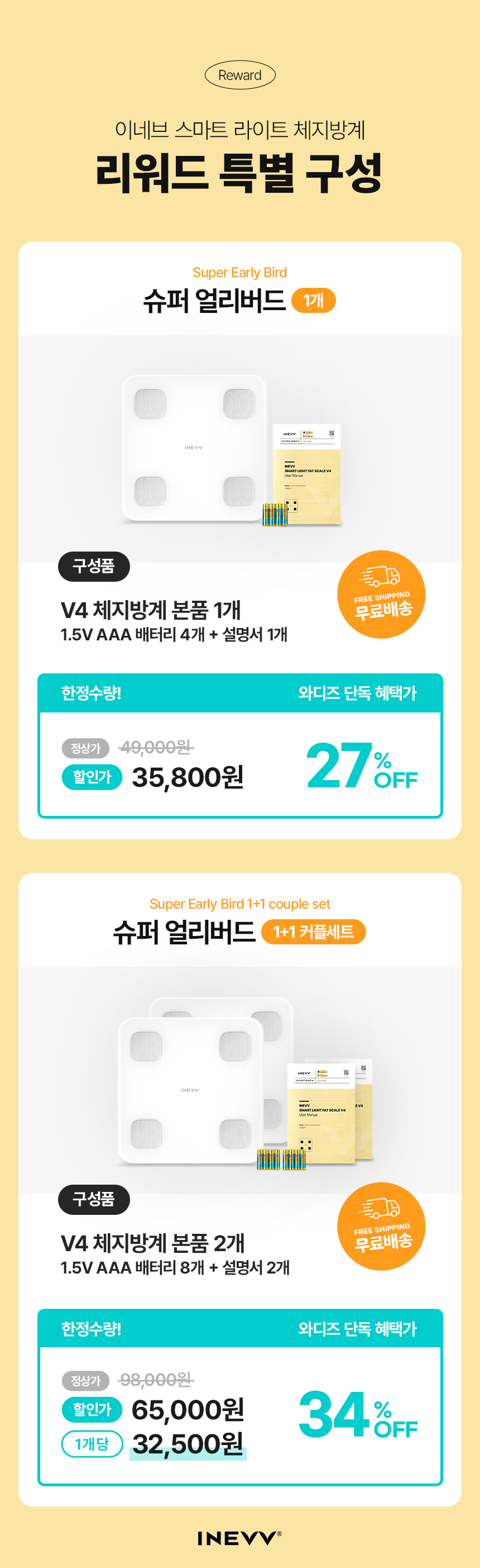 와디즈 서포터님들은 단순히 물건을 구매하는 것을 넘어, 새로운 가치와 라이프스타일을 가장 먼저 알아보는 안목을 가진 분들입니다. 기존 체중계의 틀을 깨고 '컬러 피드백'이라는 새로운 경험을 제공하는 이네브 V4의 진가를 가장 잘 알아봐 주실 곳이라 확신했습니다.