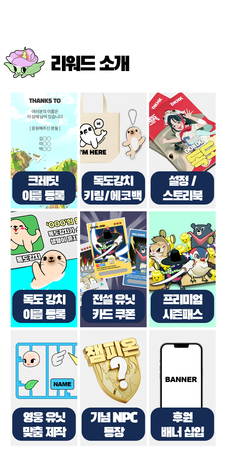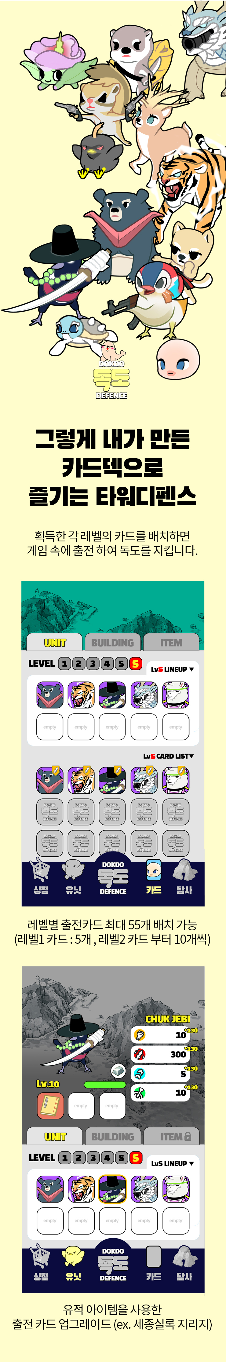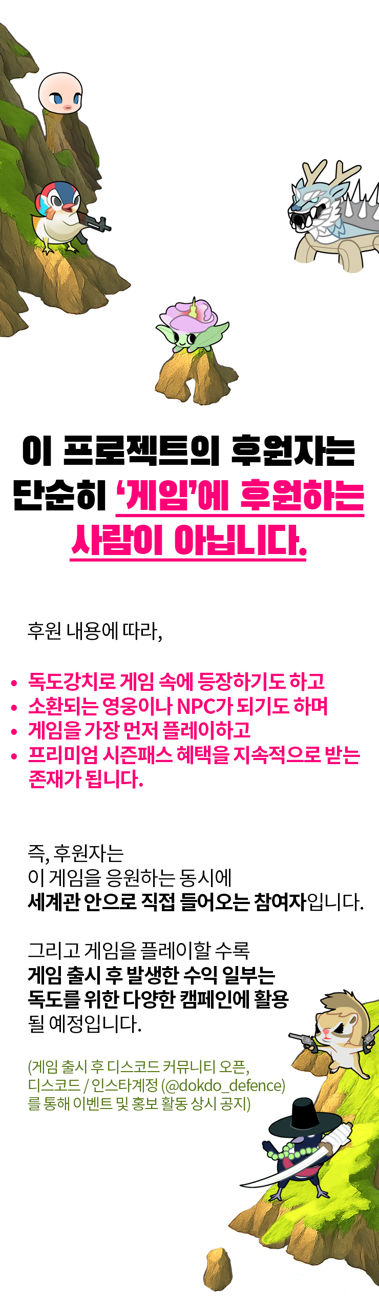 1. 🛡️ 独岛塔防游戏 - 可爱动物角色守护独岛的策略手游 2. 🎮 参与型周边与英雄卡 - 支持者定制角色并应用于游戏 3. 🎁 专属众筹奖励 - 限量卡牌、亚克力钥匙扣及季票