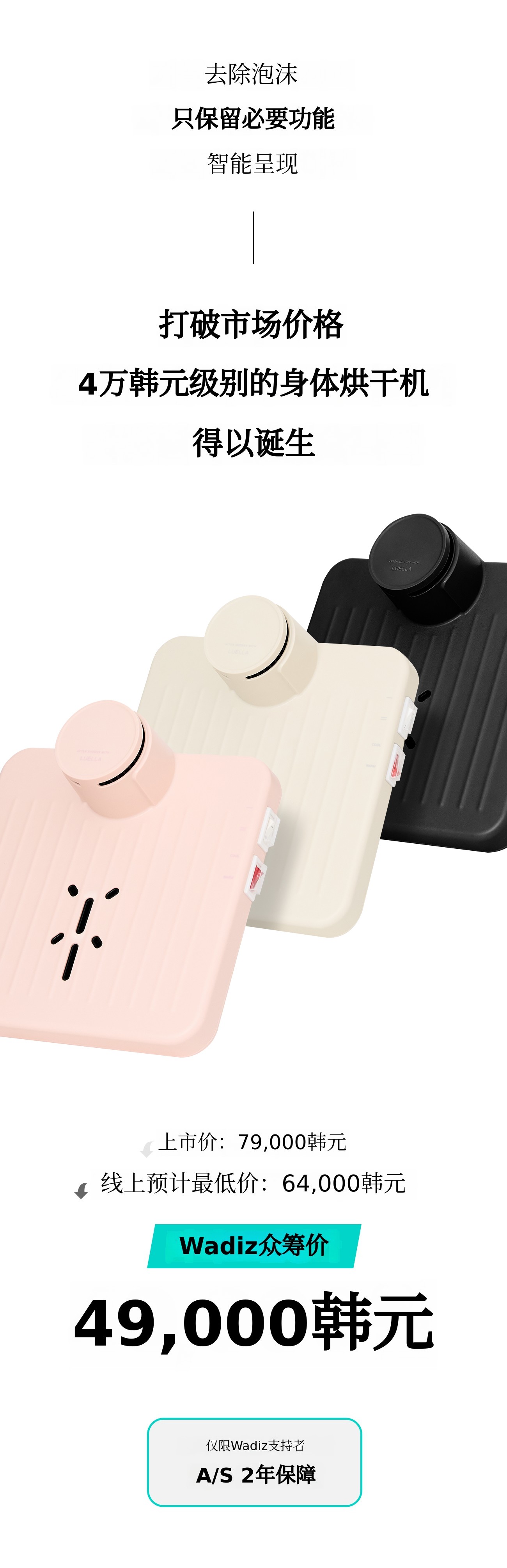 1. 🛁 实惠的身体干燥器 - 以4万韩元价格提供必备规格的产品 2. ⚙️ 自动感应踏板传感器 - 踩上即自动启动,使用方便安全 3. 🎁 众筹专属福利 - 提供2年保修、折扣及免运费优惠