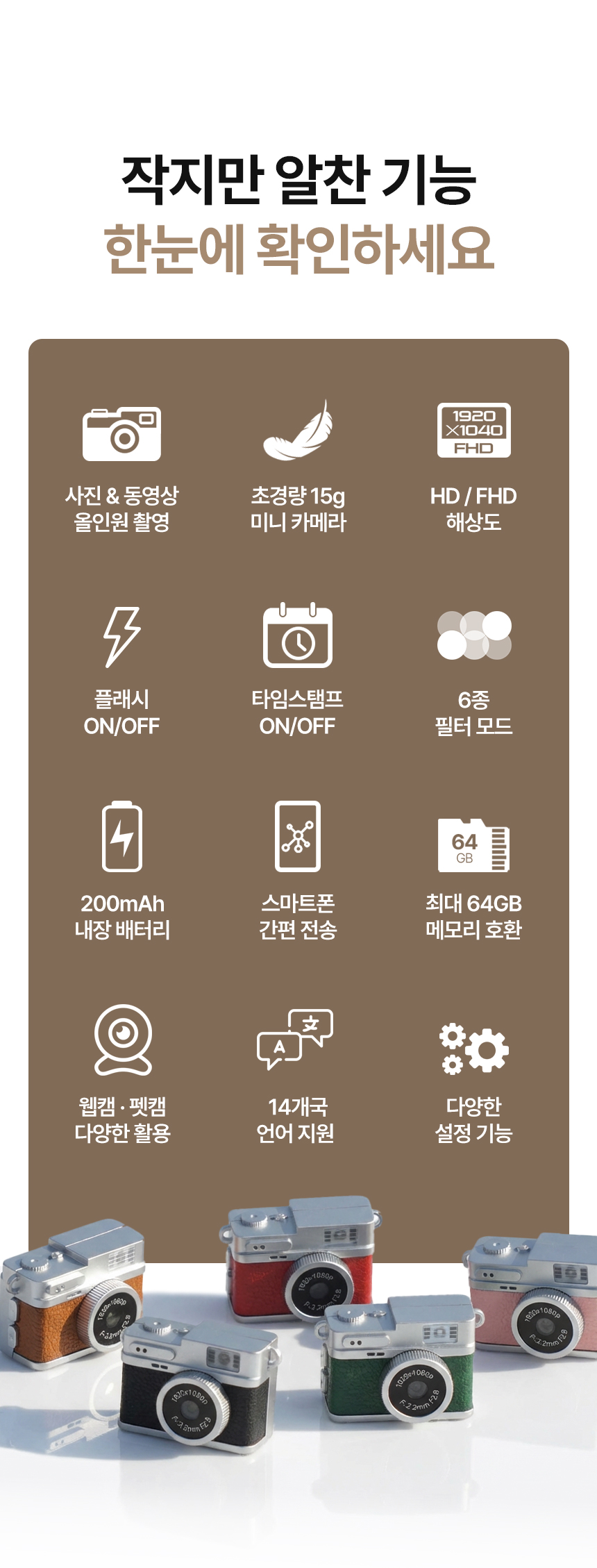 1. 📸 超小型迷你钥匙圈相机 - 15克轻巧设计,便于携带 2. 🎥 网络摄像头与宠物摄像功能 - 支持照片、视频、网络摄像及宠物摄像 3. 🎁 多样配件包含 - 附带皮革挂绳、透明包和8GB存储卡