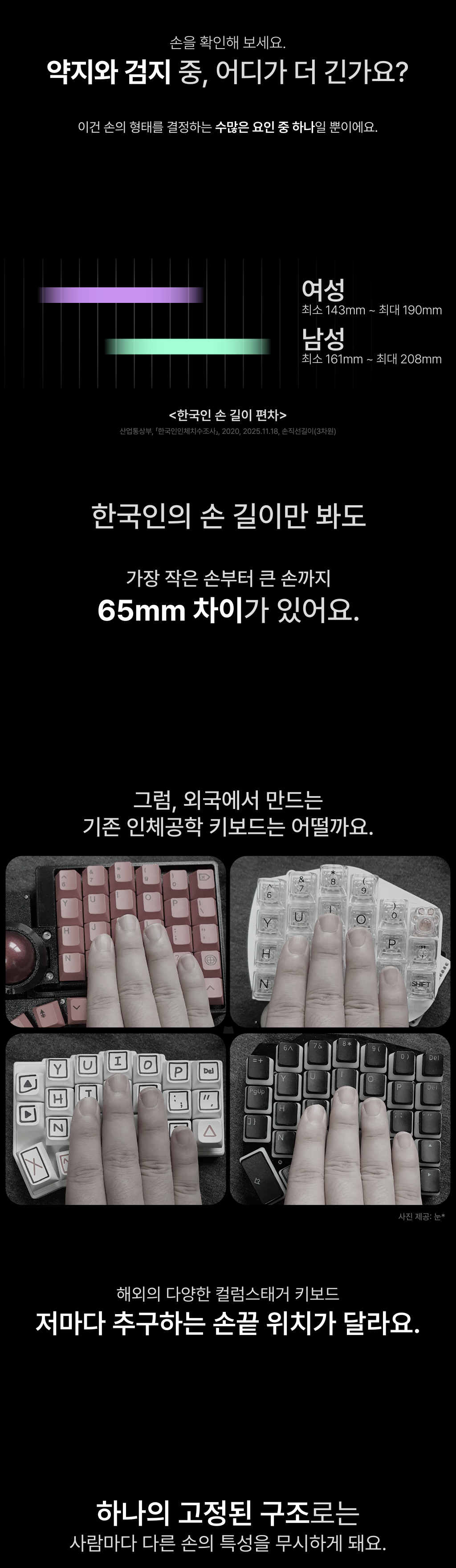 서양인 손 기준으로 만든 인체공학 키보드는 너무 크거나 간격이 넓어 불편했고,