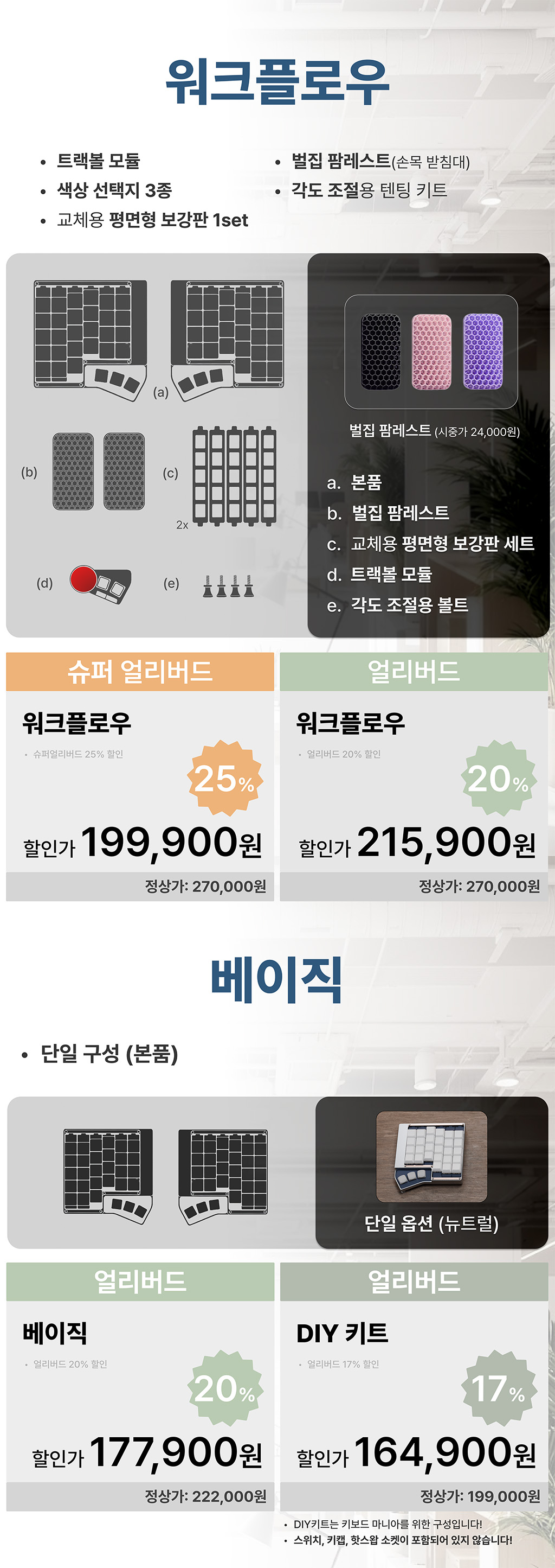 * 각도 조절 기능과 팜레스트는 워크플로우 이상부터 포함되어 있어요.