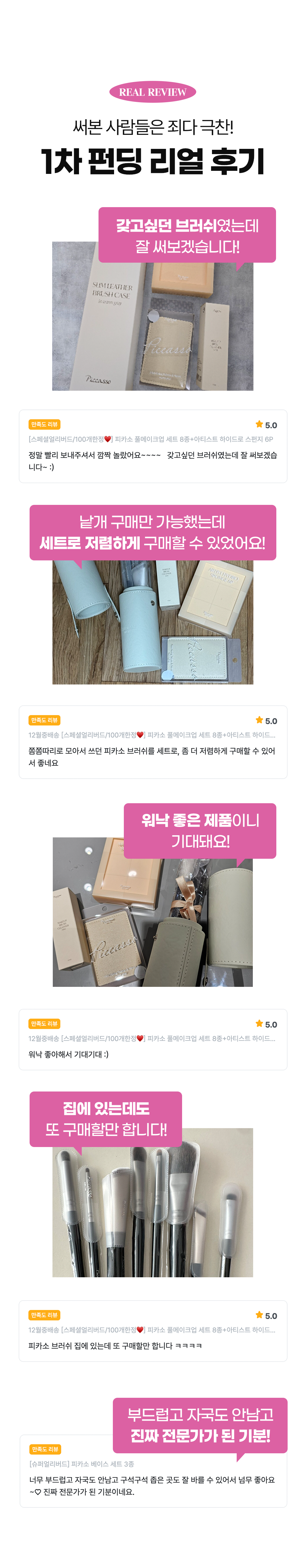 피카소 브러쉬 브랜드는 현재 대한민국을 넘어 전세계로 수출하며 글로벌 브랜드로 성장하고 있습니다. 이번 프리오더도 많은 응원과 관심 부탁드리며 끝까지 꼼꼼하게 잘 체크하여 성공적으로 본 프로젝트를 성공적으로 마무리 할 수 있도록 최선을 다 하겠습니다.