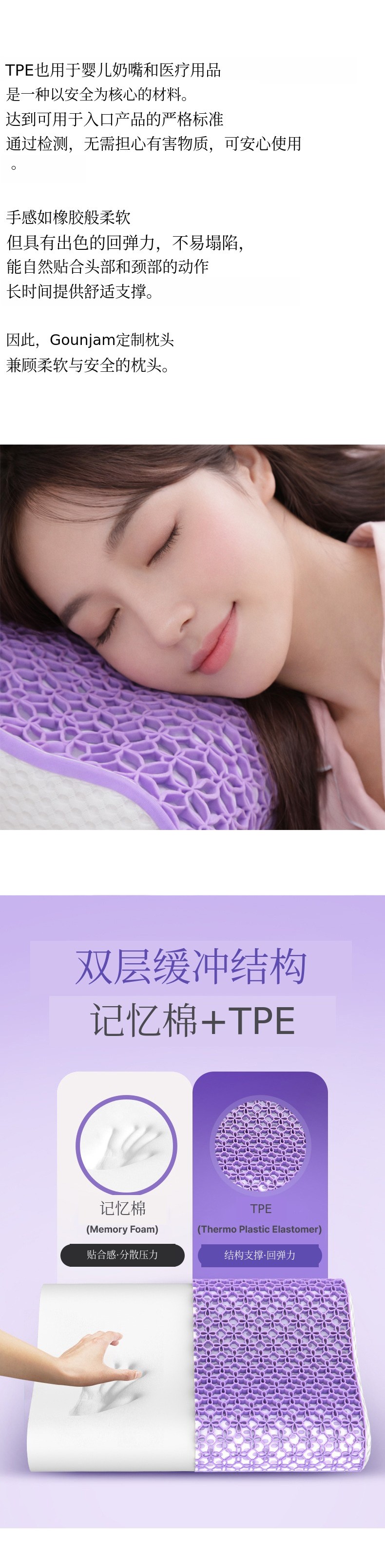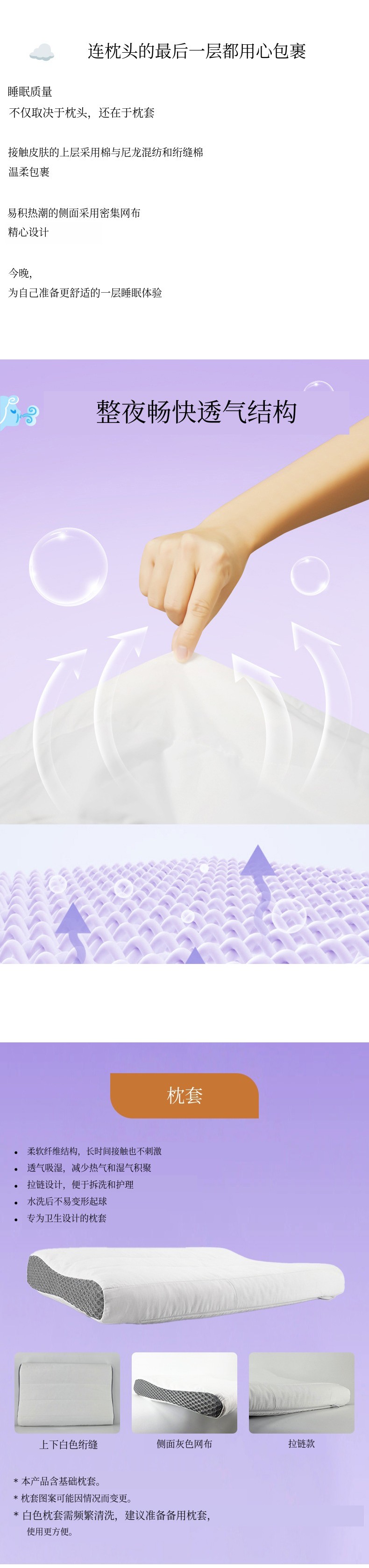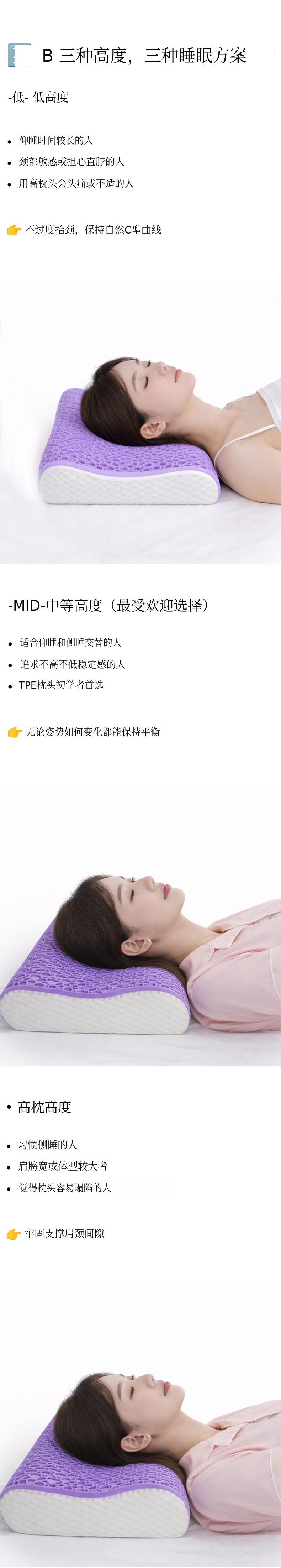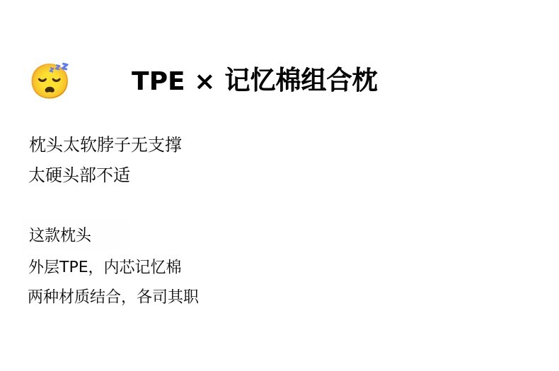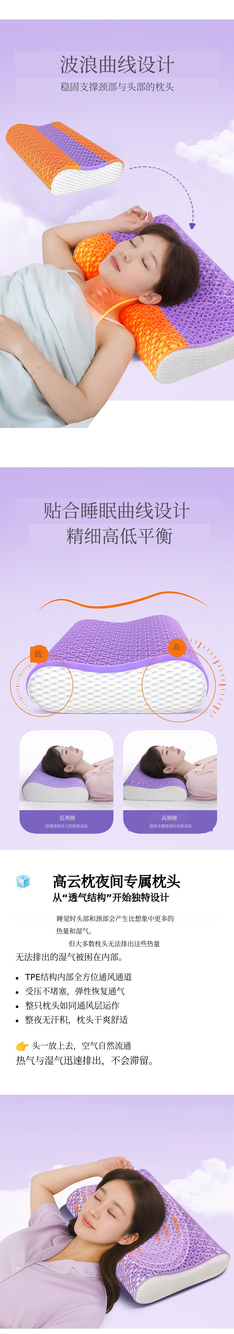 1. 🛏️ 可调节高度枕头 - 根据体型和睡眠习惯选择合适高度 2. 🌬️ 透气TPE结构 - 有效排出热量和湿气,保持舒适 3. 🎁 可拆洗枕套 - 拉链设计便于清洗和卫生管理