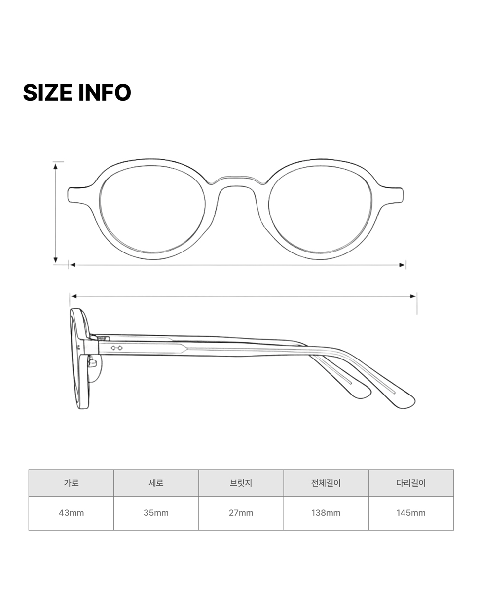 프레임 전면은 둥근 라운드 쉐입을 기본으로 하되, 완전히 원형에 가깝기보다는 살짝 각을 살린 밸런스형 디자인이라 얼굴형을 부드럽게 감싸면서도 답답하지 않습니다.