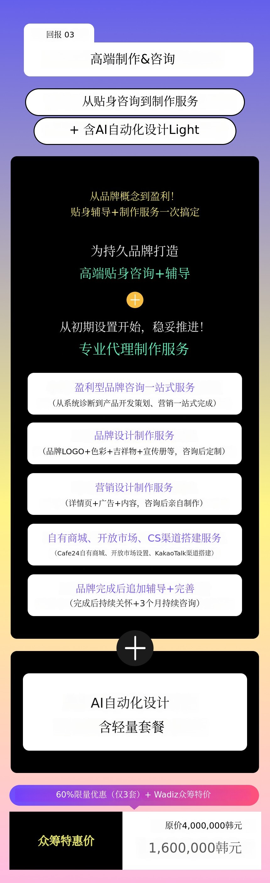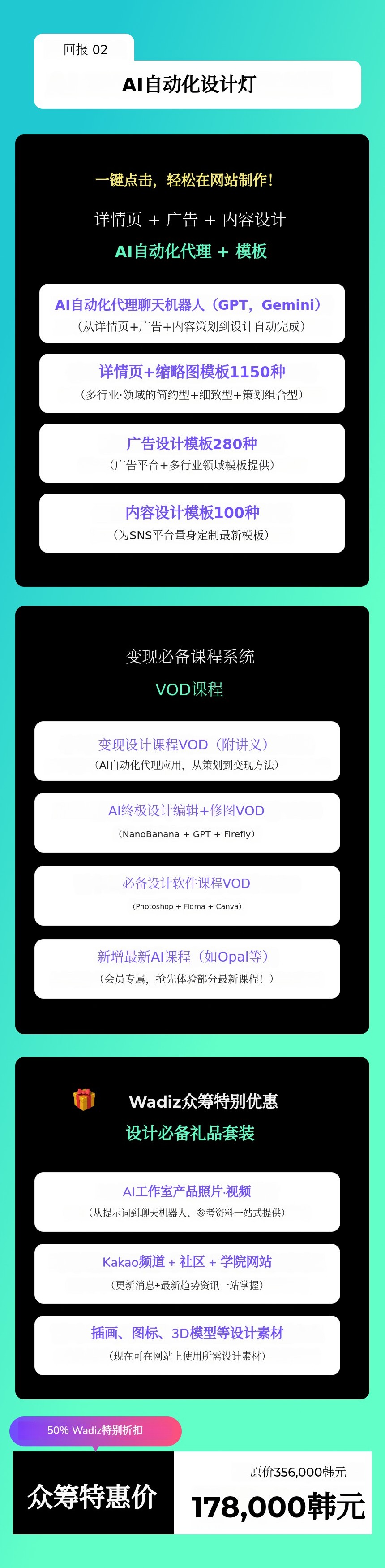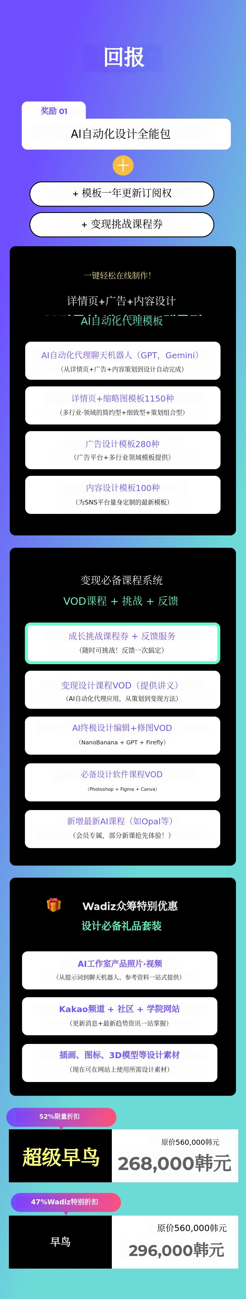 1. 🤖 AI自动化营销设计 - 一键完成详情页、广告和内容设计 2. 📚 1500+模板与挑战 - 多样模板与挑战支持高效设计 3. 🎁 限量特别优惠 - 众筹参与者专享折扣与特别礼包