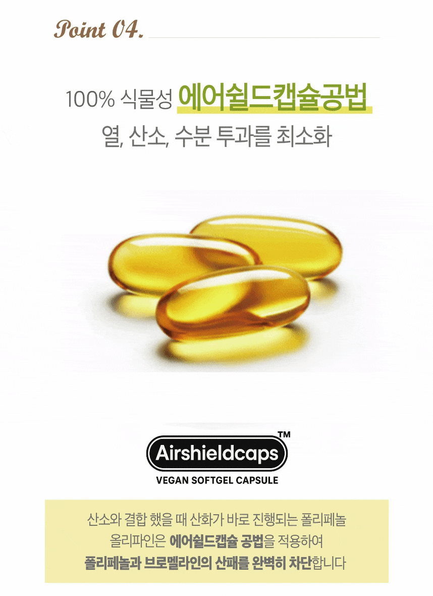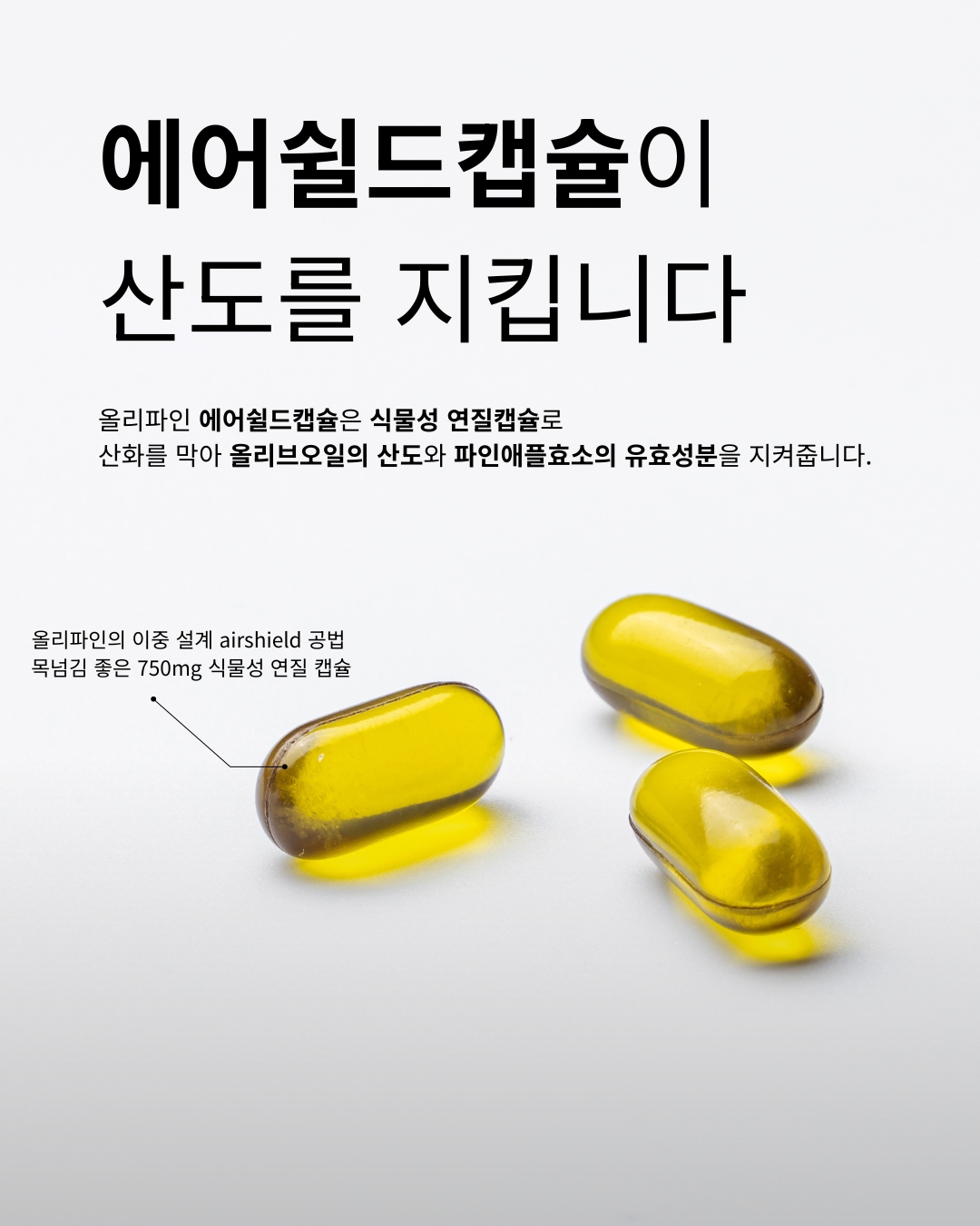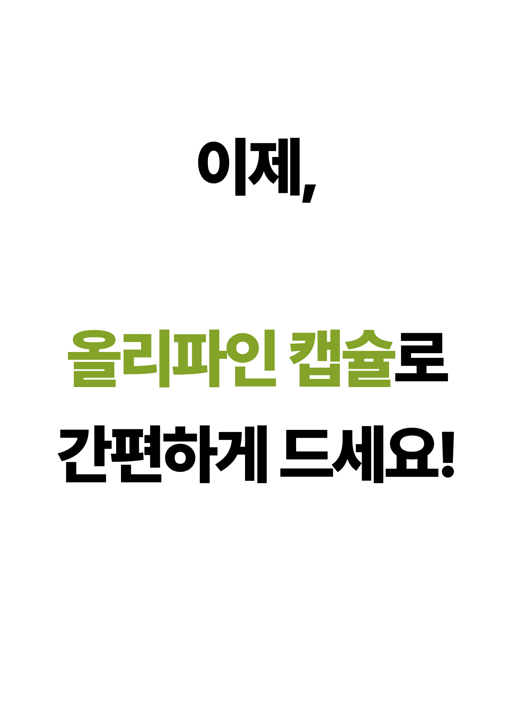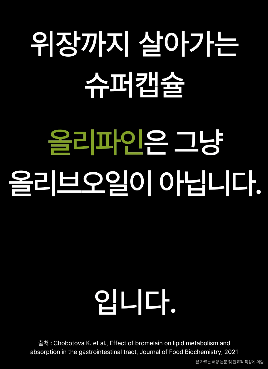 - 올리파인은 100% 스페인산 초저산도 엑스트라버진 올리브오일에 파인애플에서 추출분말을 결합해, ‘유효흡수율’을 설계한 액체황금 캡슐입니다. 단순히 좋은 원료를 넣는 것을 넘어, 그 성분이 인체에 얼마나 활용되는지를 과학적으로 접근했습니다. 먹고 끝나는 제품이 아니라, 몸에서 작동하는 건강캡슐이라는 새로운 기준을 제시합니다.