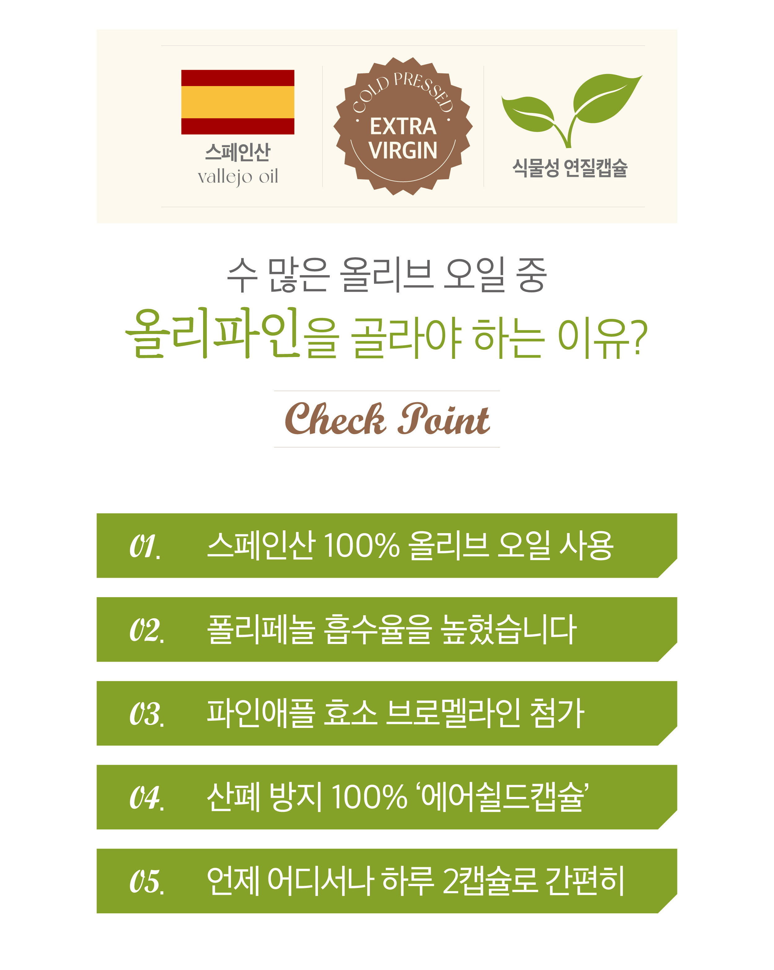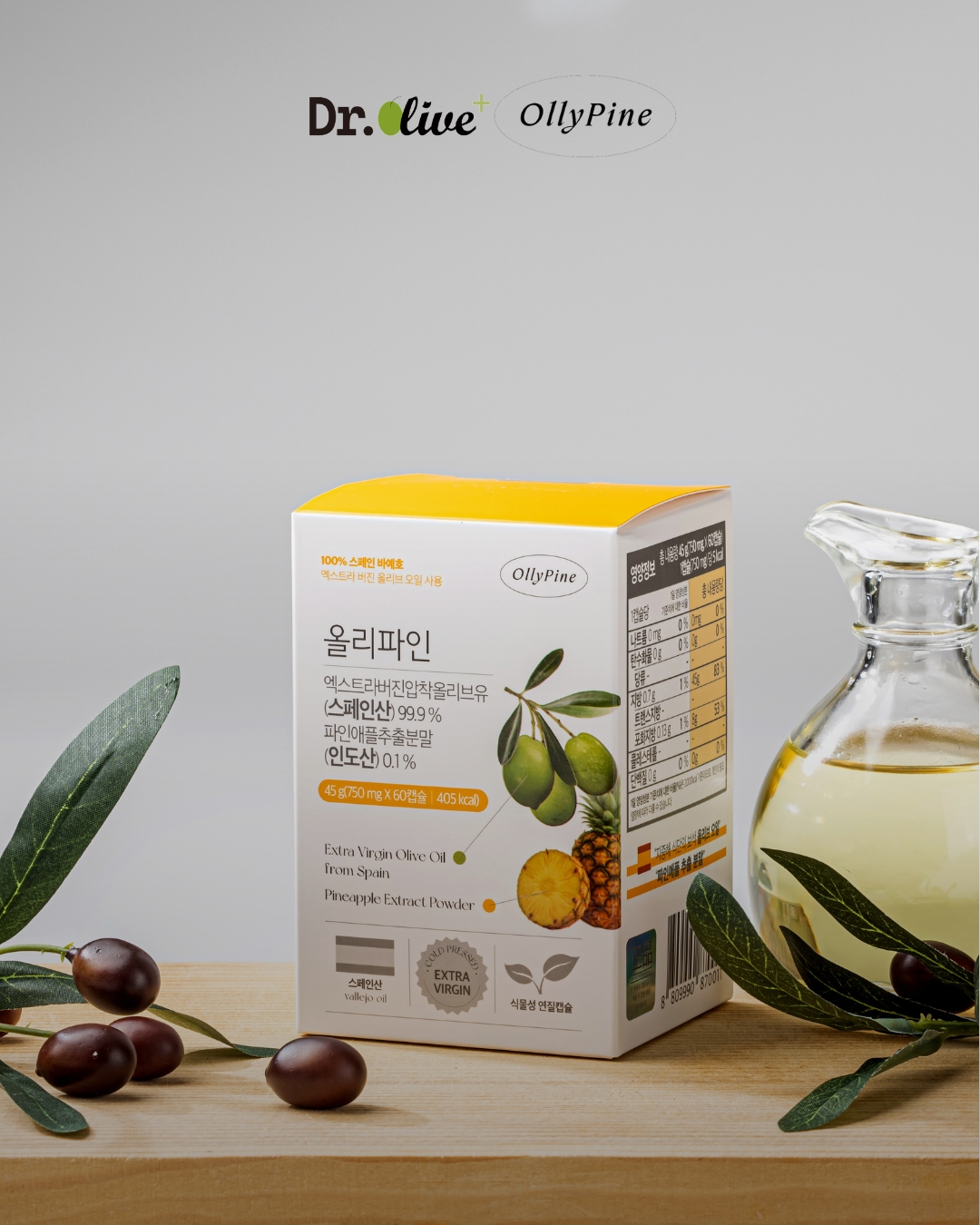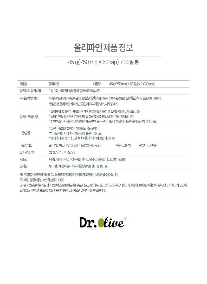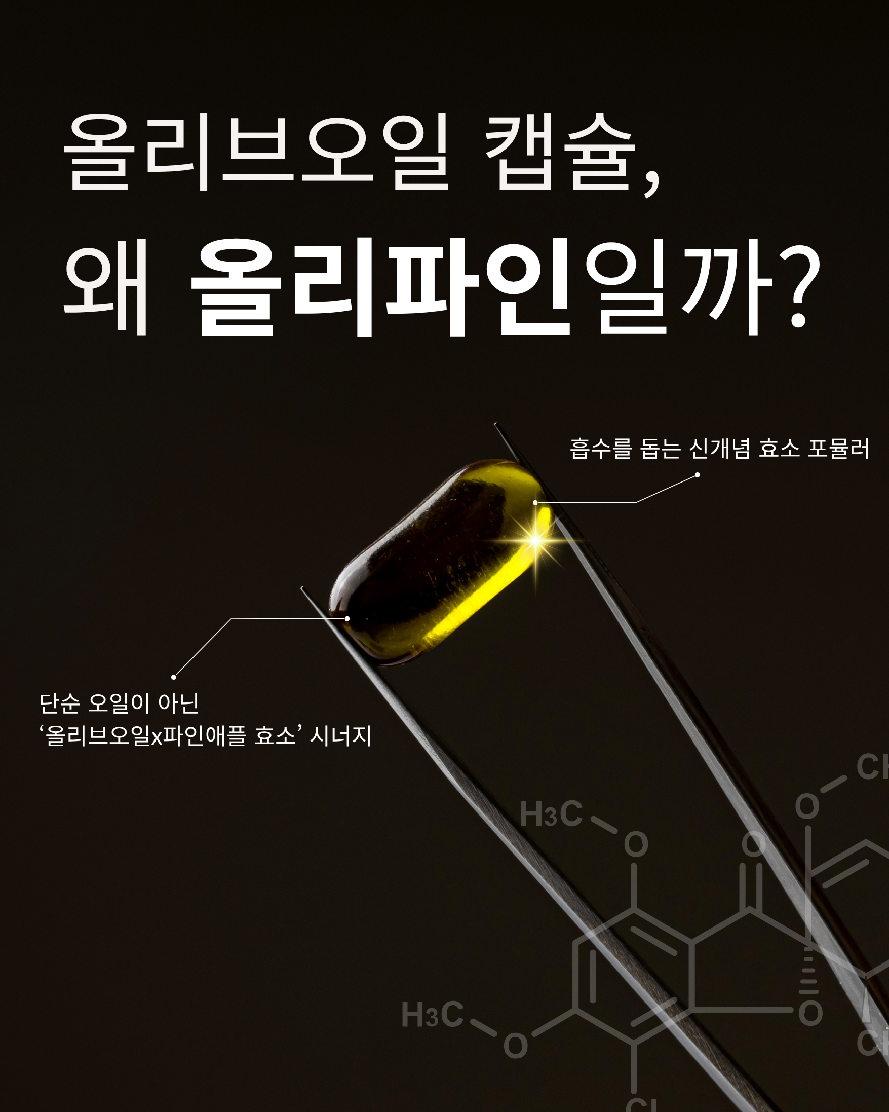 - 올리파인은 100% 스페인산 초저산도 엑스트라버진 올리브오일에 파인애플에서 추출분말을 결합해, ‘유효흡수율’을 설계한 액체황금 캡슐입니다. 단순히 좋은 원료를 넣는 것을 넘어, 그 성분이 인체에 얼마나 활용되는지를 과학적으로 접근했습니다. 먹고 끝나는 제품이 아니라, 몸에서 작동하는 건강캡슐이라는 새로운 기준을 제시합니다.