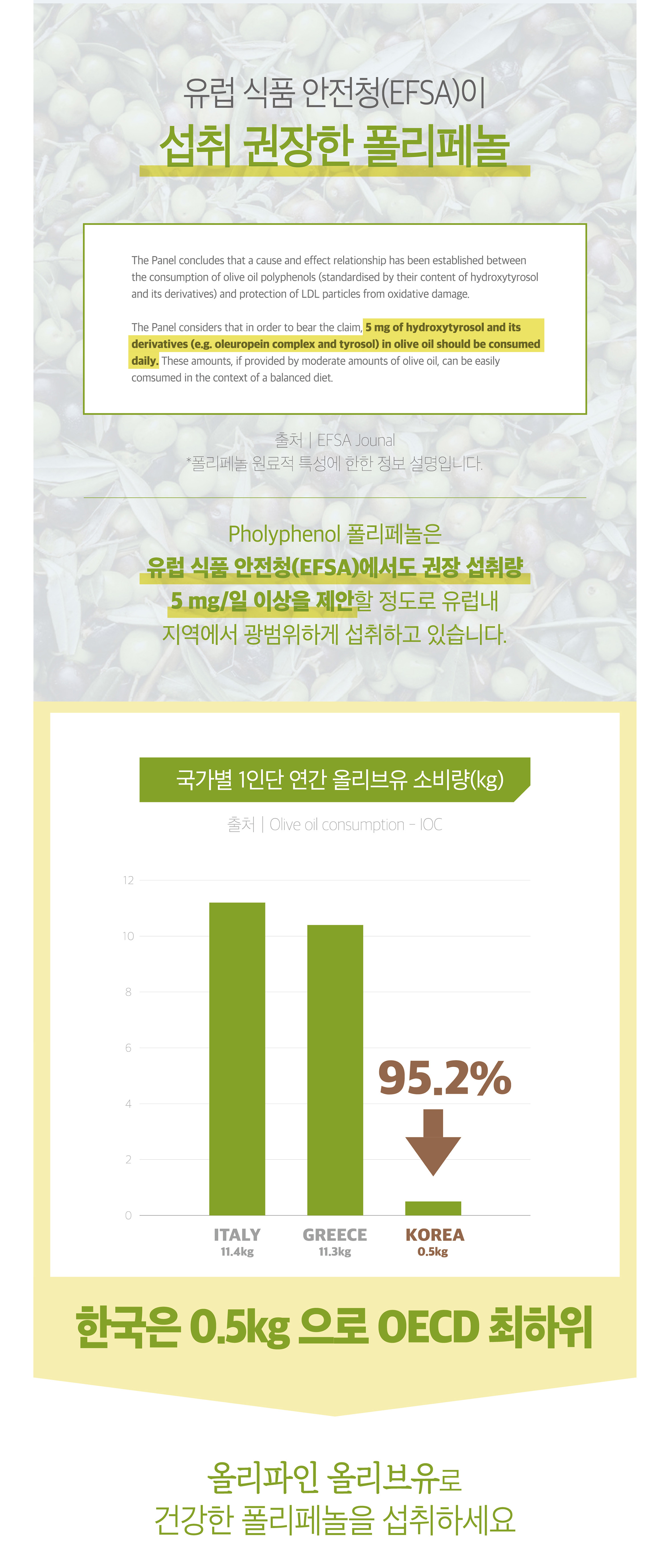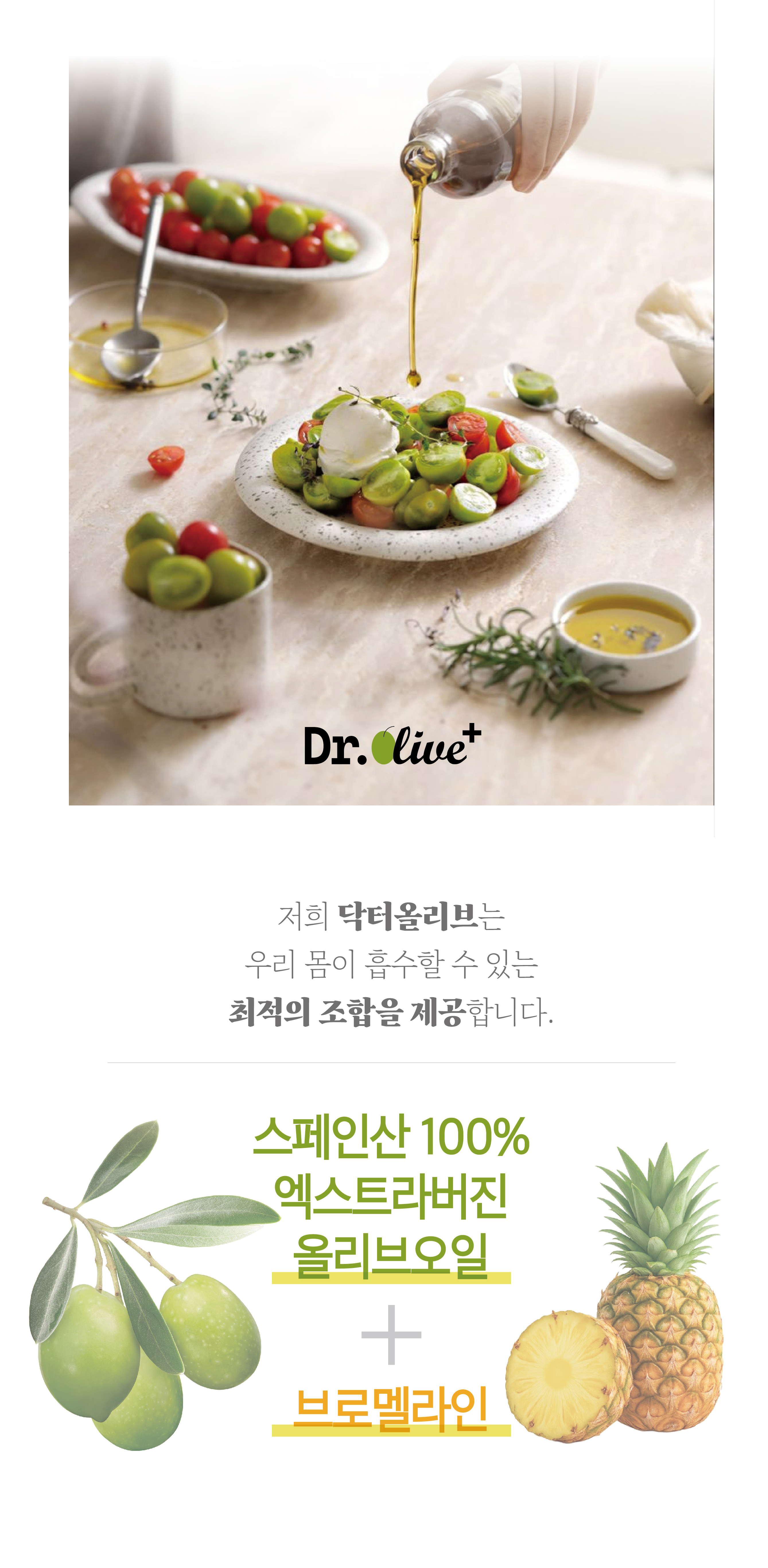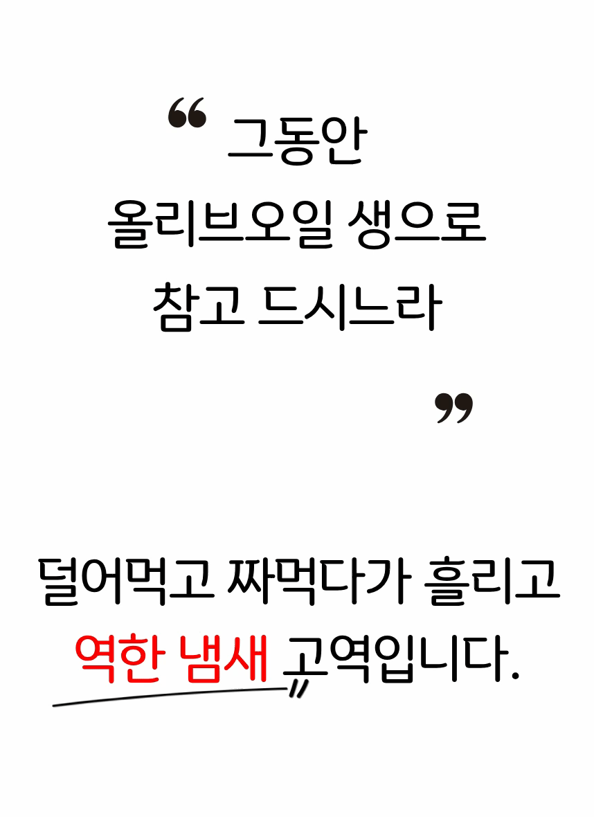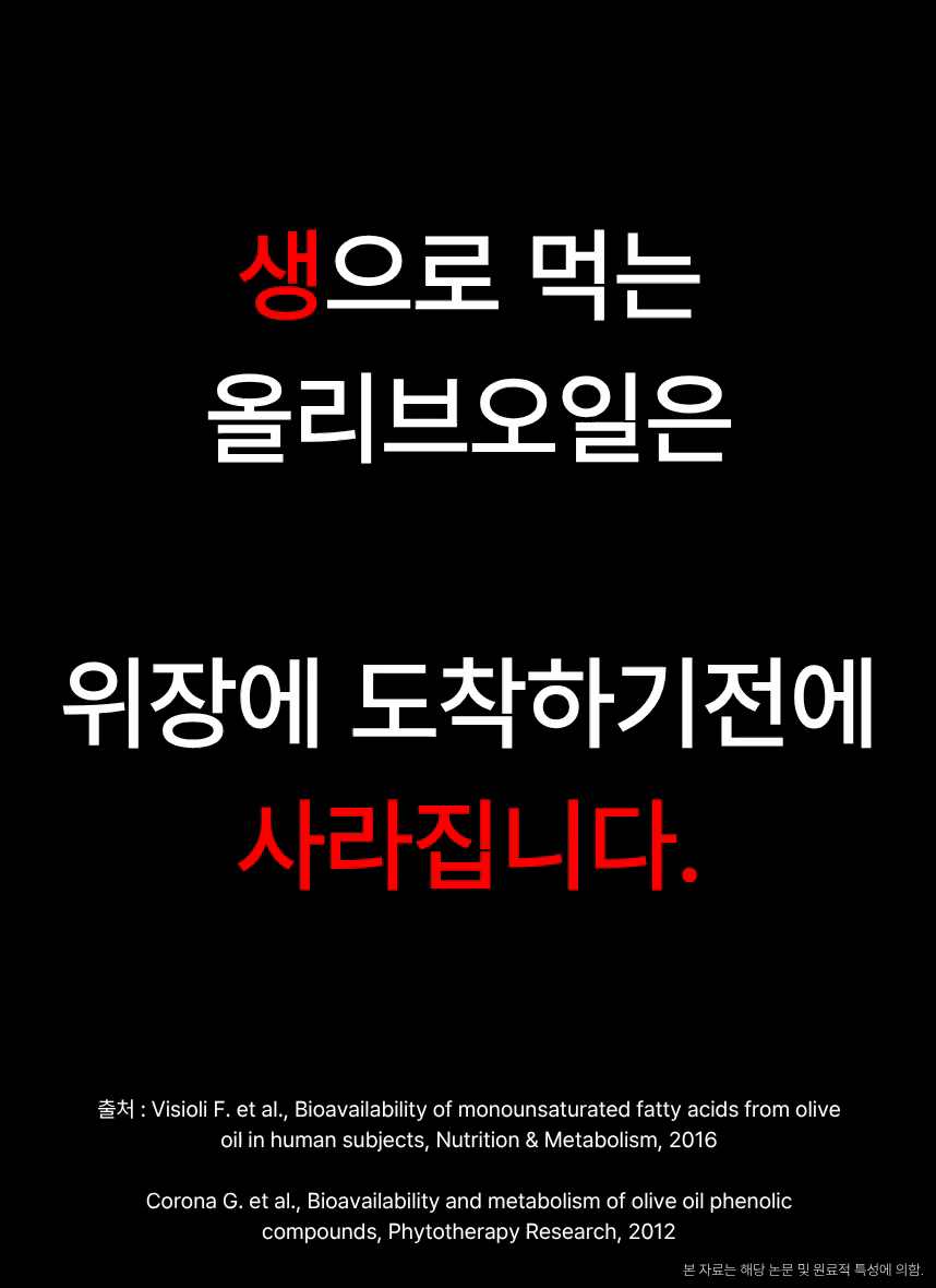 - 올리브오일은 좋은 줄 알아 먹었지만, 실제로 체내에 얼마나 흡수되는지 생각해 본 적이 없었습니다. 수많은 올리브오일 제품들이 효능을 말하지만, 대부분 기름 형태 그대로 체외로 배출된다는 사실을 알게 되었고 충격을 받았습니다. ‘먹는 것보다 흡수되는 것이 중요하다’는 진실을 알리고, 정말 몸에 쓰이는 올리브오일을 만들기 위해 이 프로젝트를 시작하게 되었습니다.