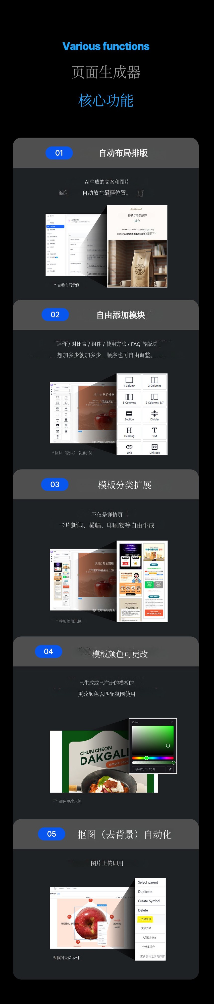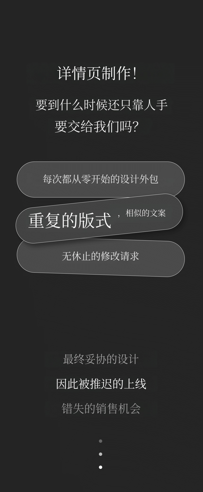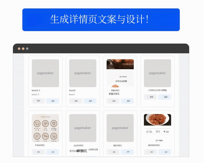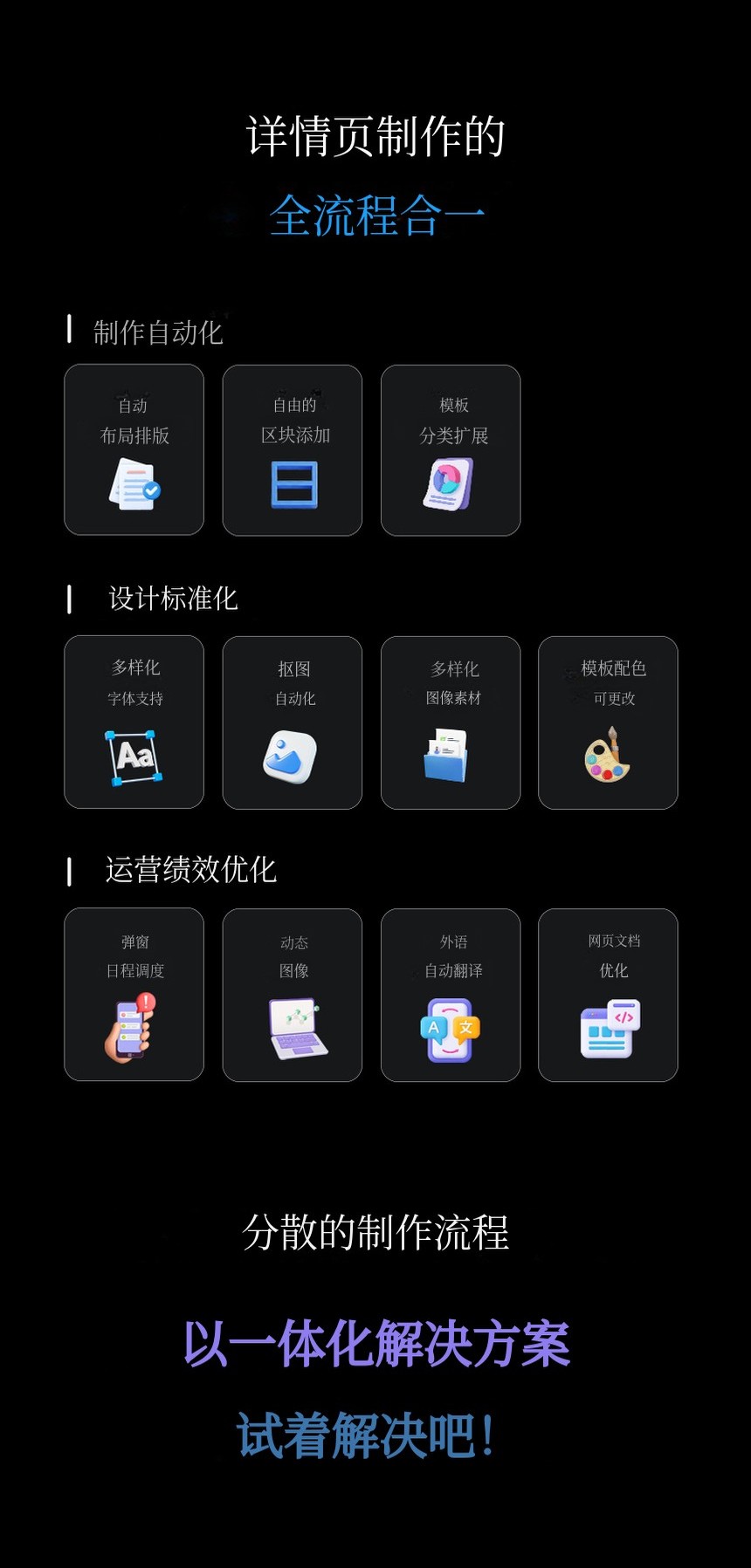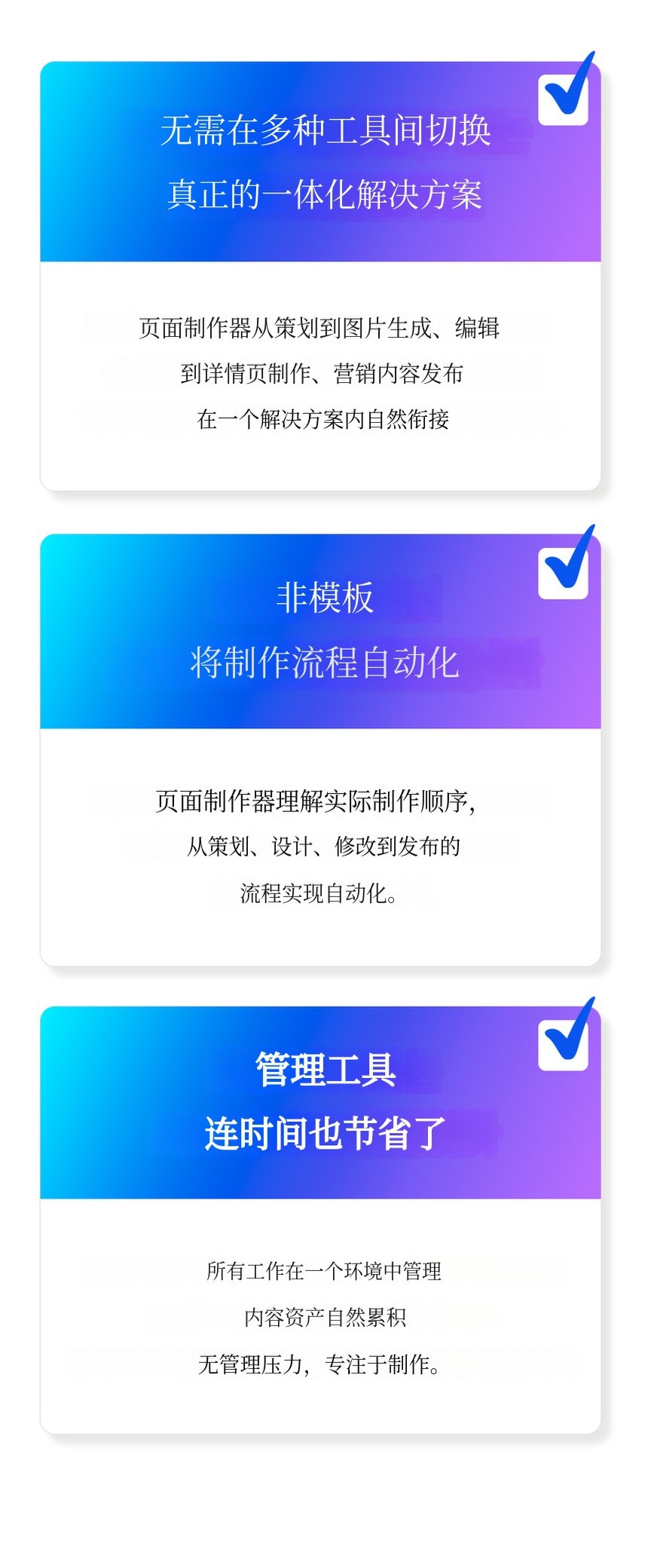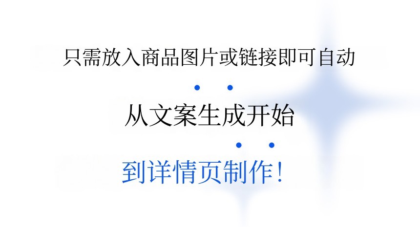 “需要优质的详情页,但每次都靠人工制作实在太耗时了” 为了解决问题,页面制作器 应运而生。只需放入链接或产品图片,就能从文案到详情页快速完成,我们将长期积累的制作标准和运营经验融入到产品中。