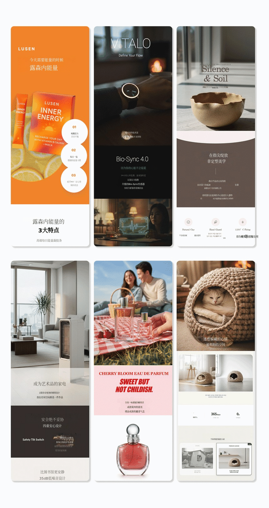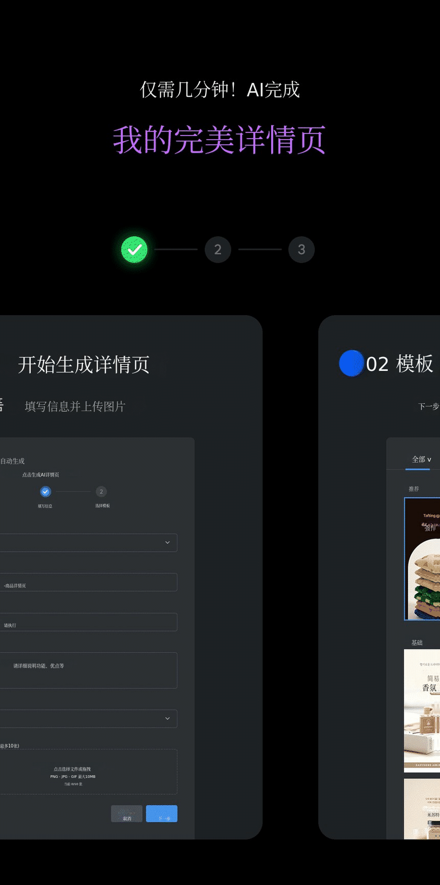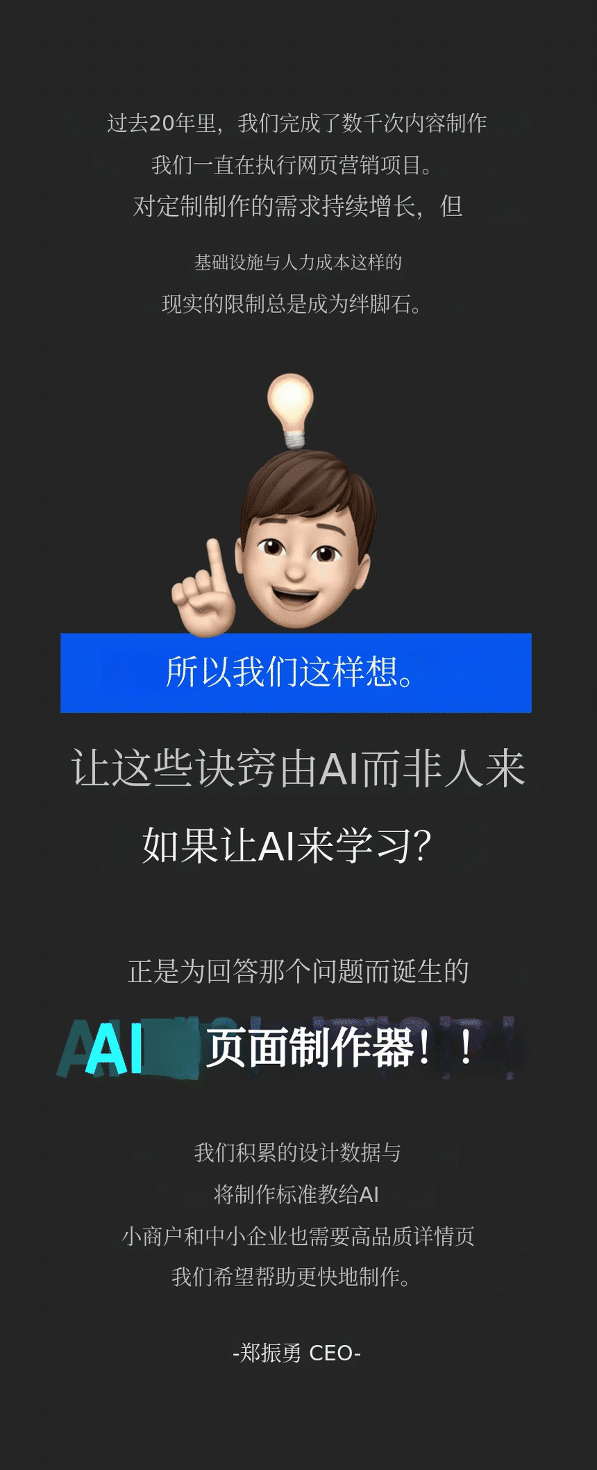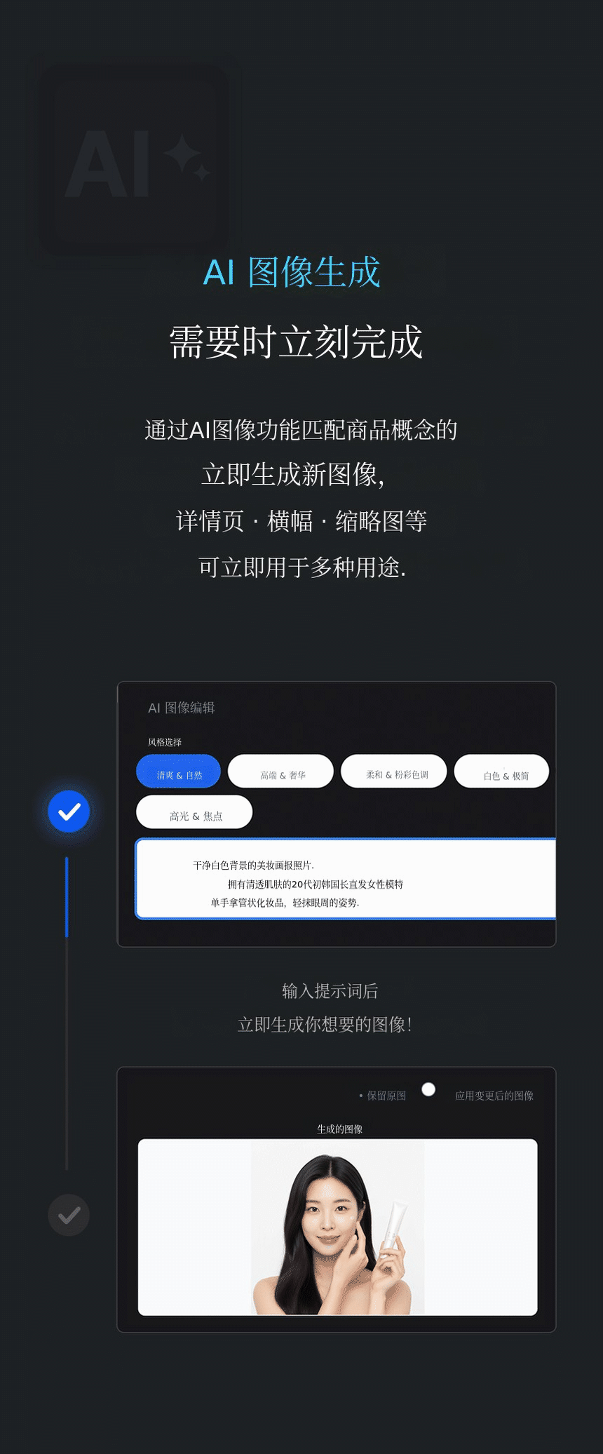 “需要优质的详情页,但每次都靠人工制作实在太耗时了” 为了解决问题,页面制作器 应运而生。只需放入链接或产品图片,就能从文案到详情页快速完成,我们将长期积累的制作标准和运营经验融入到产品中。