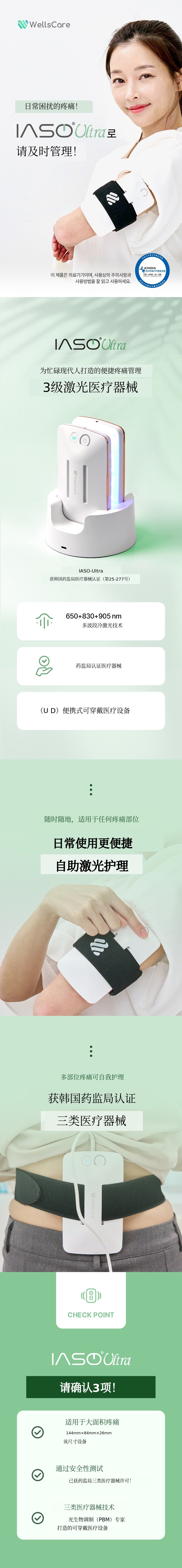(株)WellsCare是一家成立于2018年的光生物调制康复治疗专业医疗器械企业,通过将北美最新的康复治疗技术——冷激光技术应用于可穿戴冷激光自我疼痛治疗设备IASO,实现了商业化。公司以北美市场为中心开展业务,成为韩国医疗器械企业中首家入驻美国亚马逊、Best Buy、沃尔玛等平台并进行销售的企业。