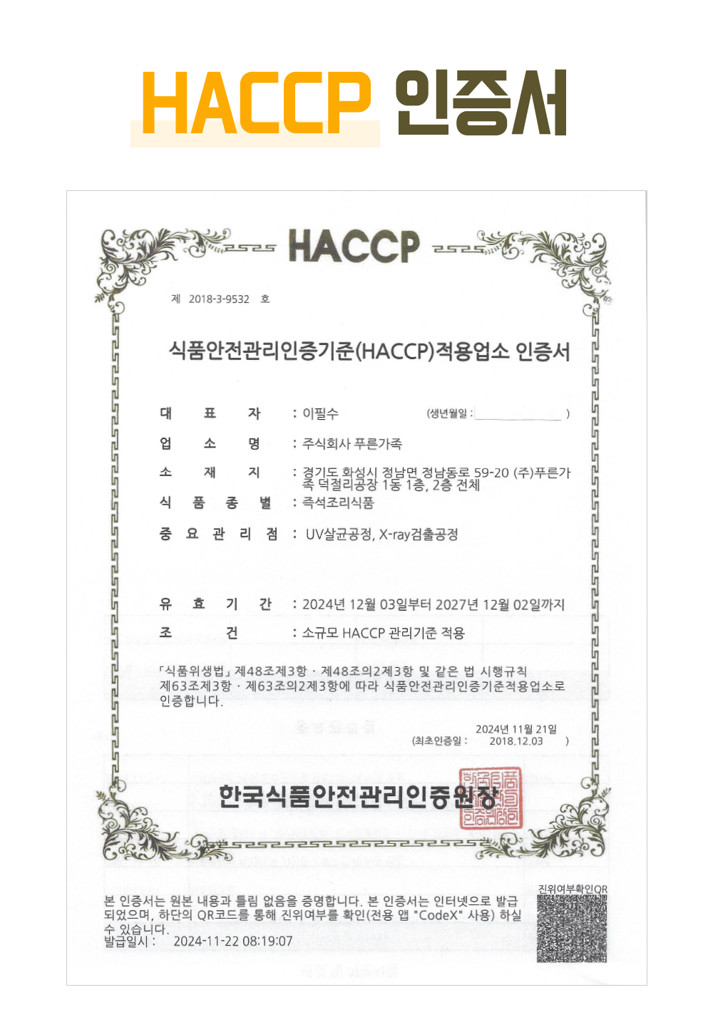 한국식품안전관리인증원(식약처 산하기관) 인증 / 식품유형별로 미생물, 화학적, 물리적 위해요소를 사전에 차단하는 공장 인증서