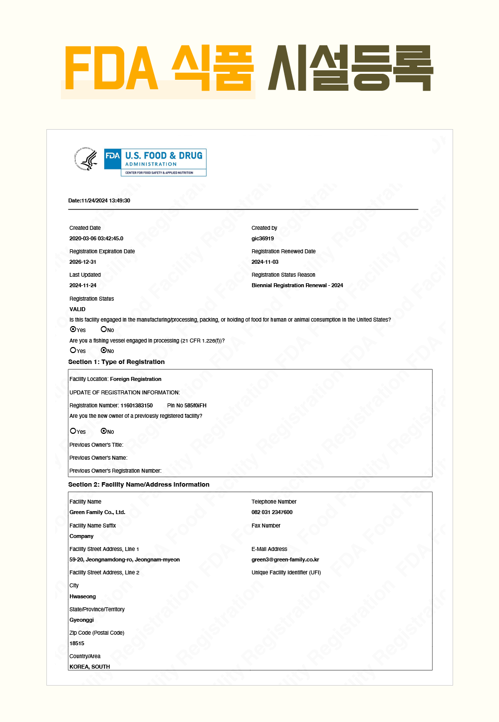 FDA 인증 / 미국 수출이 가능한 공장을 대상으로 인증받는 공장등록 인증서