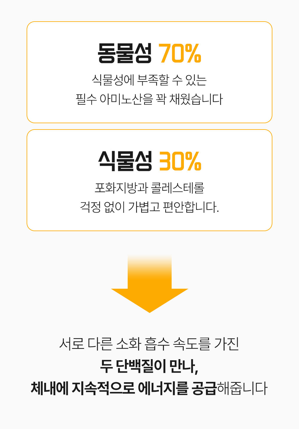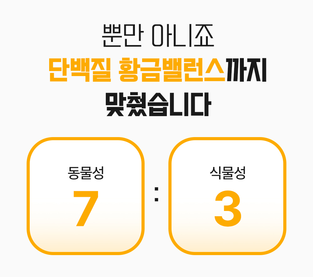 단백질 함량만 보고 고르셨나요? 어떤 단백질이 들어갔는지가 더 중요합니다.우리는 동물성 7 : 식물성 3 이라는 최적의 배합비를 찾아냈습니다.