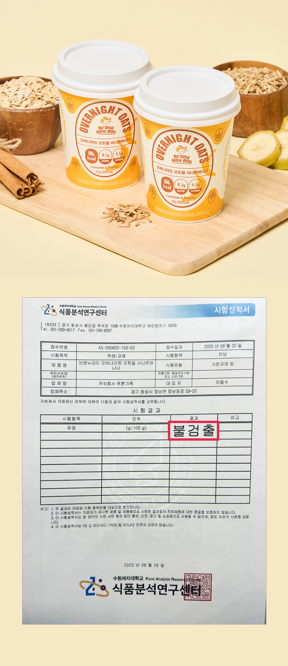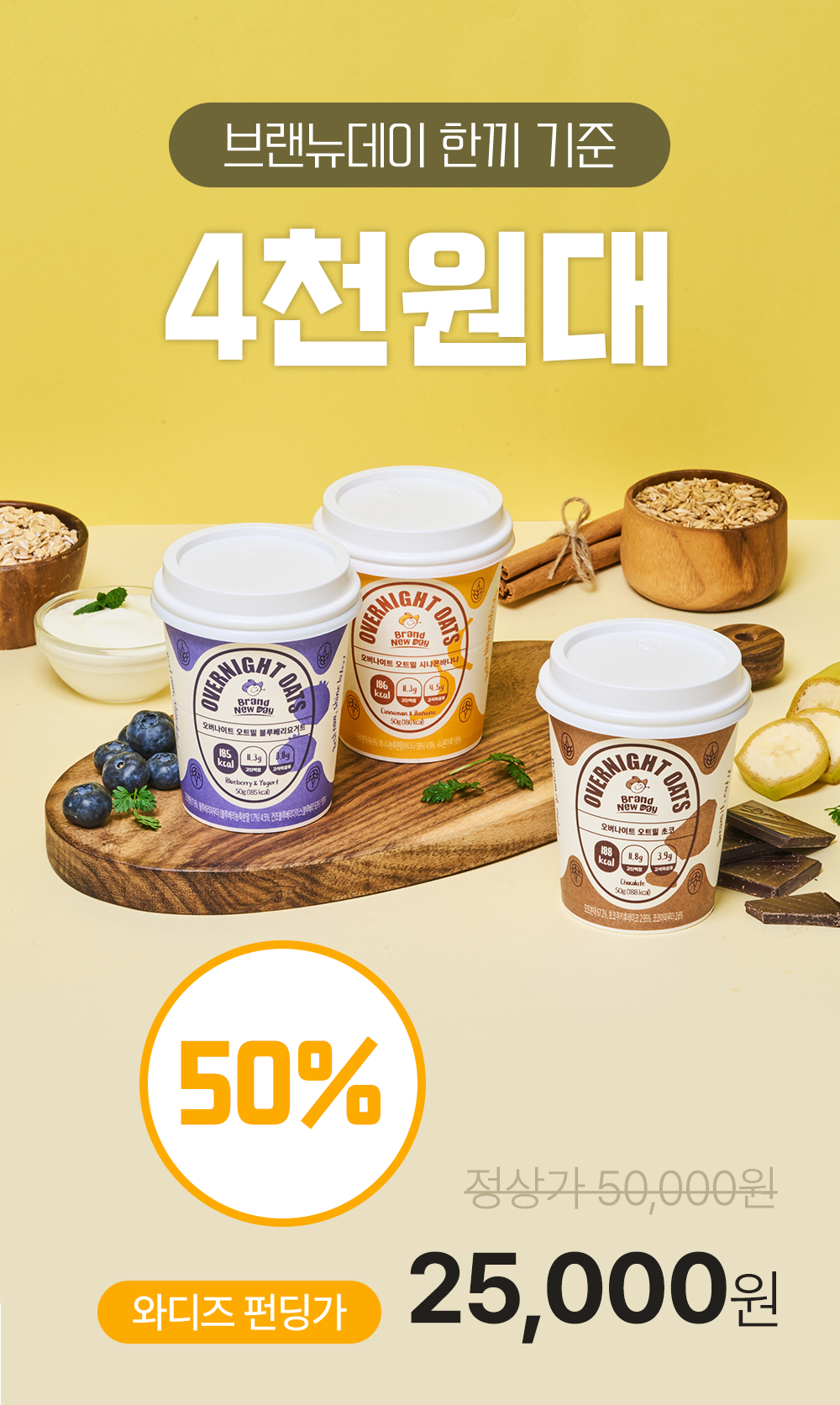 브랜뉴 데이 오버나이트 오트밀 제품은 총 중량 50g 중에 하루 권장량을 초과하지 않은 최적화된 오트밀 함량을 배합하여 더부룩함 없이 포만감을 유지합니다.