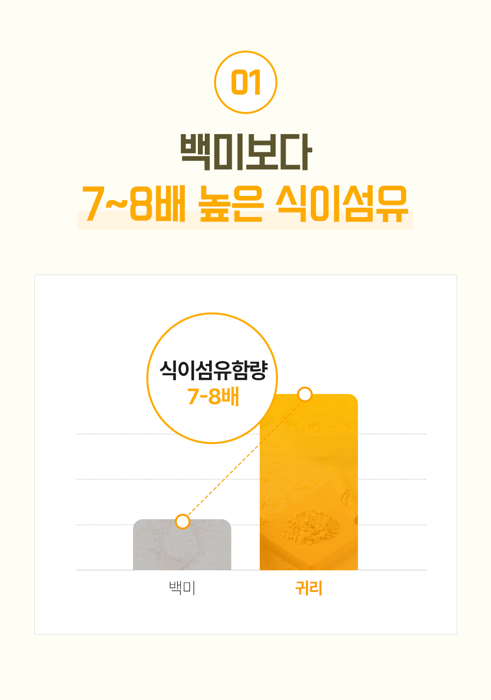 귀리는 백미 대비 약 7~8배 더 많은 식이섬유를 함유하고 있습니다. 같은 양을 먹어도 포만감이 훨씬 오래가고, 혈당이 급격히 오르는 것을 막아줍니다.