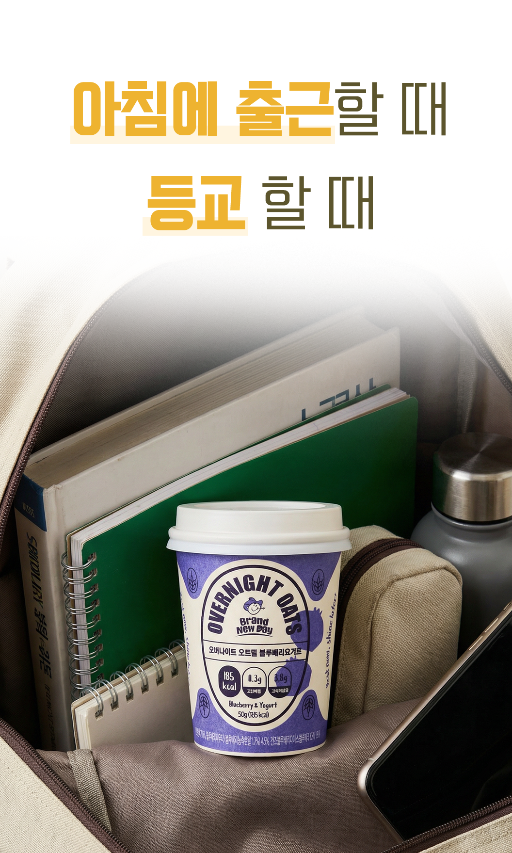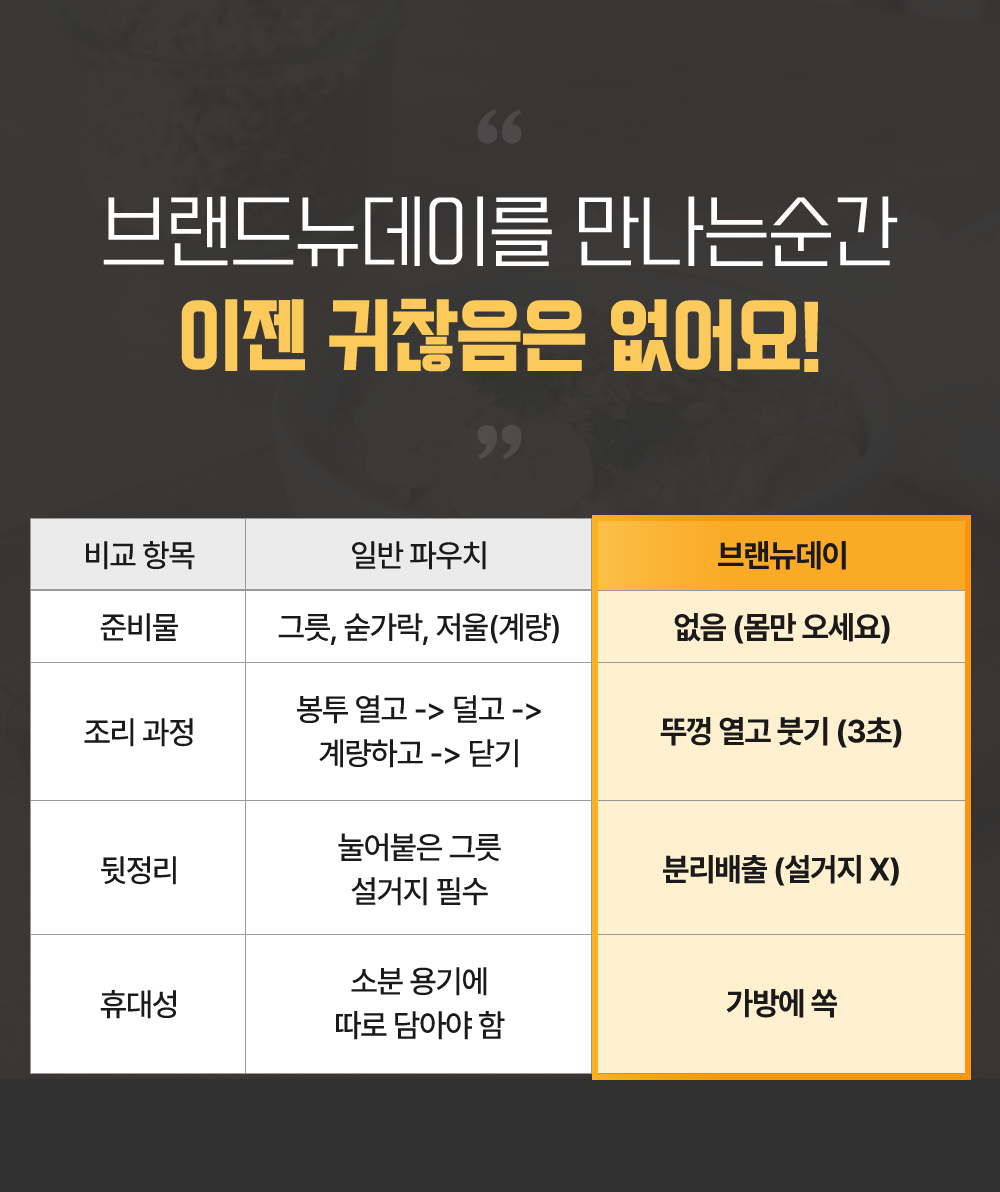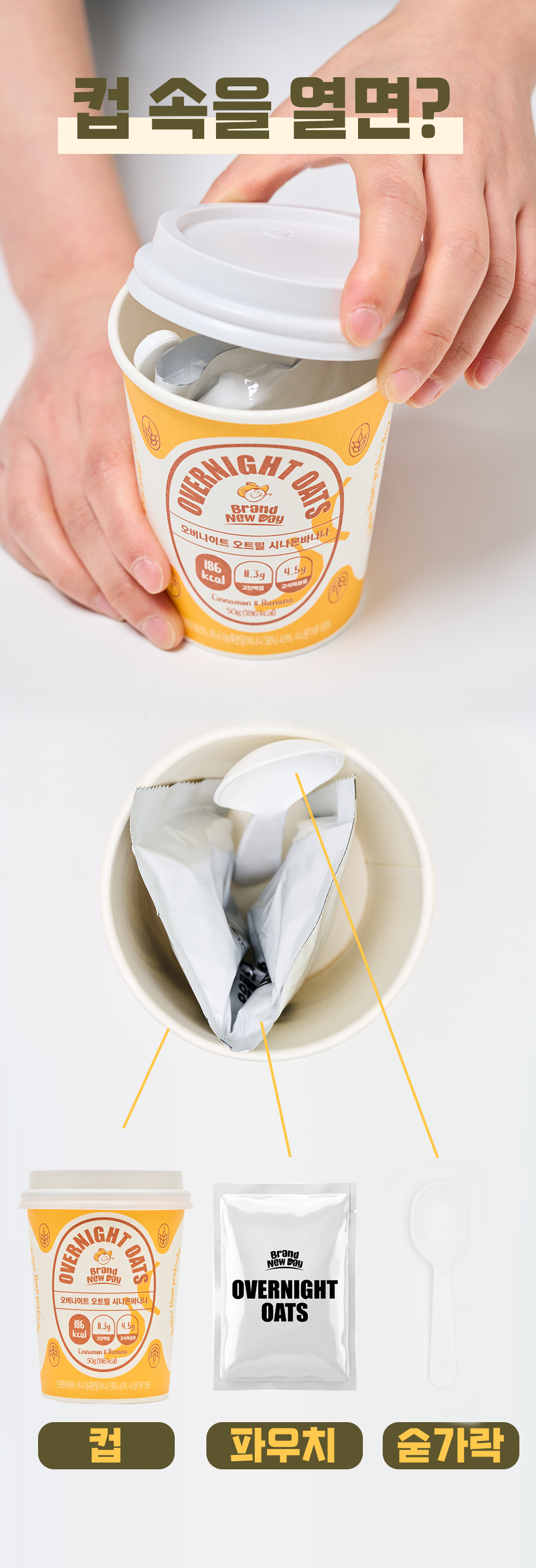 그릇? 스푼? 필요 없습니다. 컵 하나에 모든 걸 담았습니다.냉장고에서 꺼내 다 드시고 분리배출만 하세요. 당신의 아침 10분을 아껴드립니다.